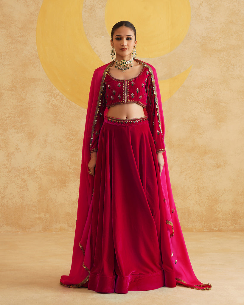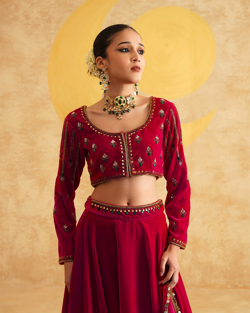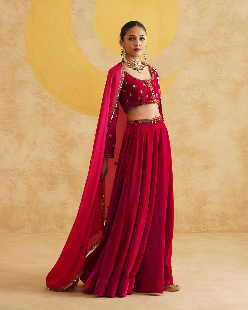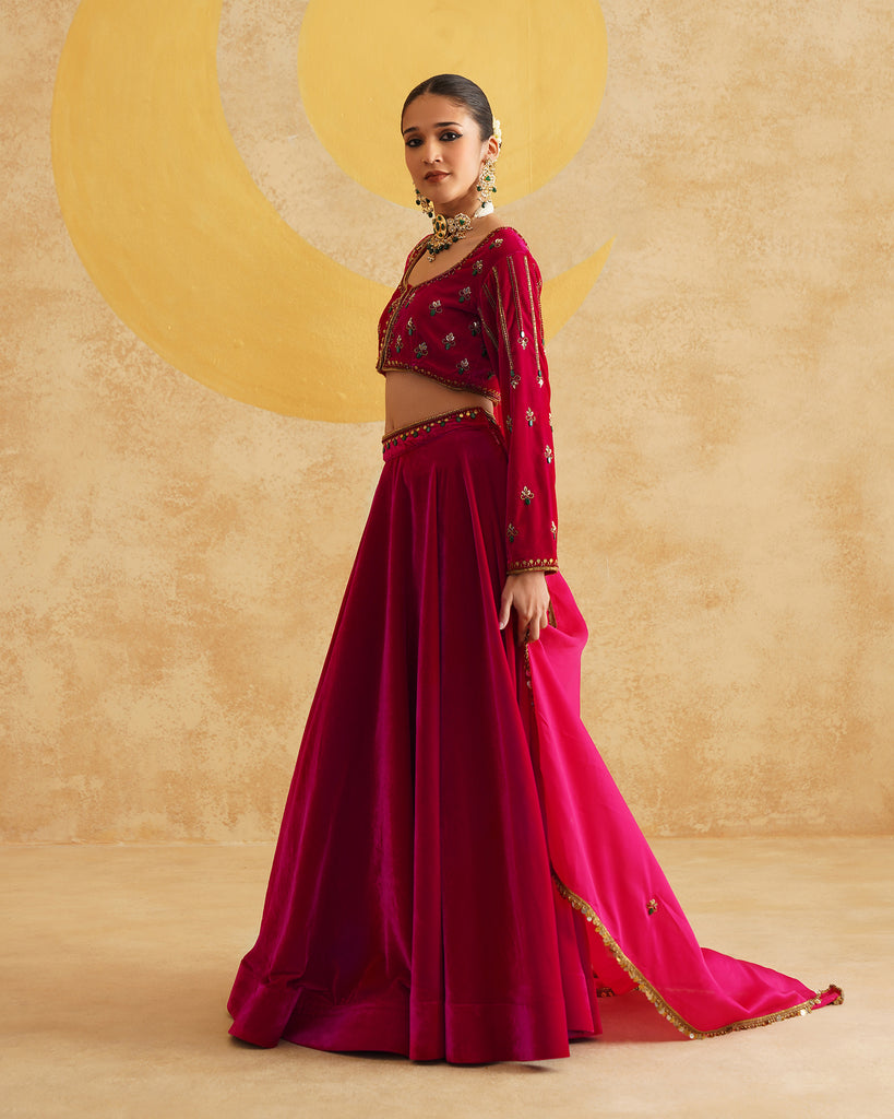 Magenta Pink Velvet Hand Embroidered Lehnga Set