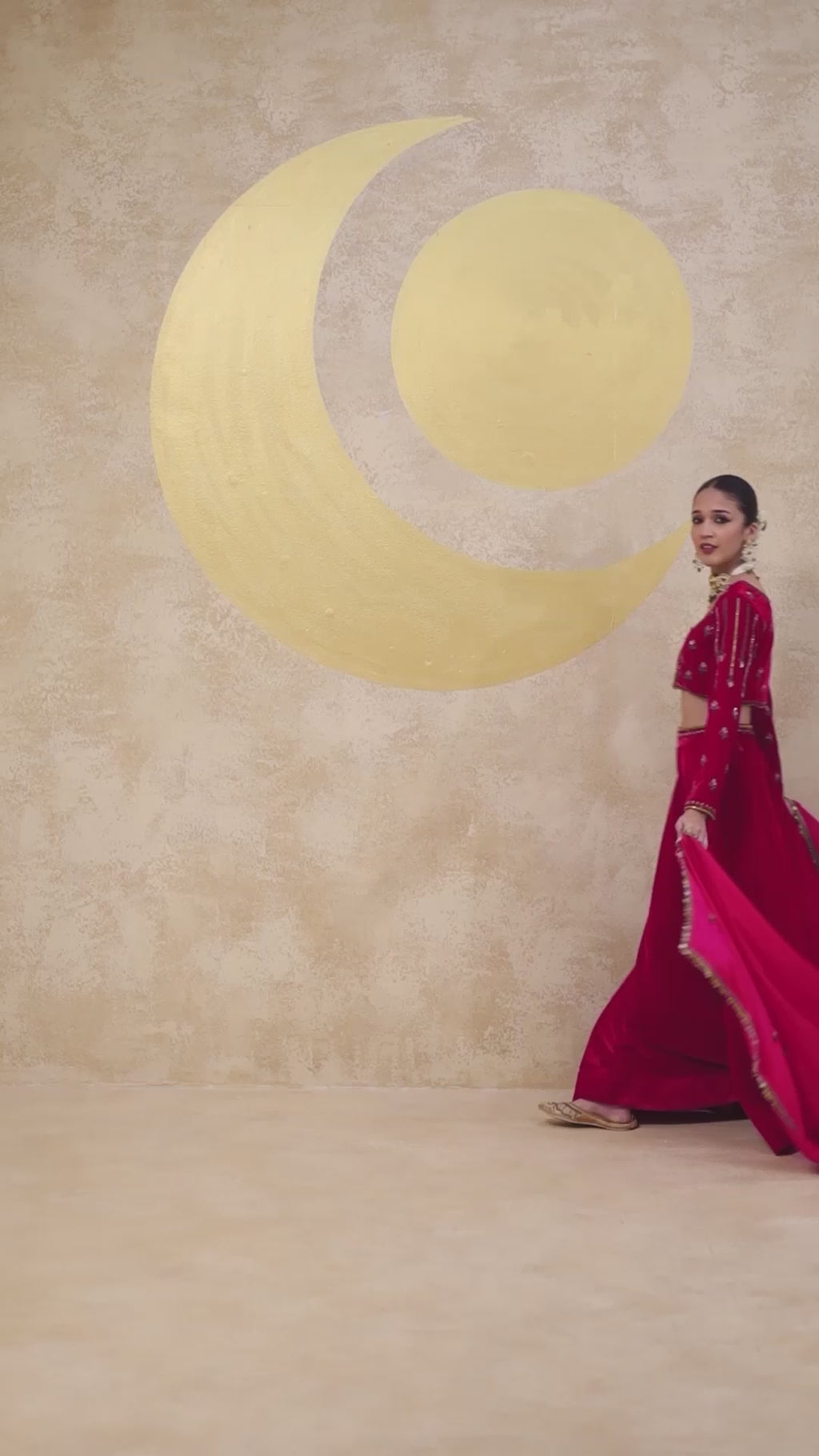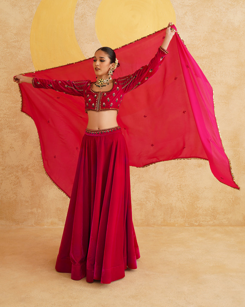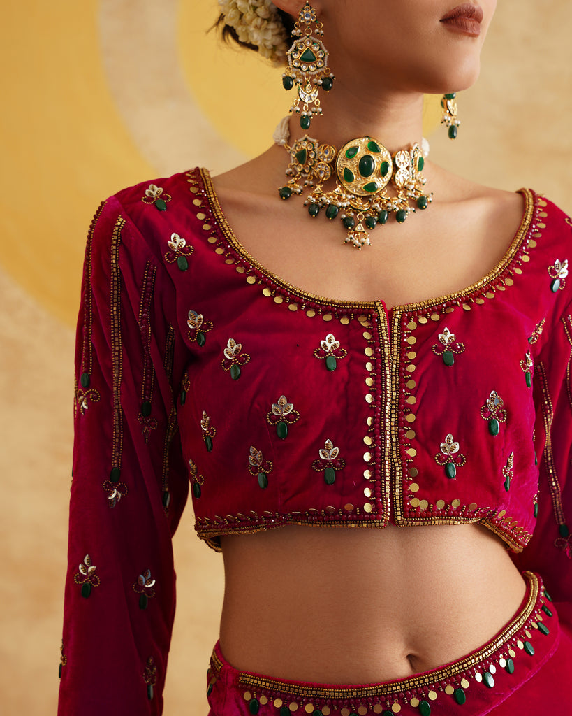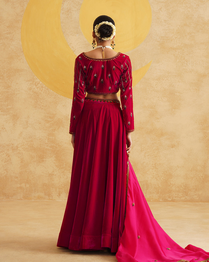 Magenta Pink Velvet Hand Embroidered Lehnga Set