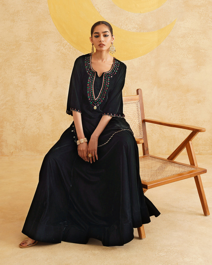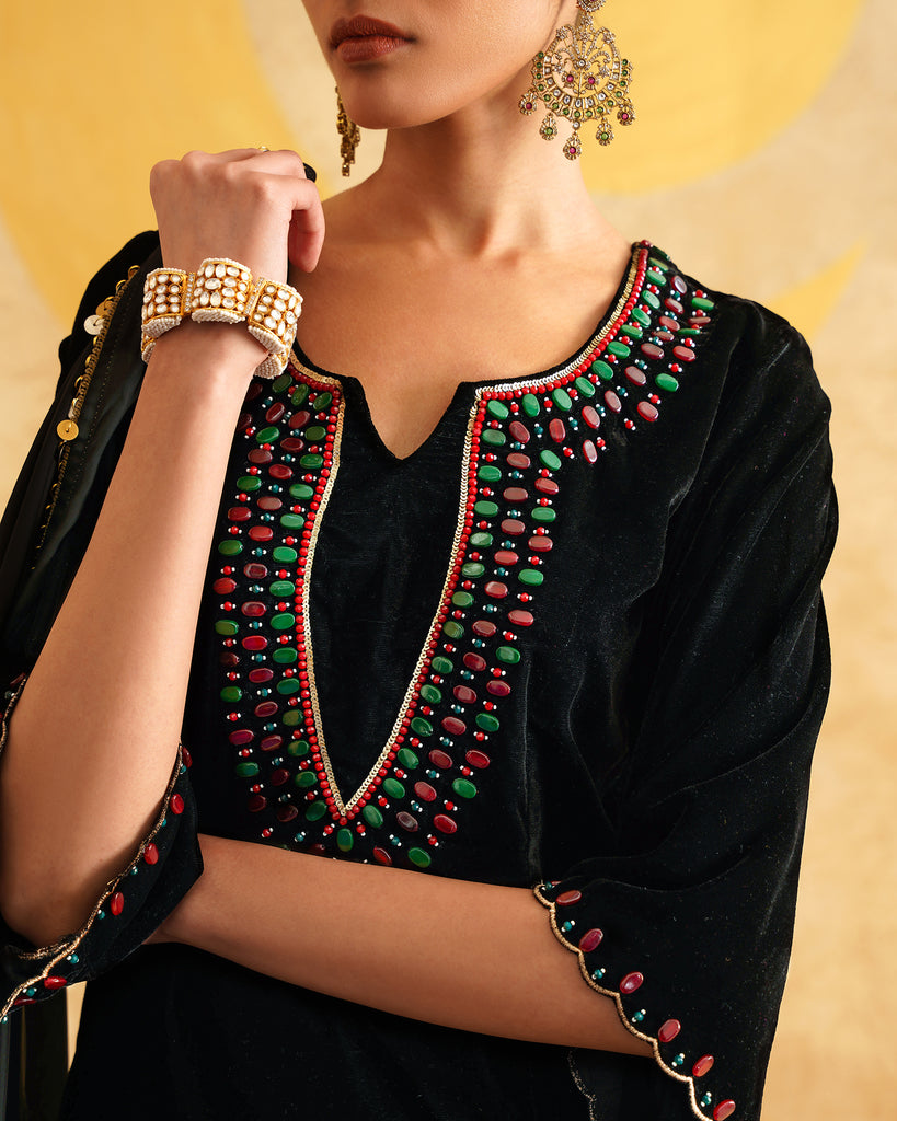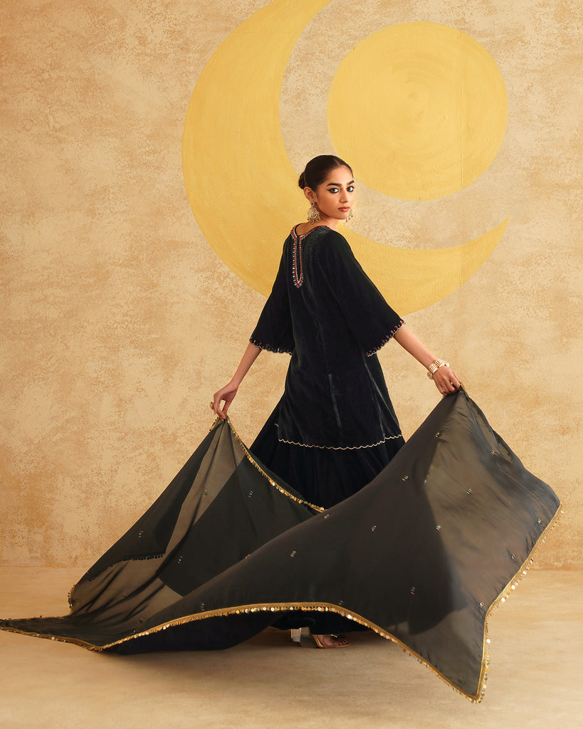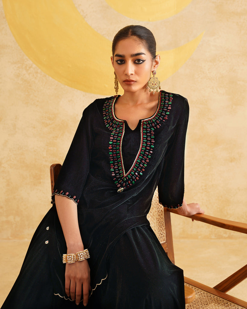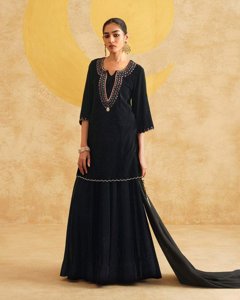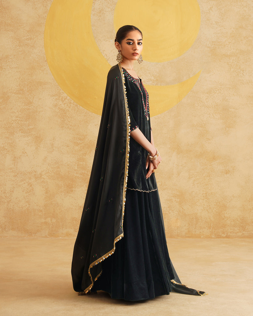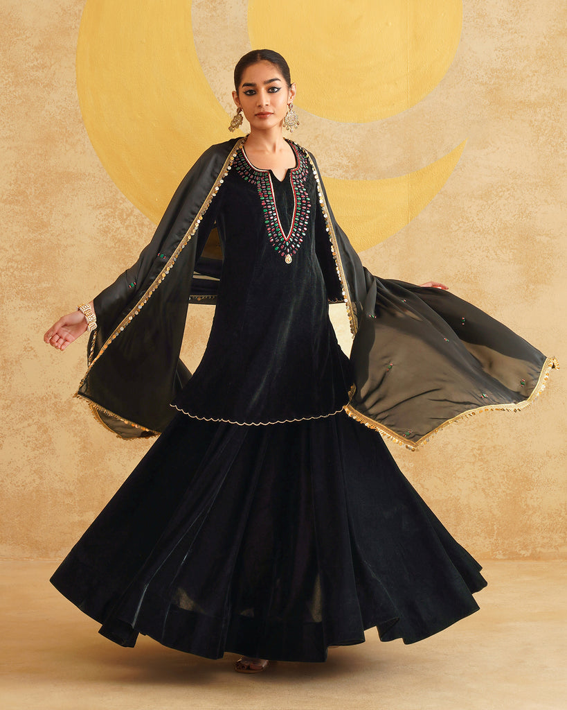 Black Velvet Hand Embroidered Velvet Kurta And Dupatta with Skirt Set