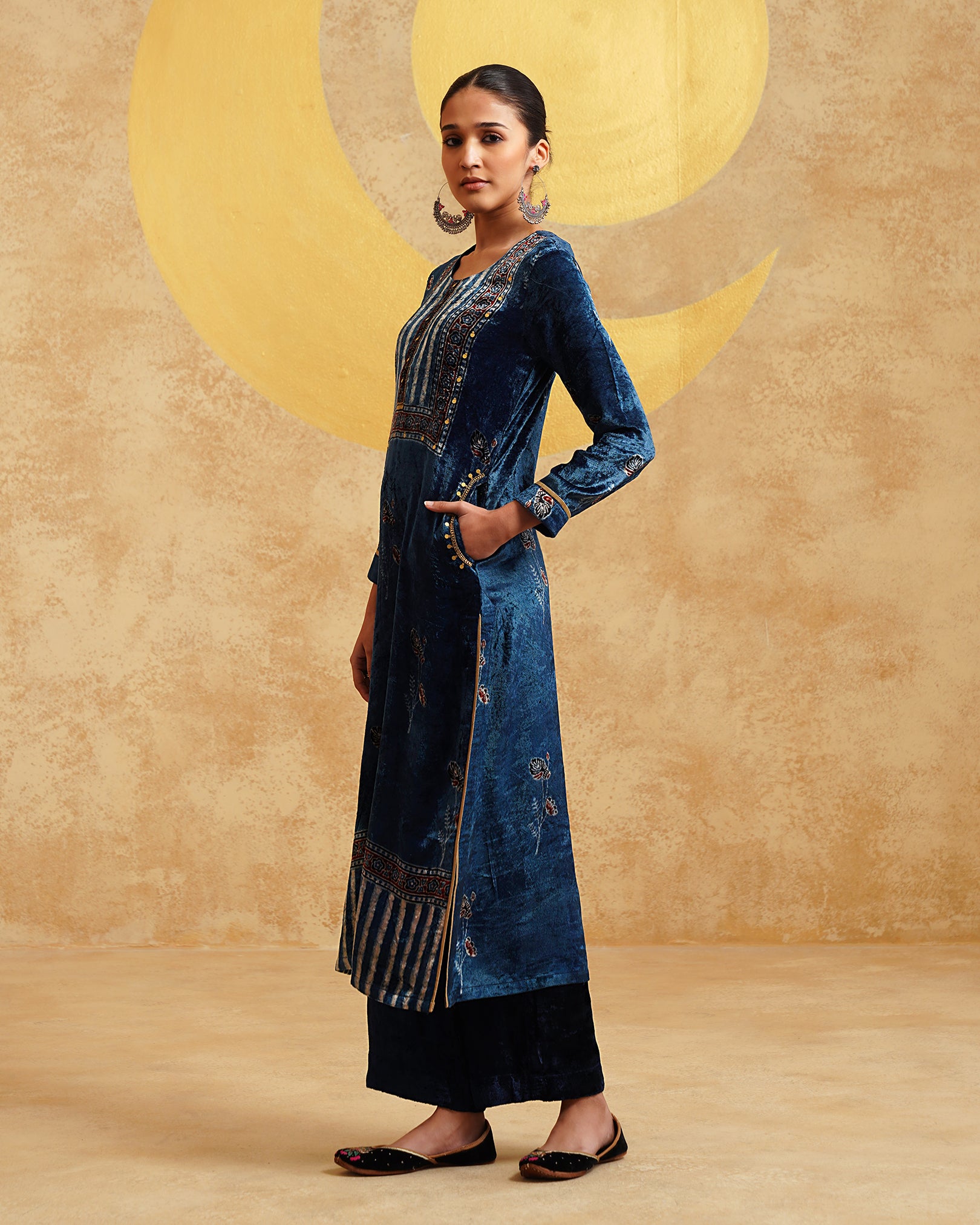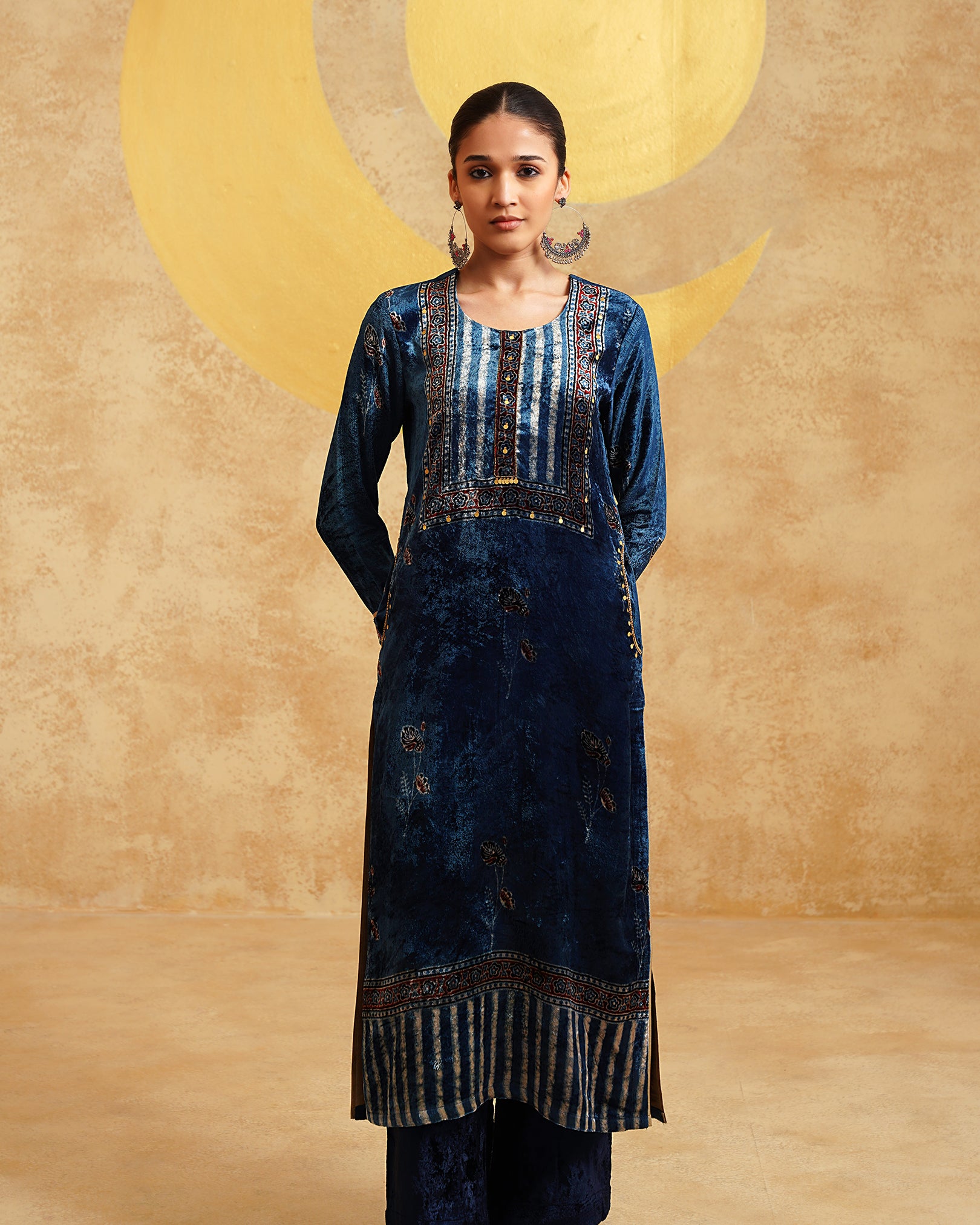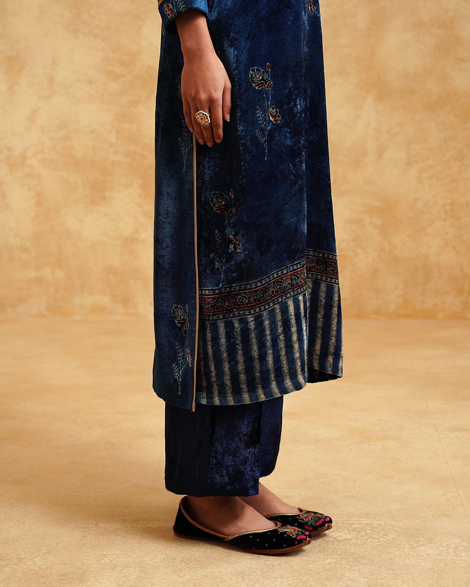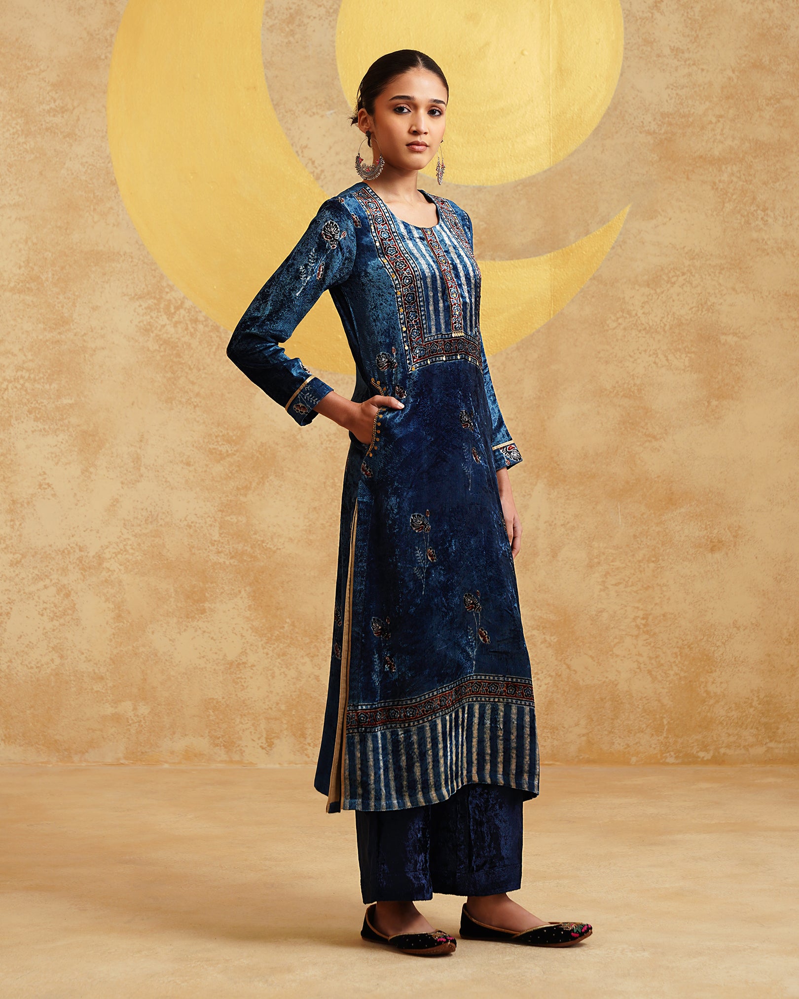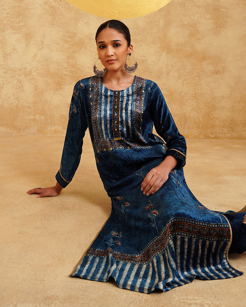 Blue Ajrakh Handblock Soft Velvet Kurta & Palazzo Set