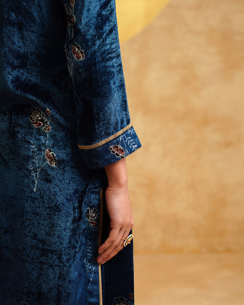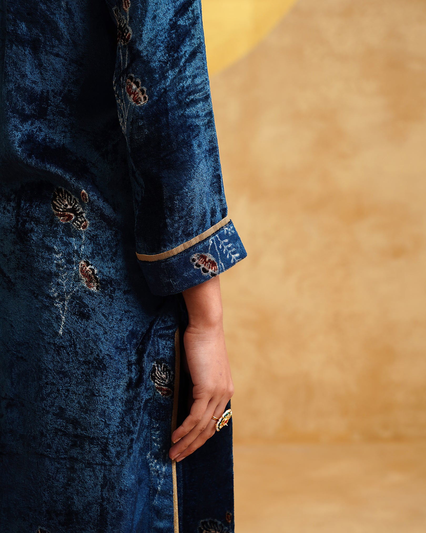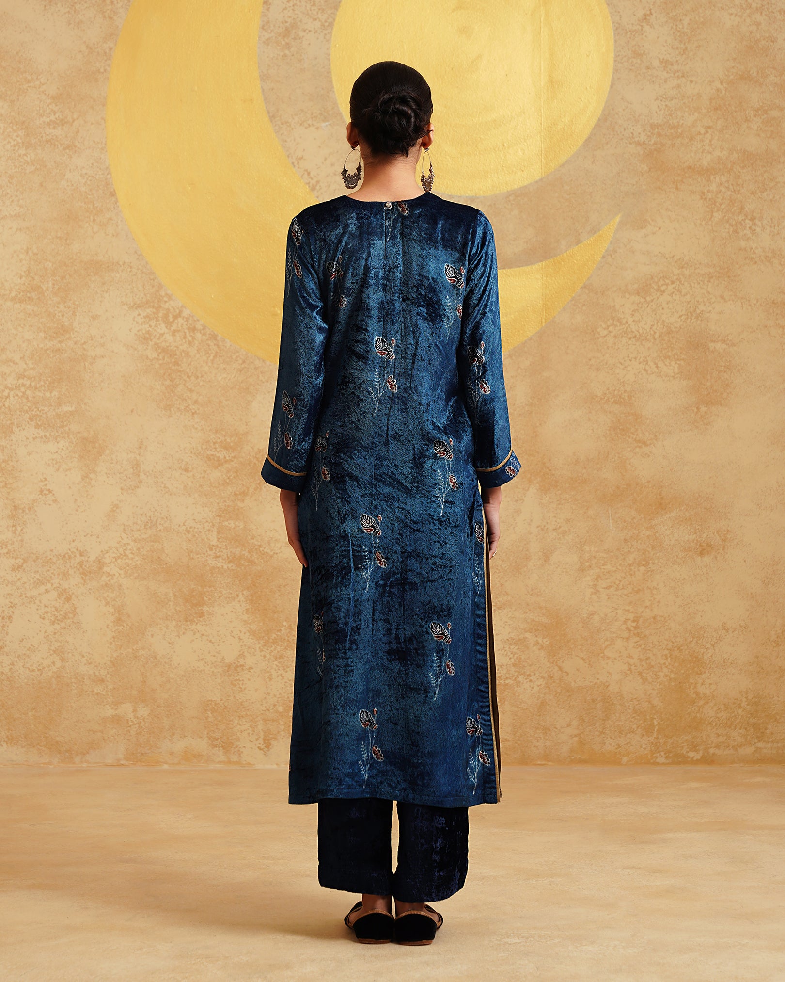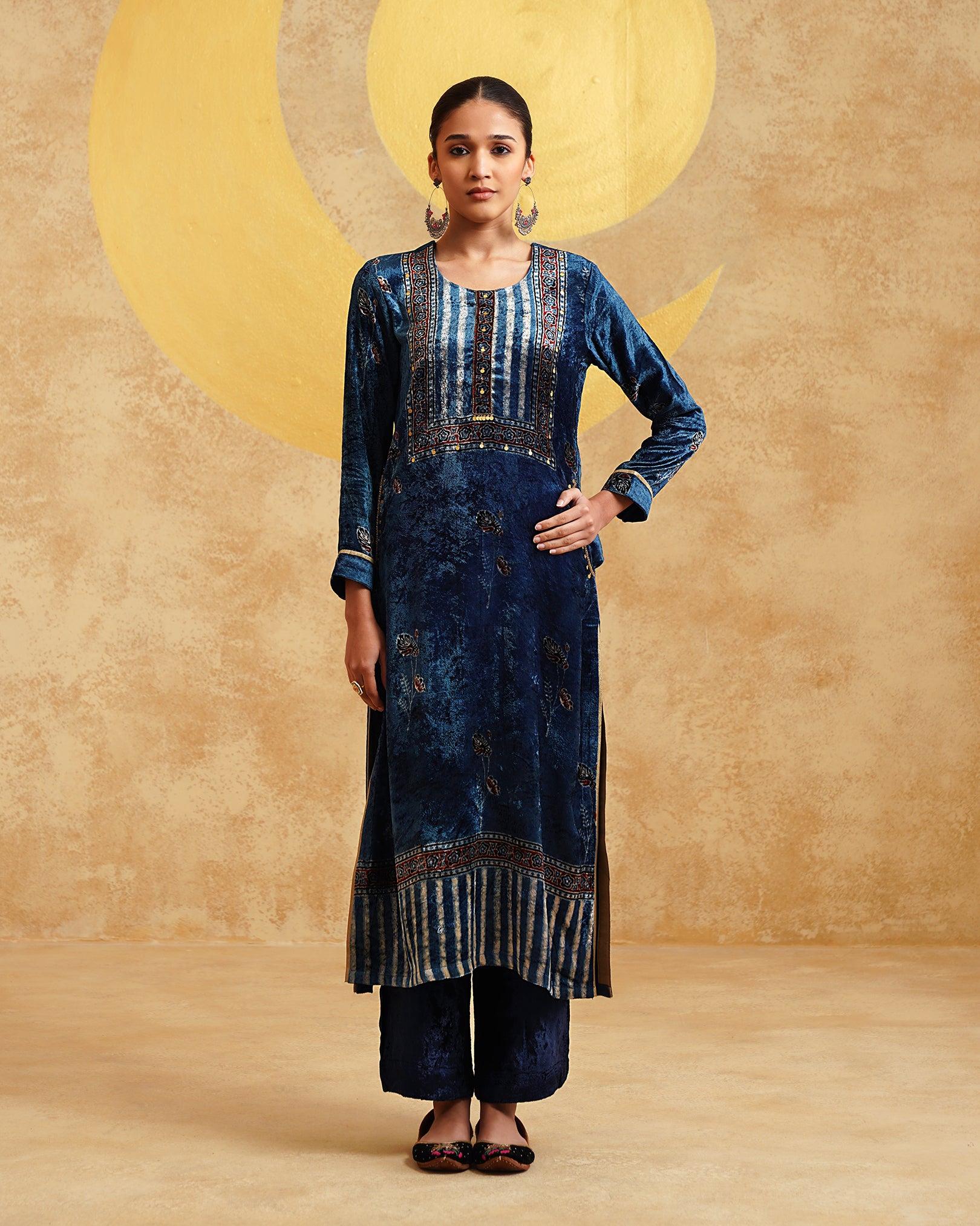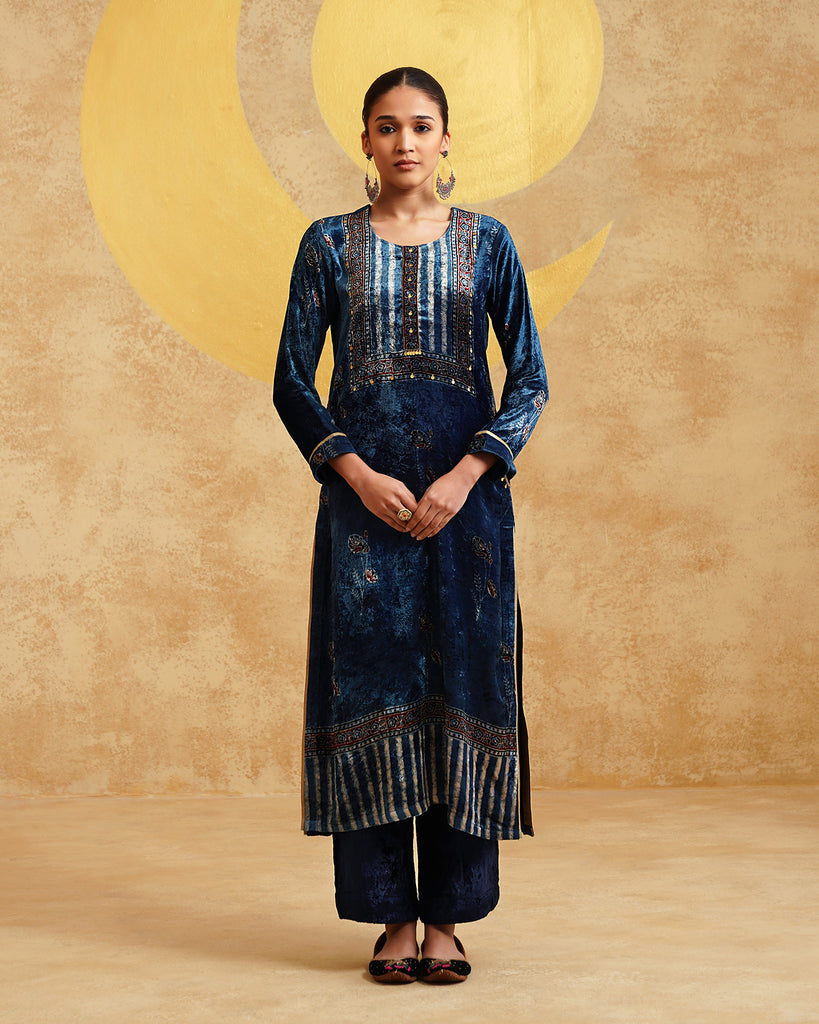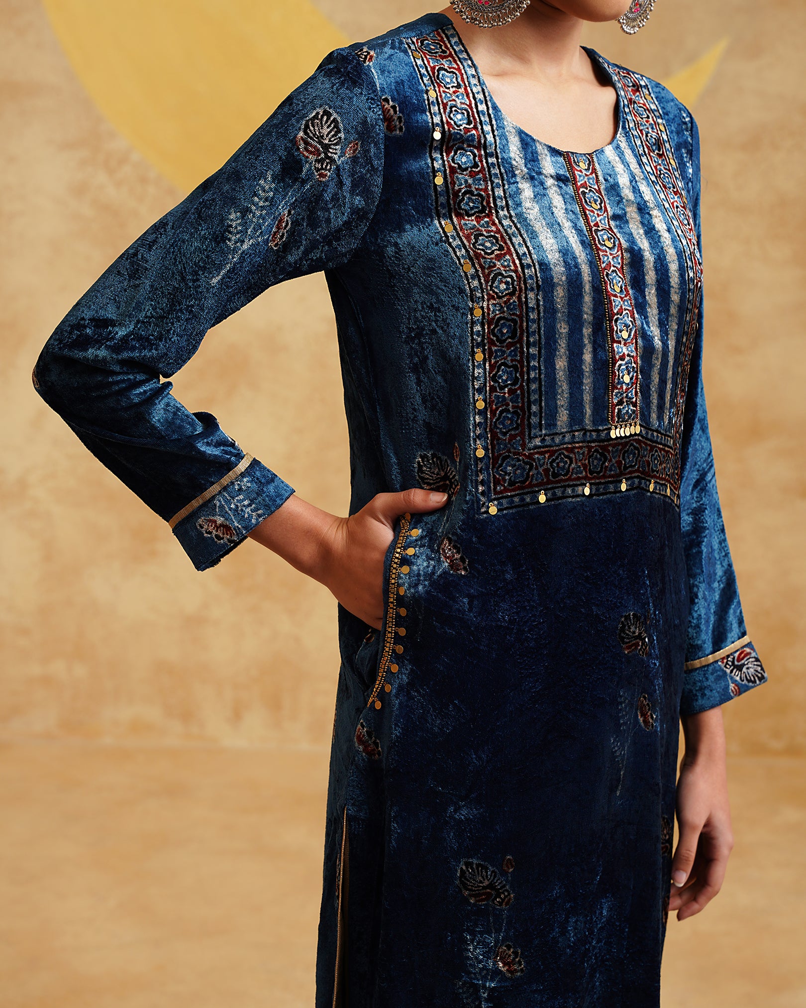 Blue Ajrakh Handblock Soft Velvet Kurta & Palazzo Set