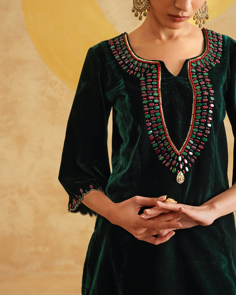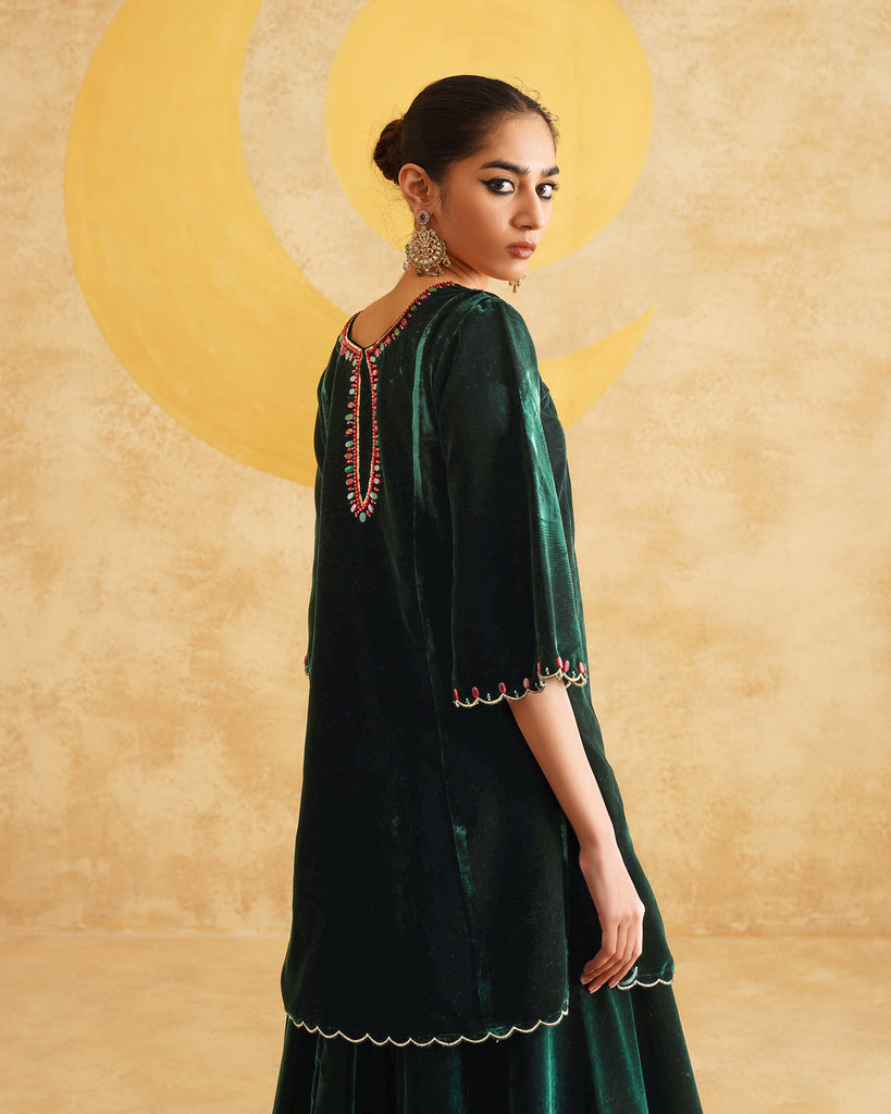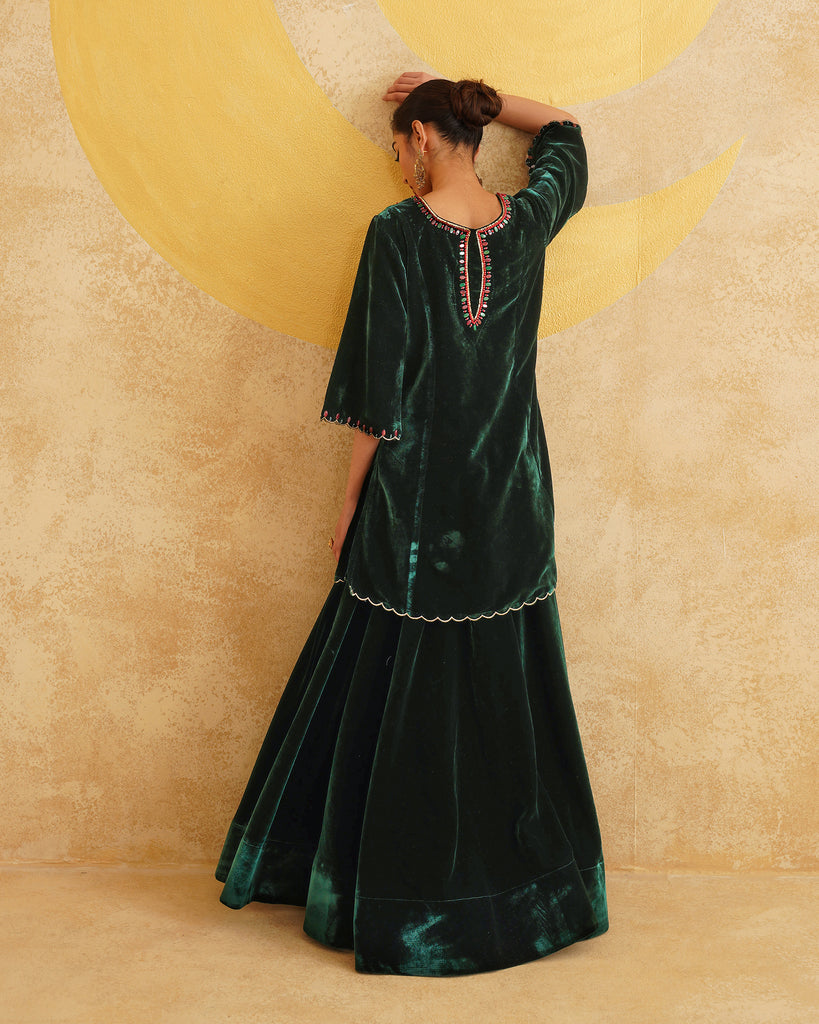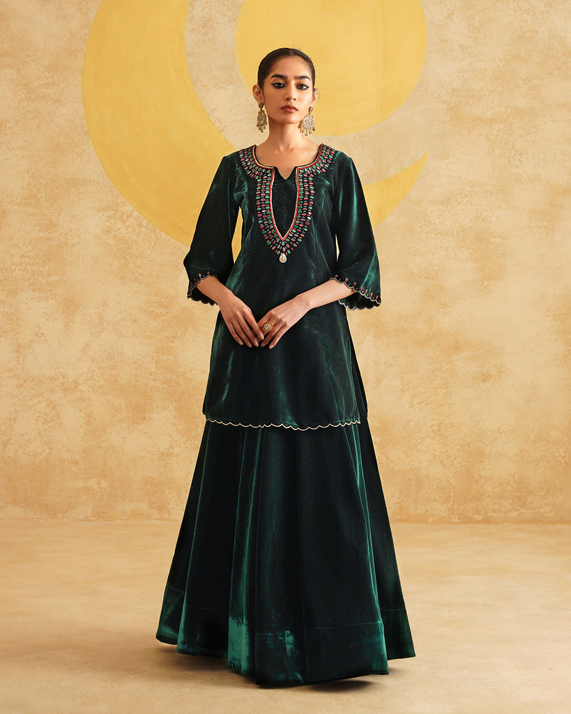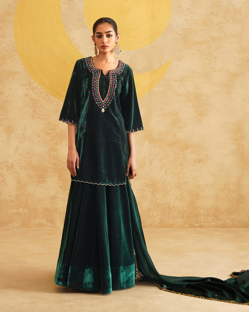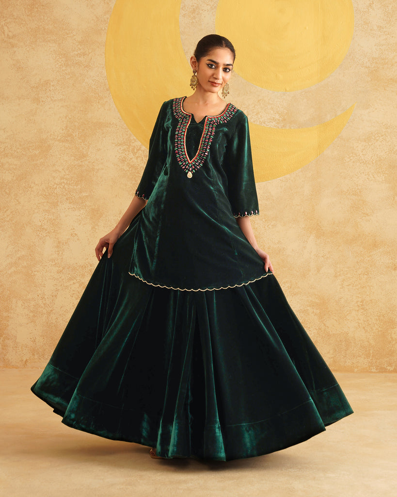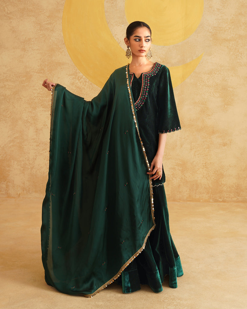 Bottle Green Hand Embroidered Velvet Kurta And Dupatta with Skirt Set