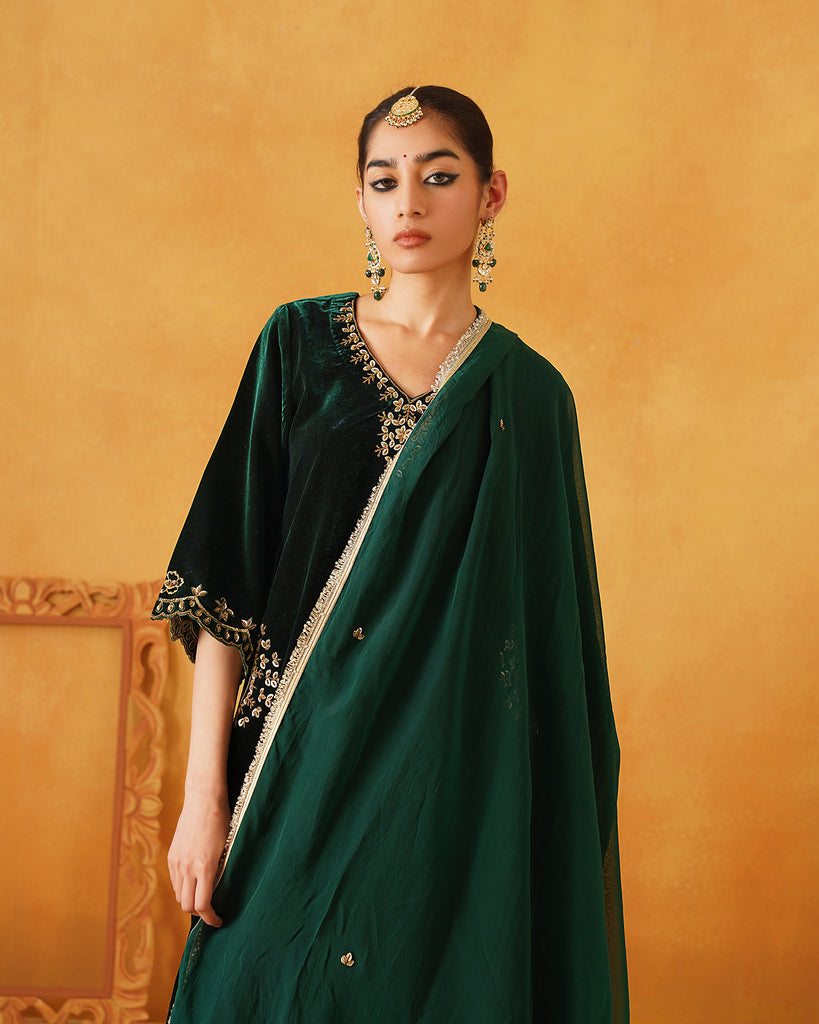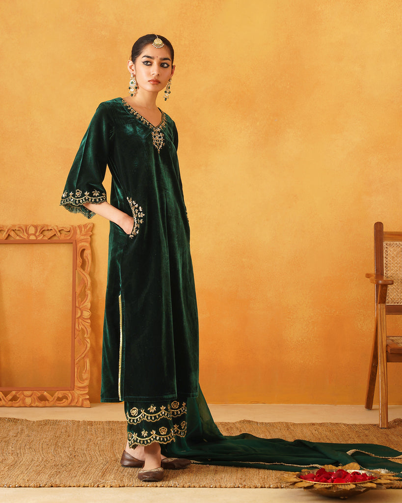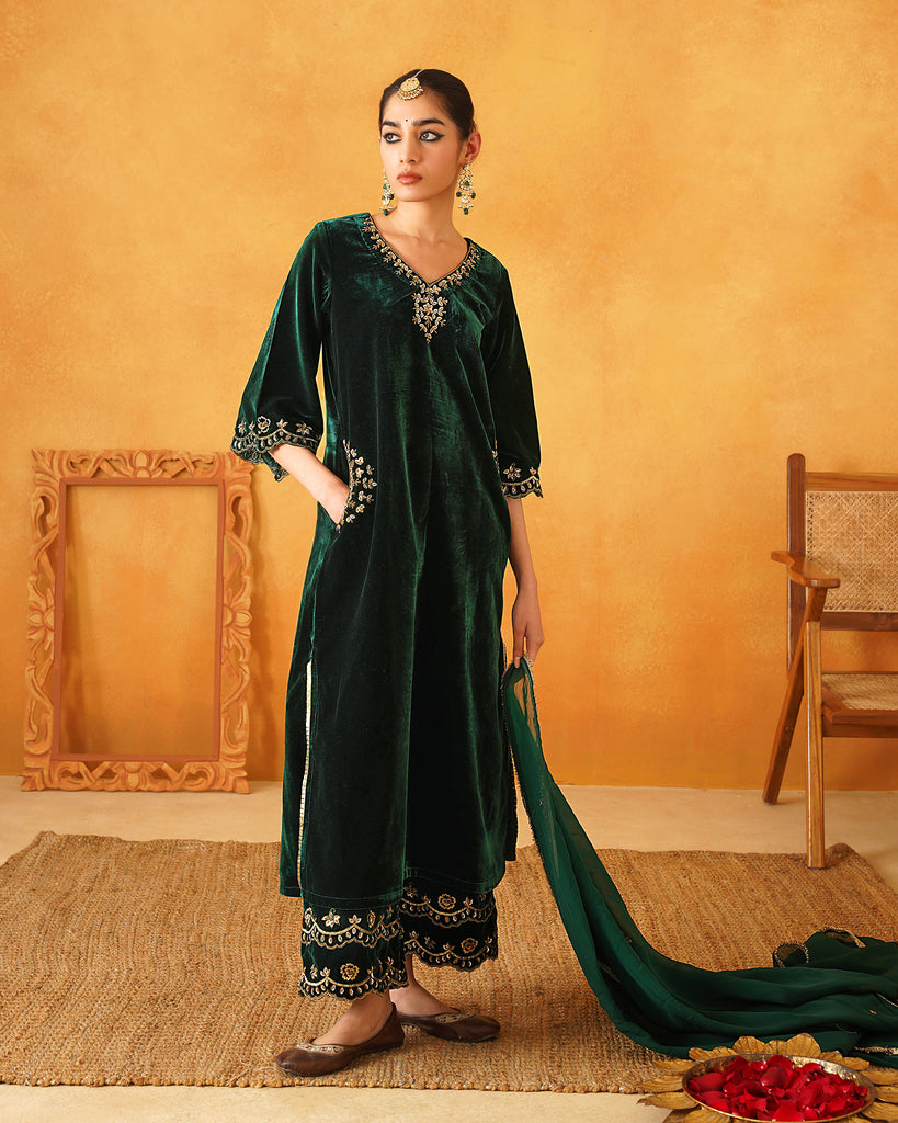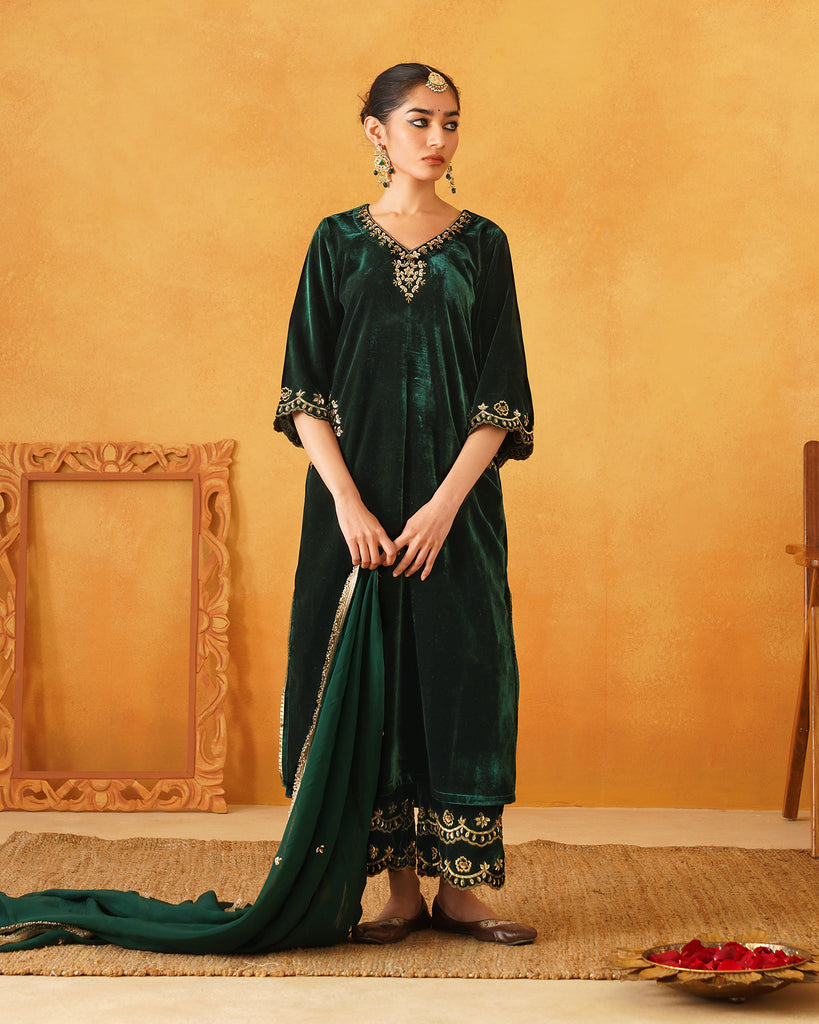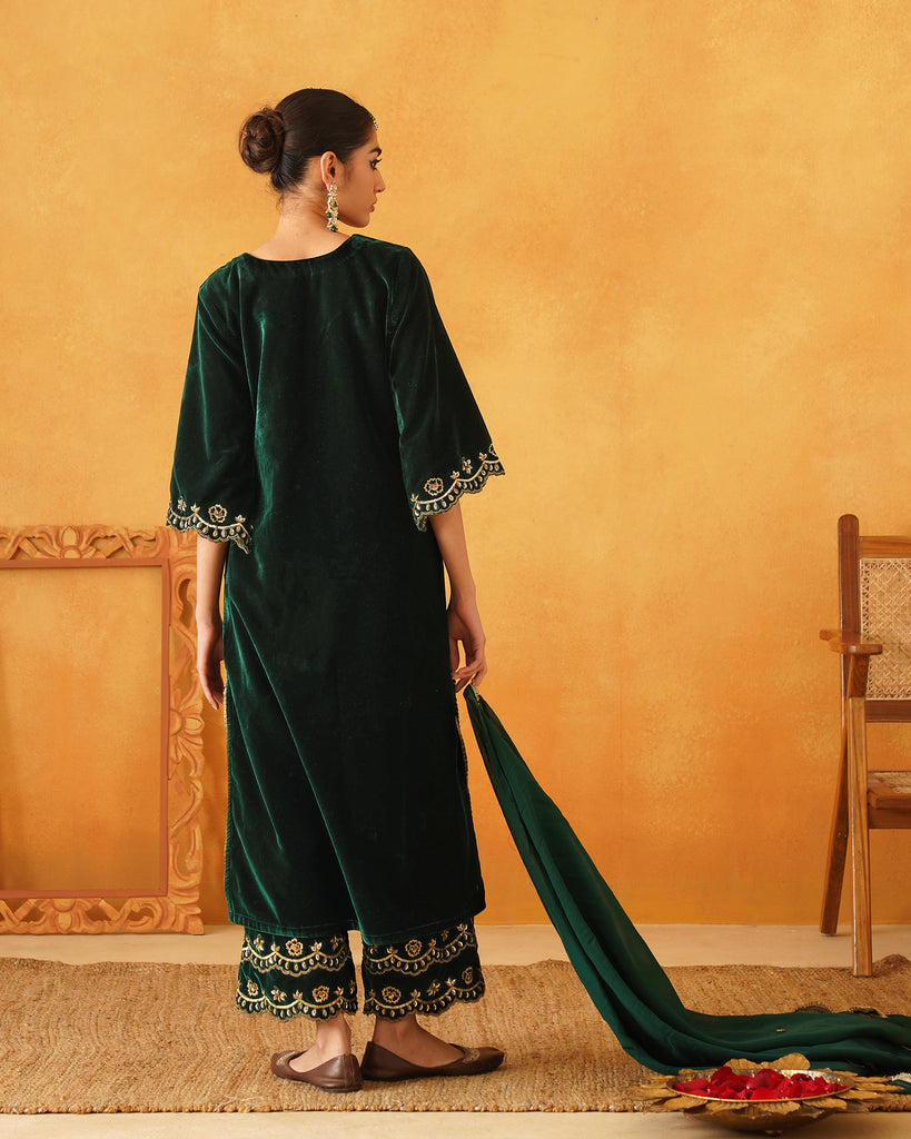 Bottle Green Velvet Hand Embroidered Kurta with Palazzo and Dupatta Set