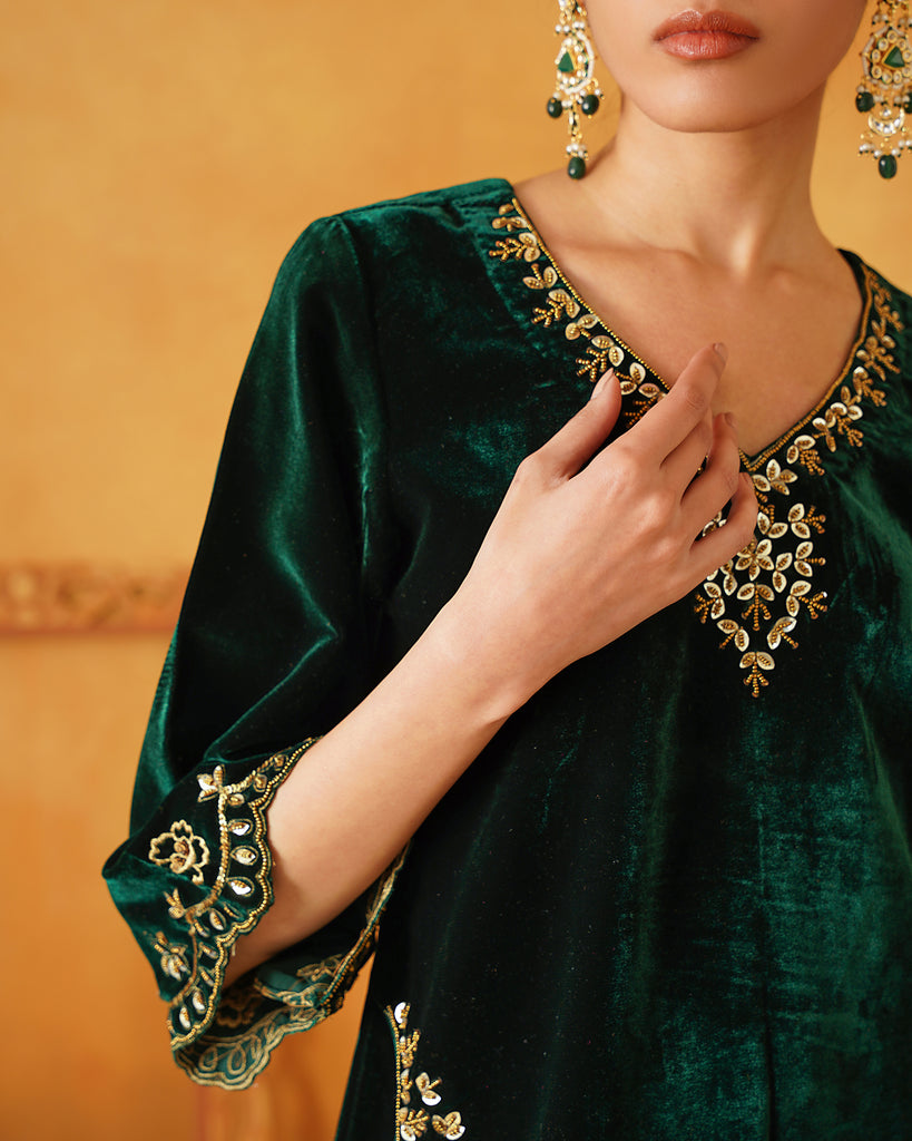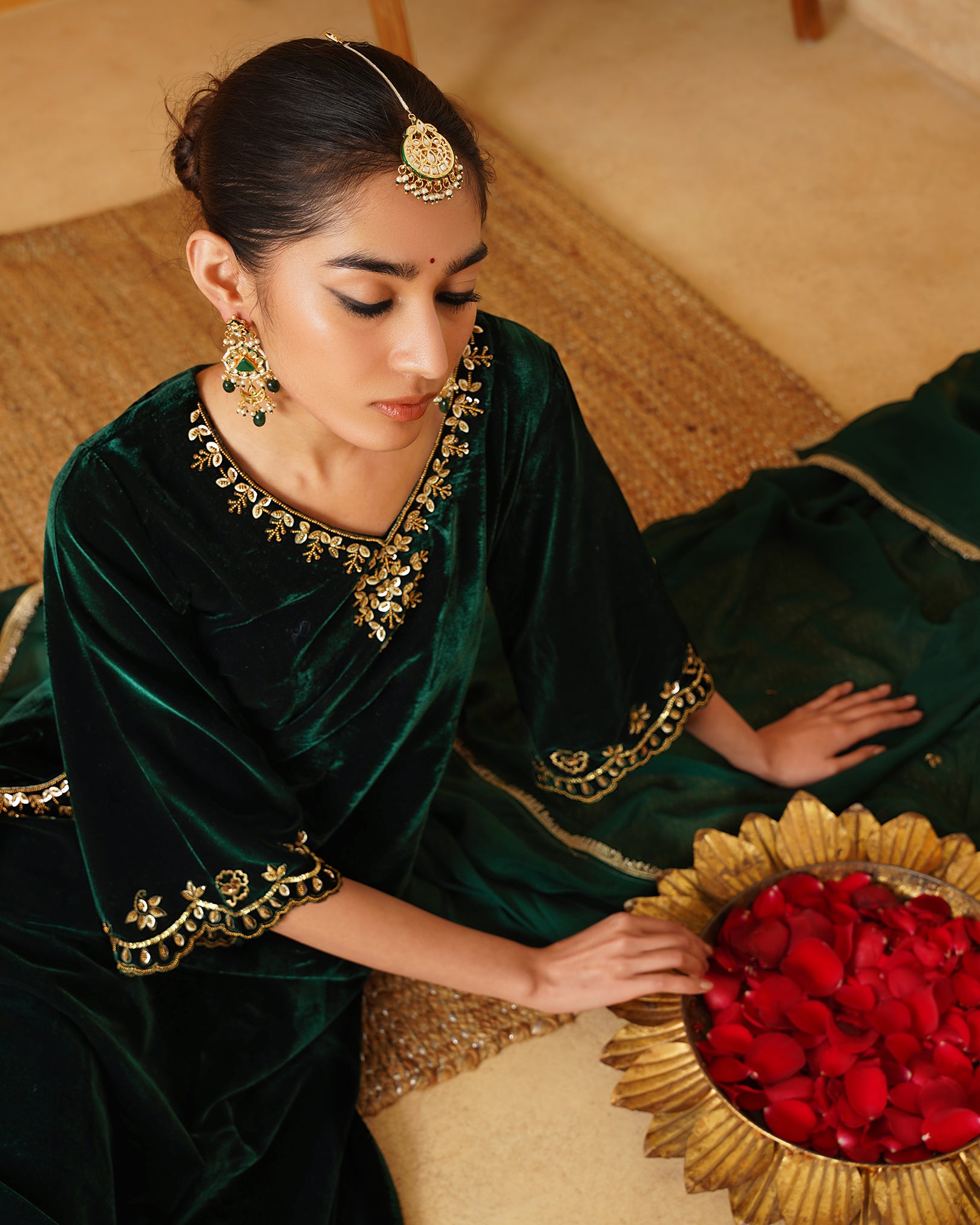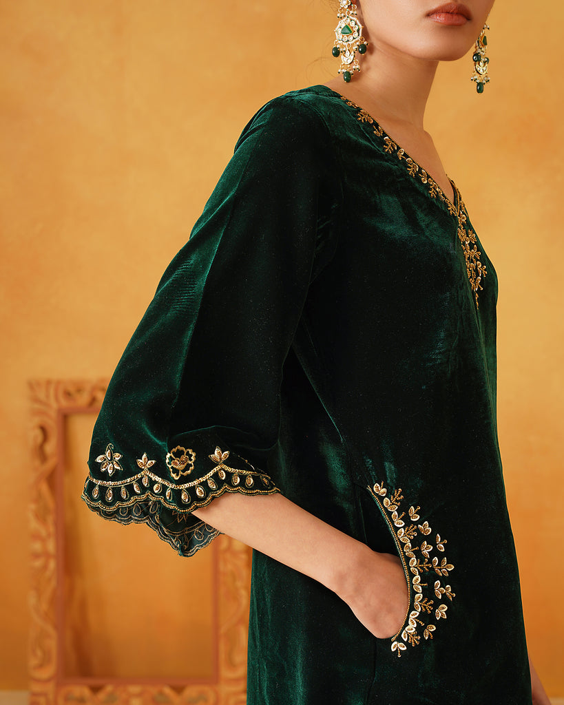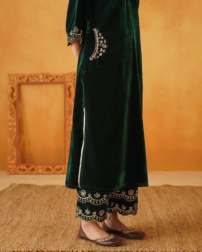 Bottle Green Velvet Hand Embroidered Kurta with Palazzo and Dupatta Set