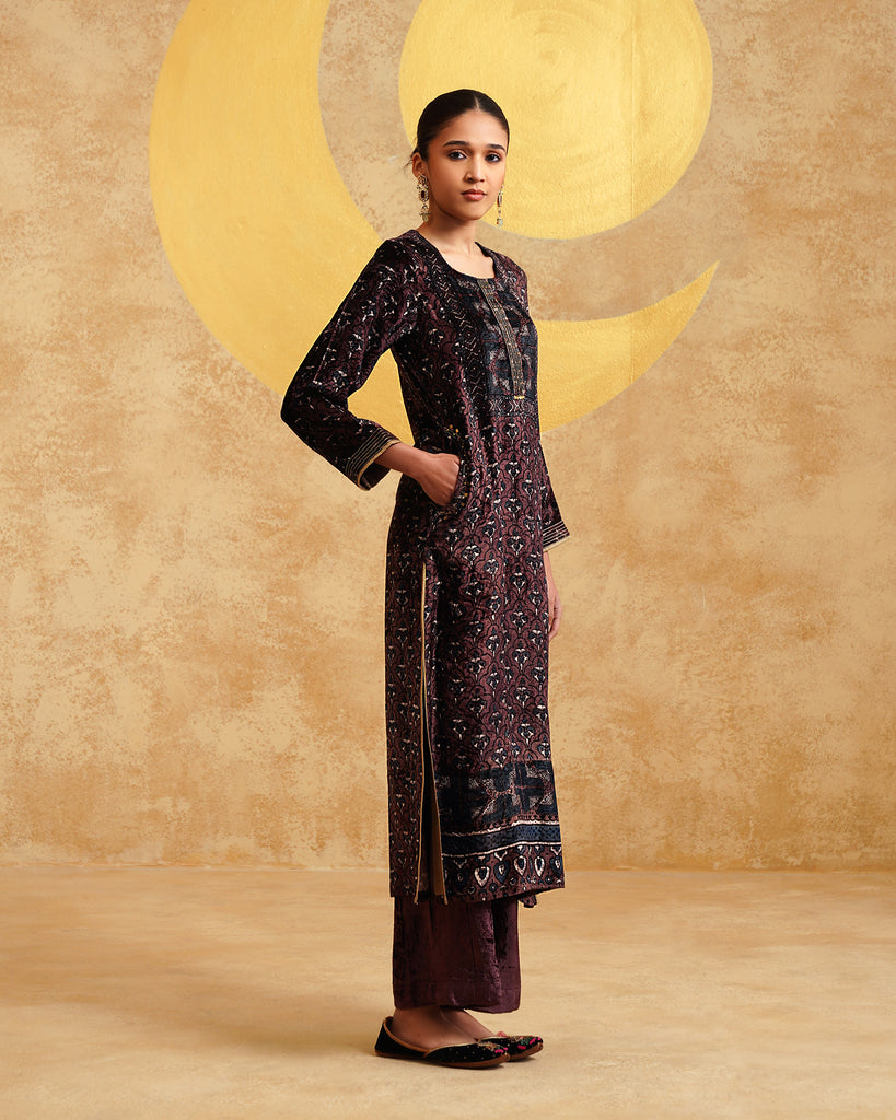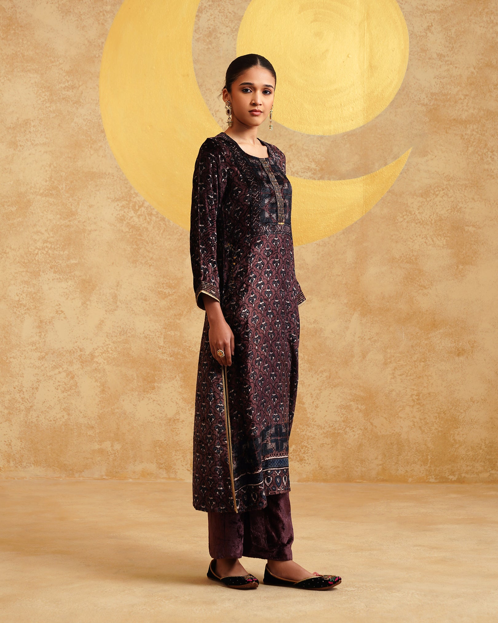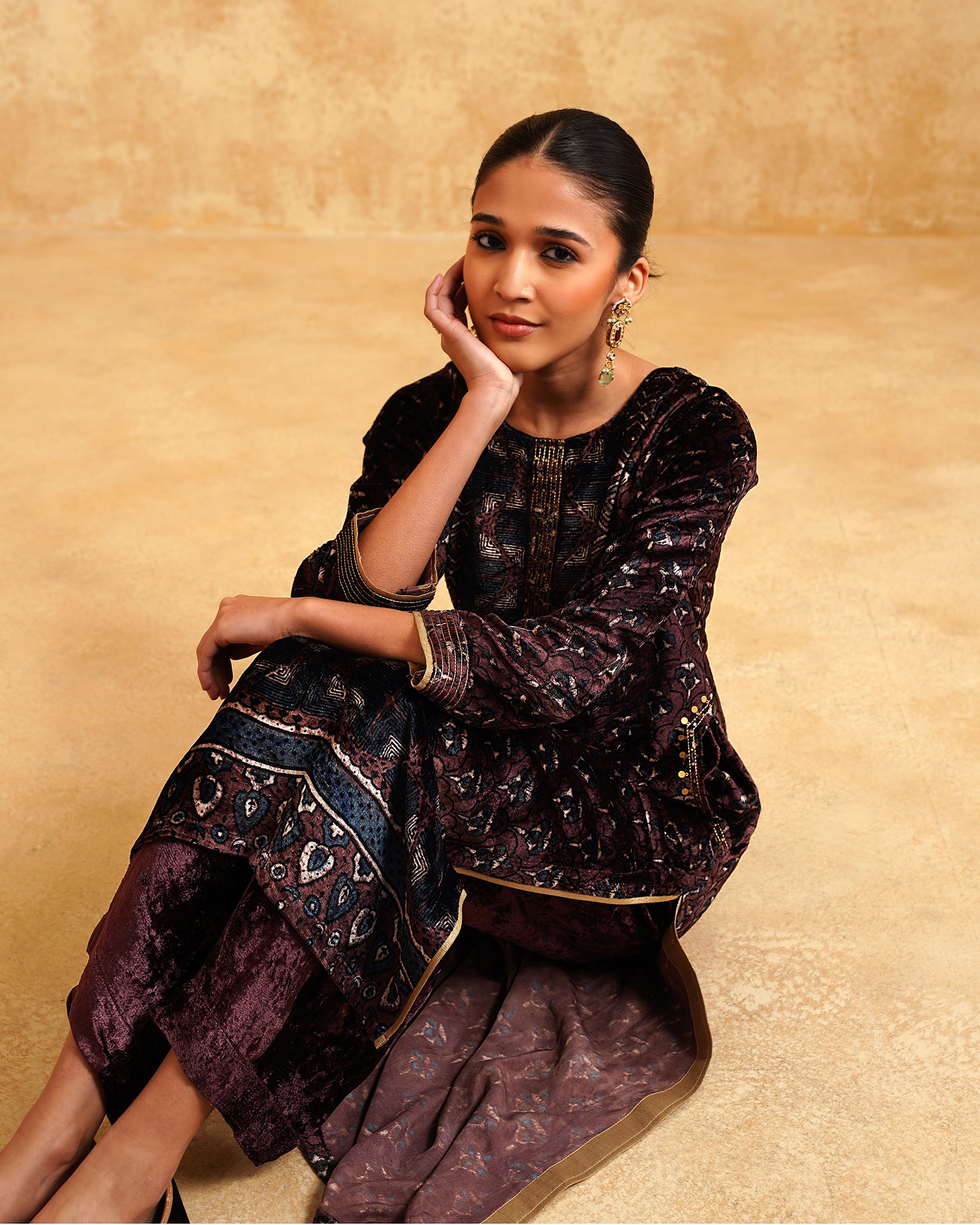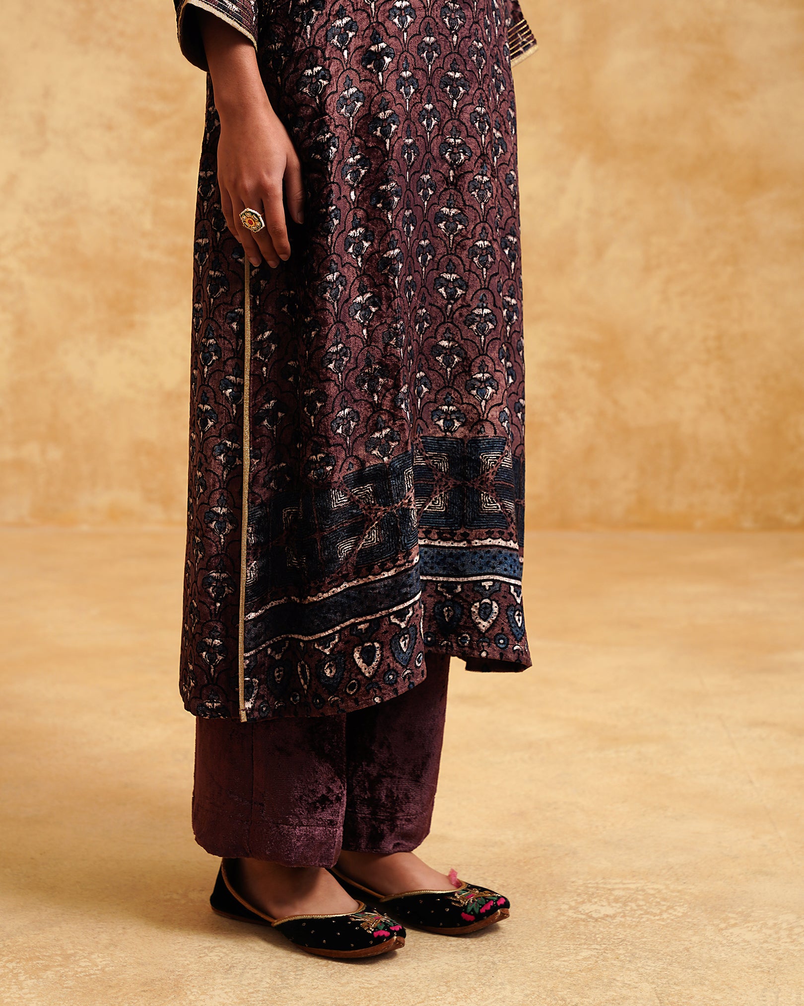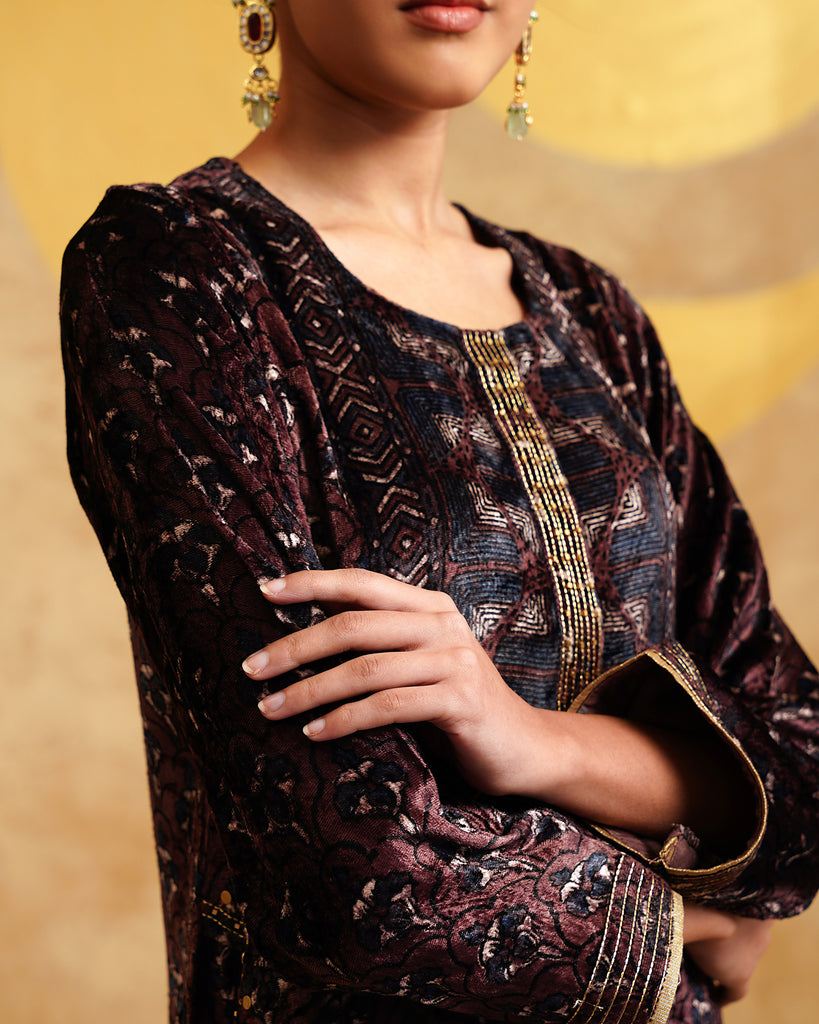 Dark Marron Ajrakh Handblock Soft Velvet Kurta & Palazzo Set