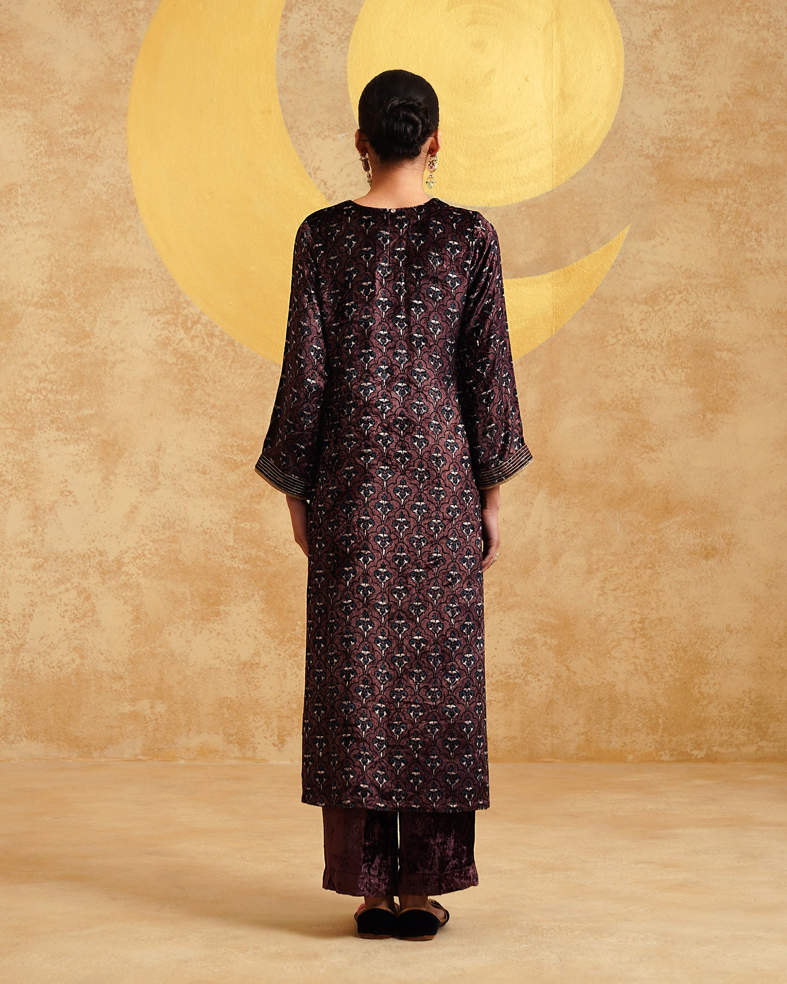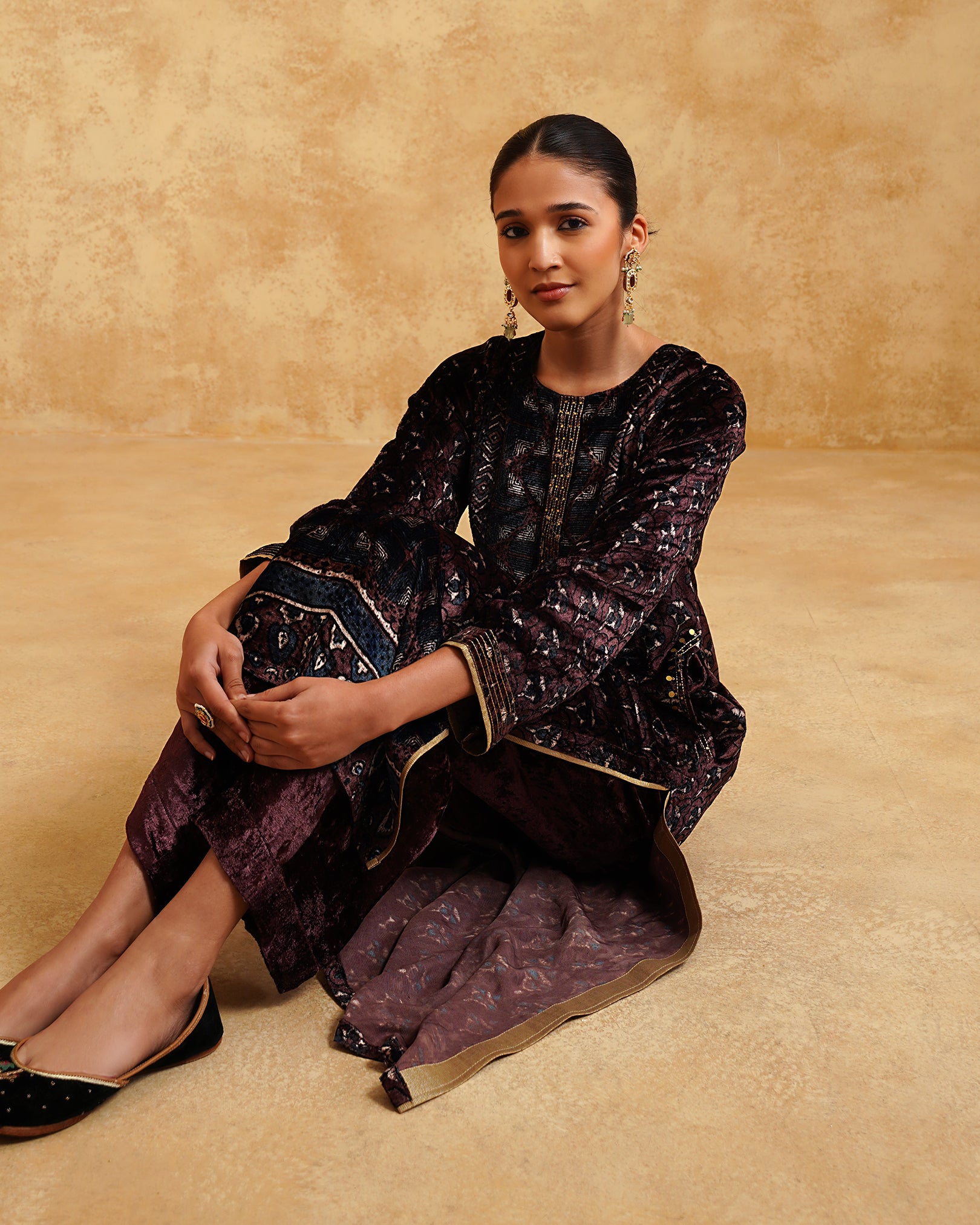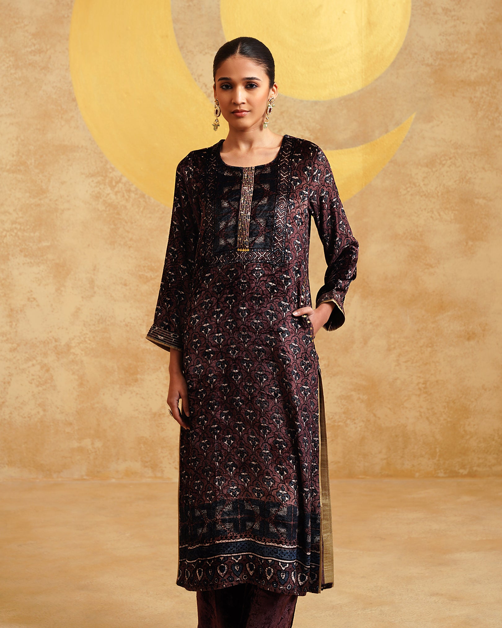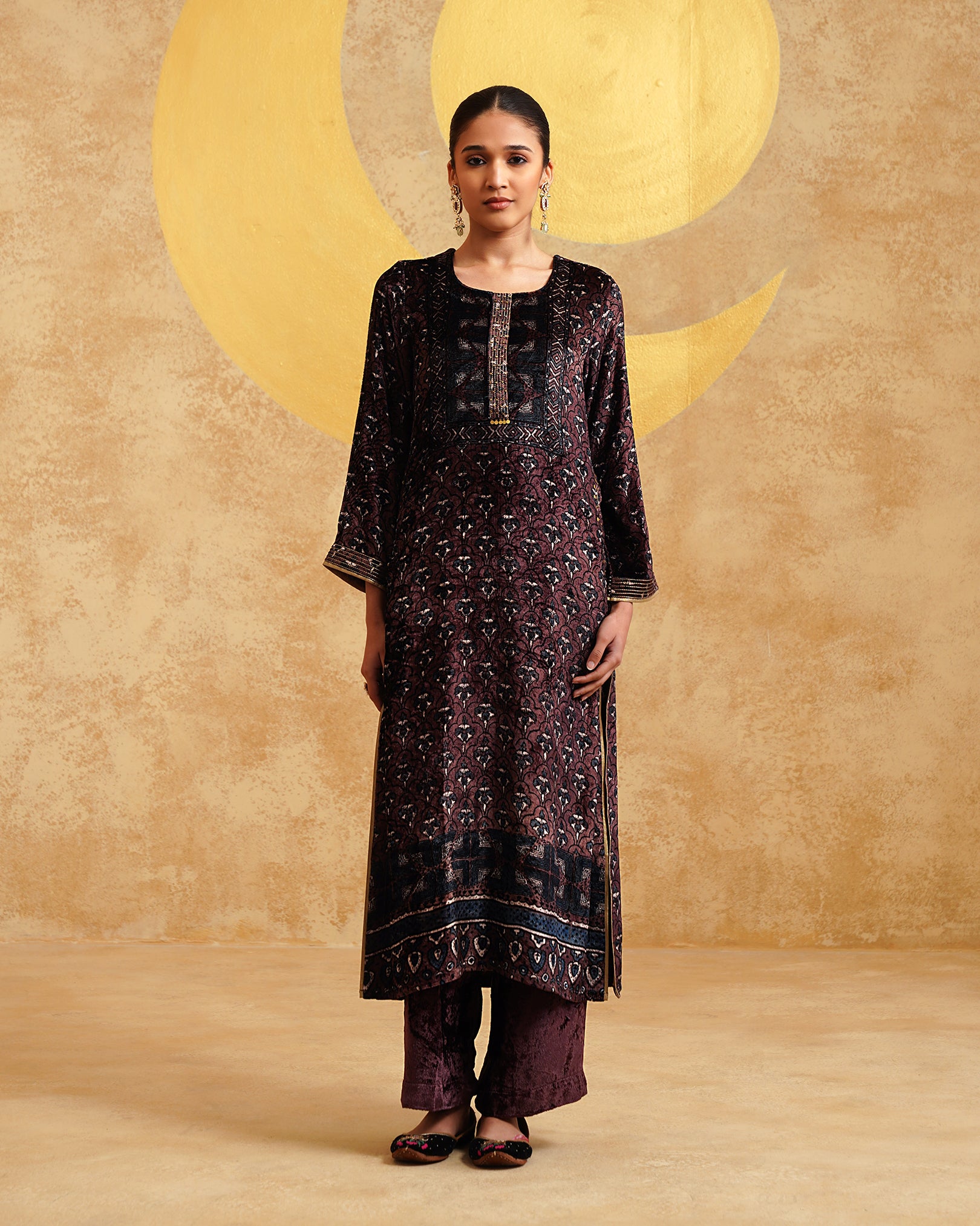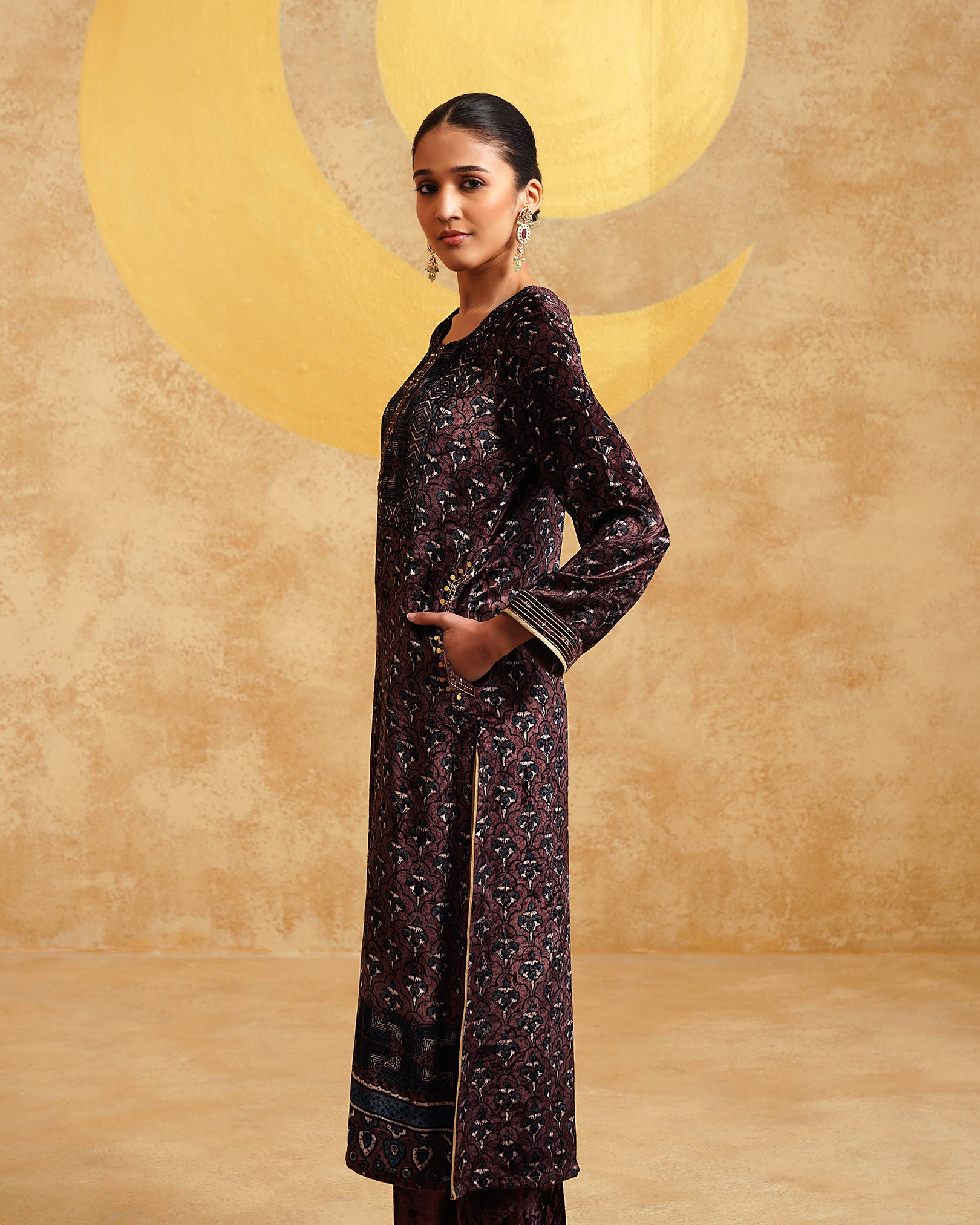 Dark Marron Ajrakh Handblock Soft Velvet Kurta & Palazzo Set