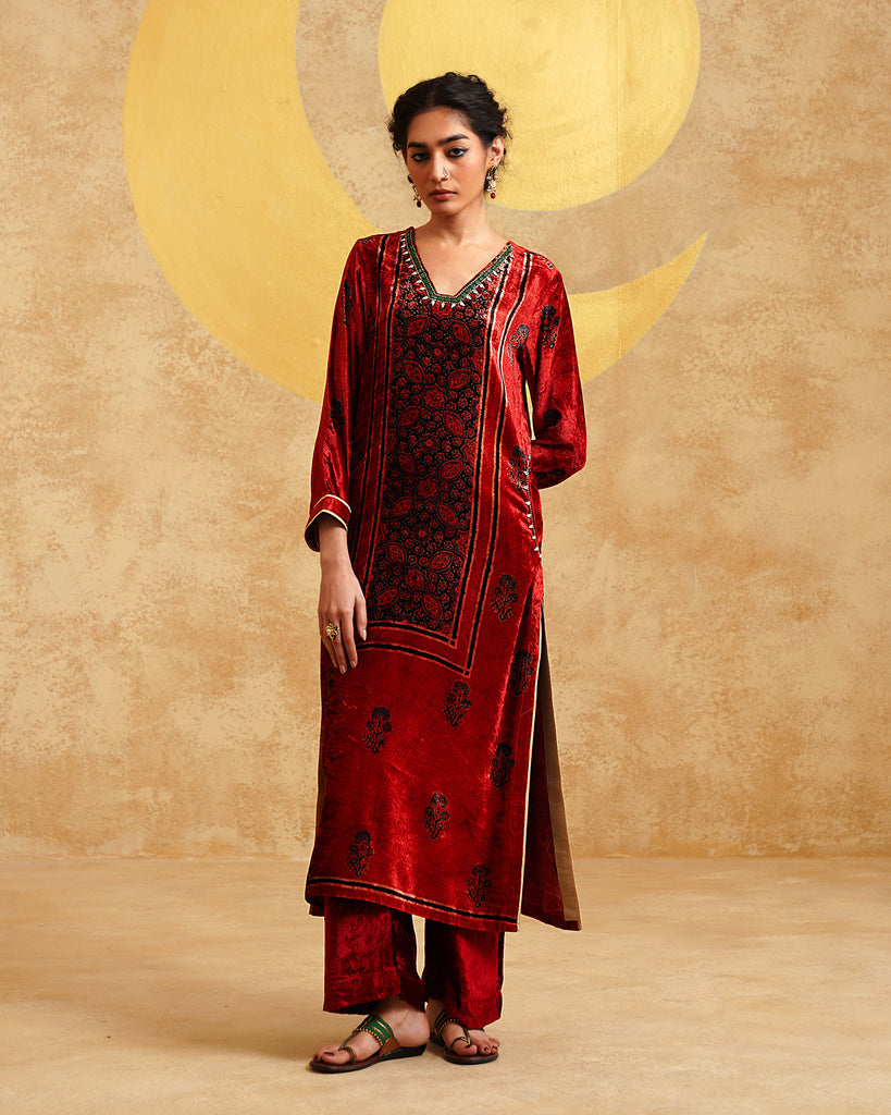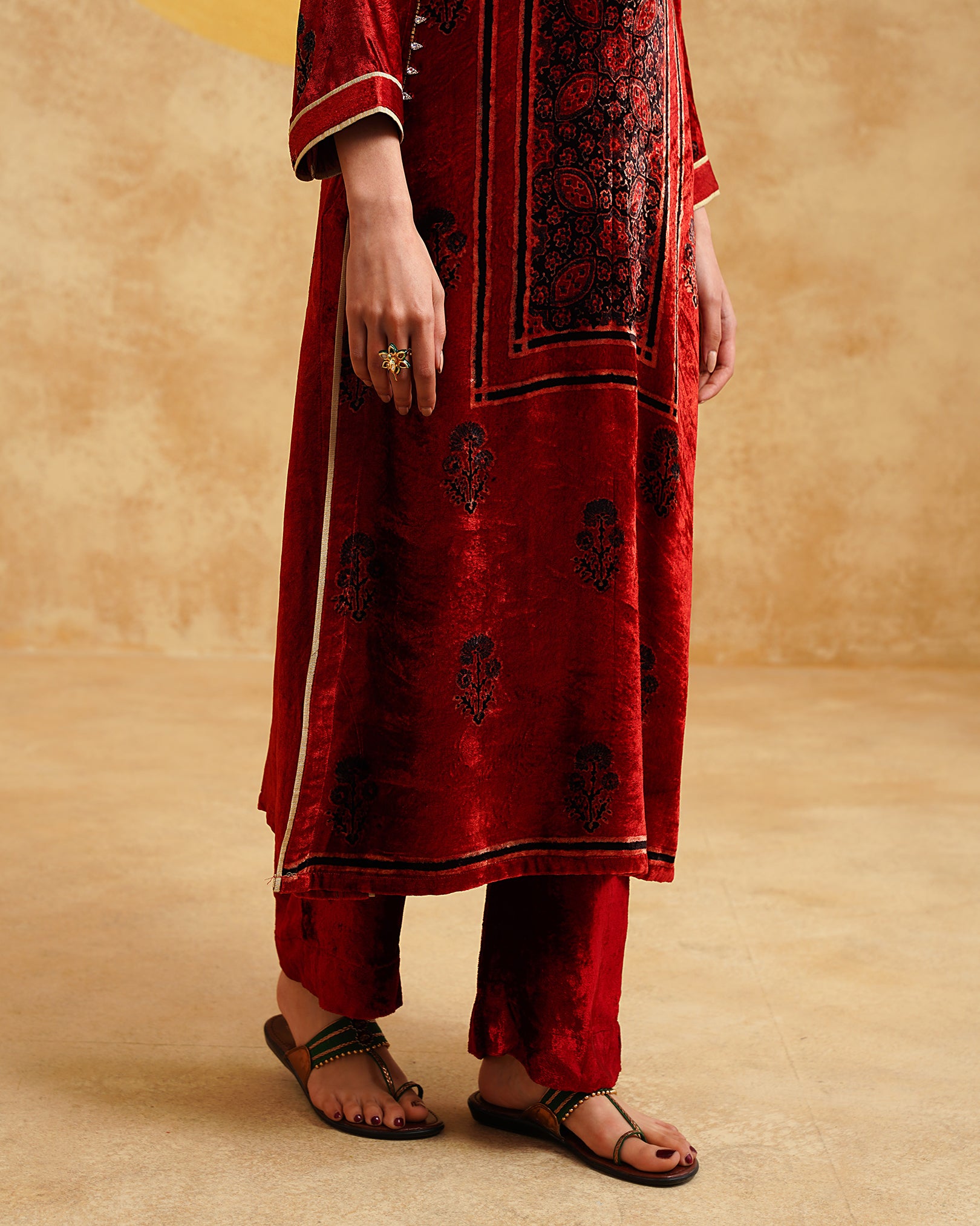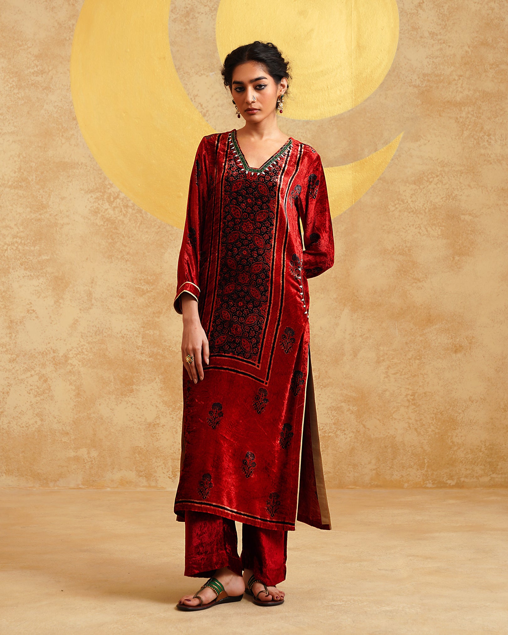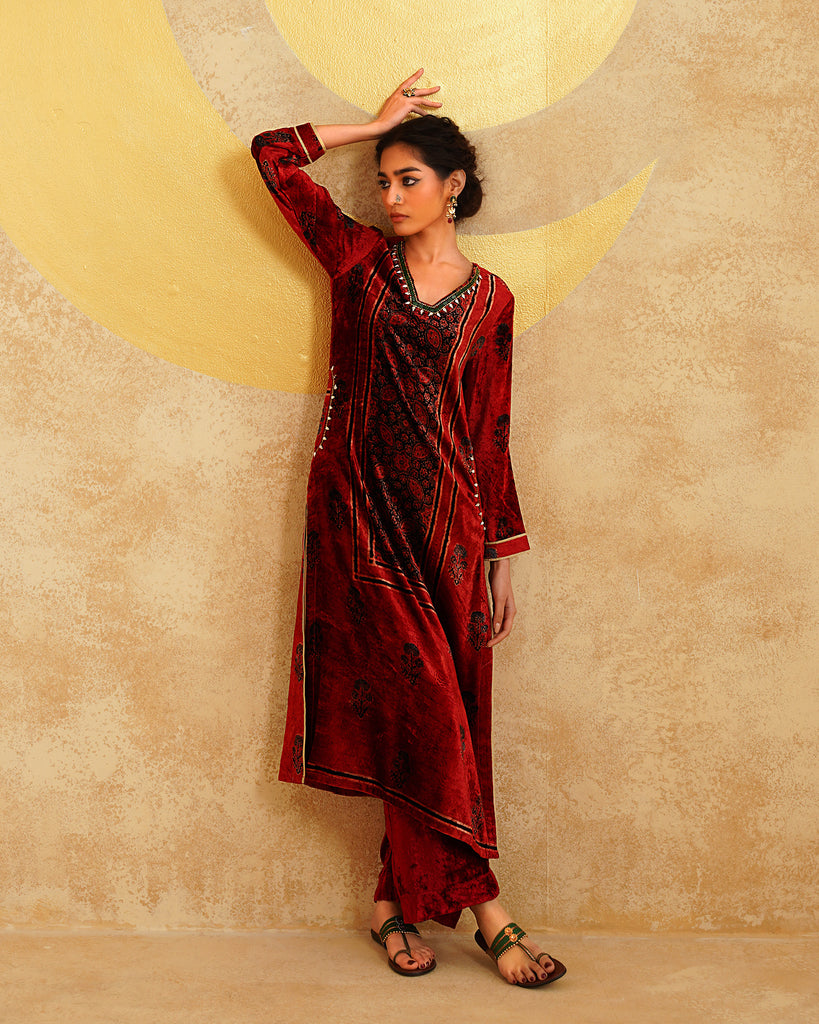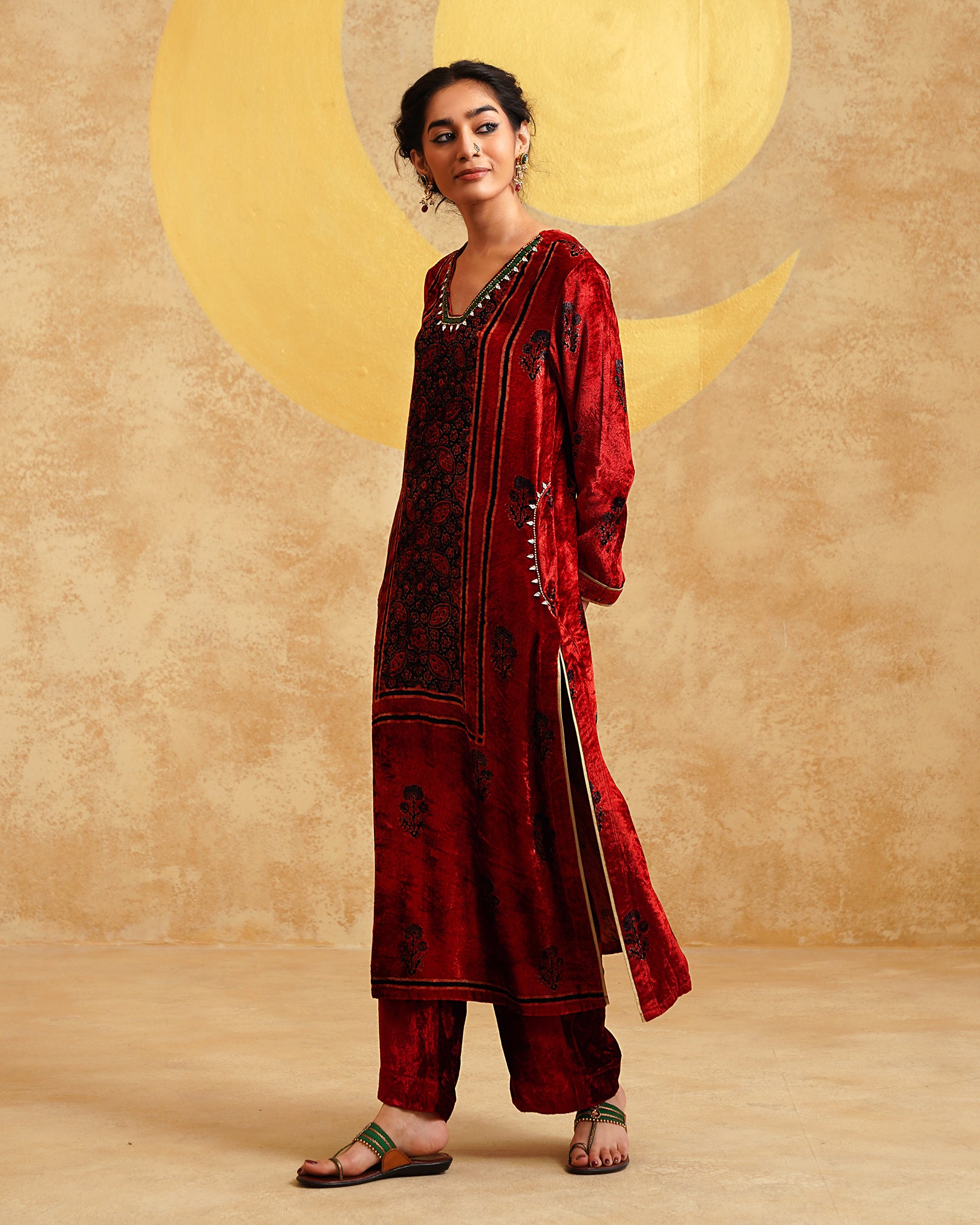 Maroon Ajrakh Handblock Soft Velvet Kurta & Palazzo Set