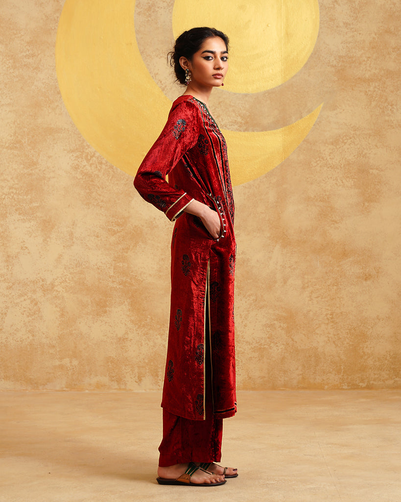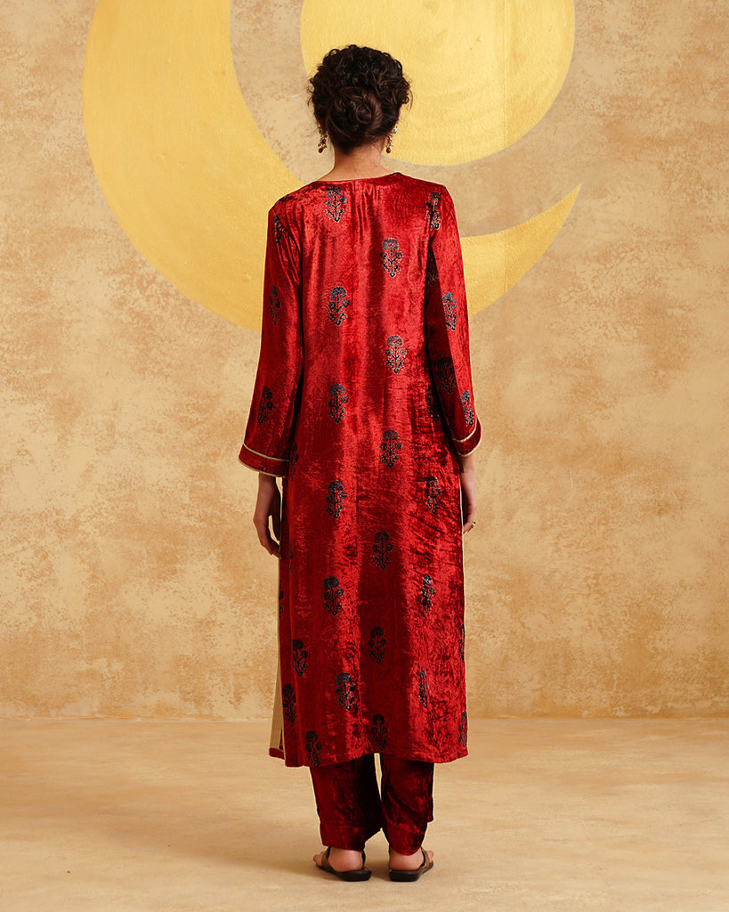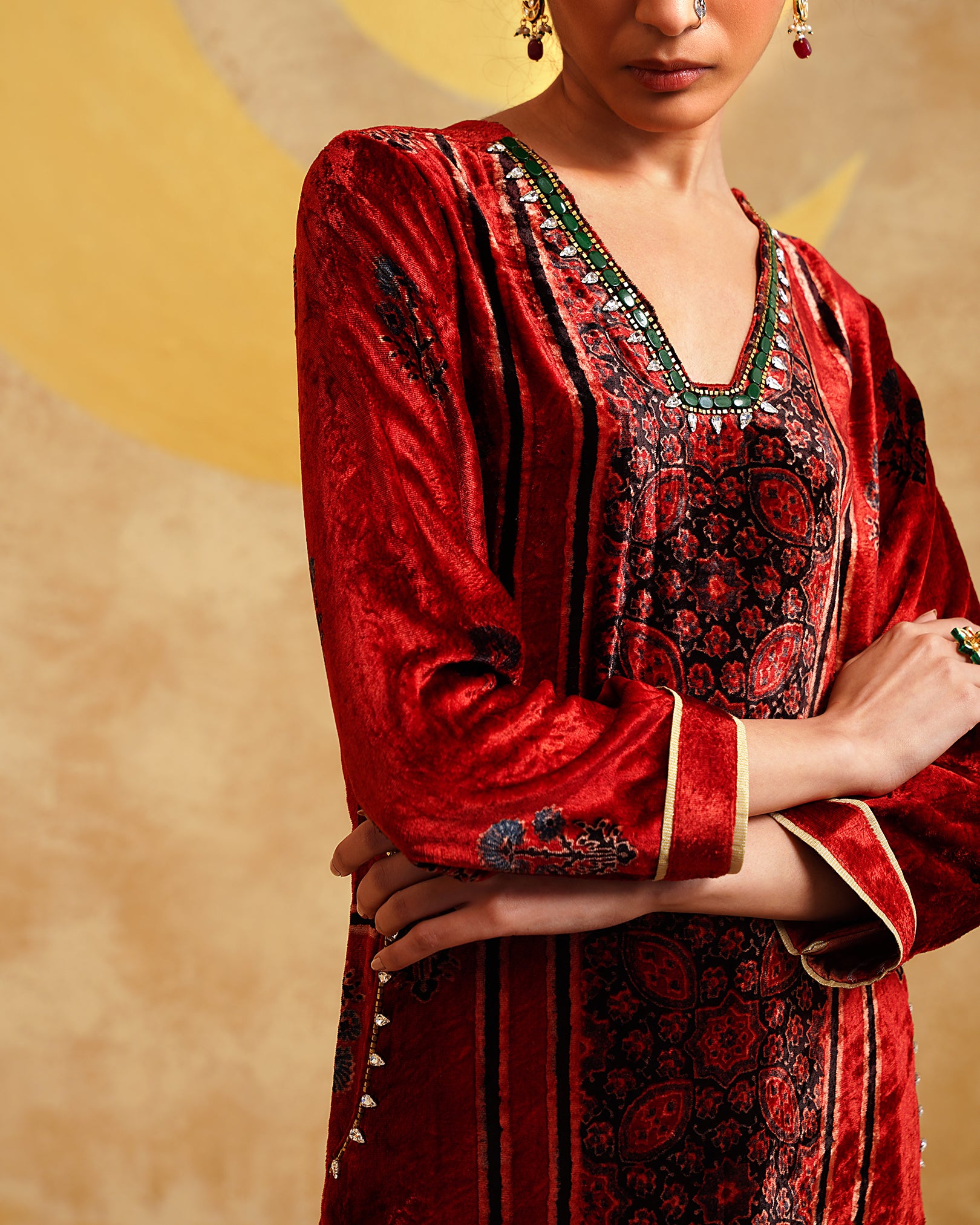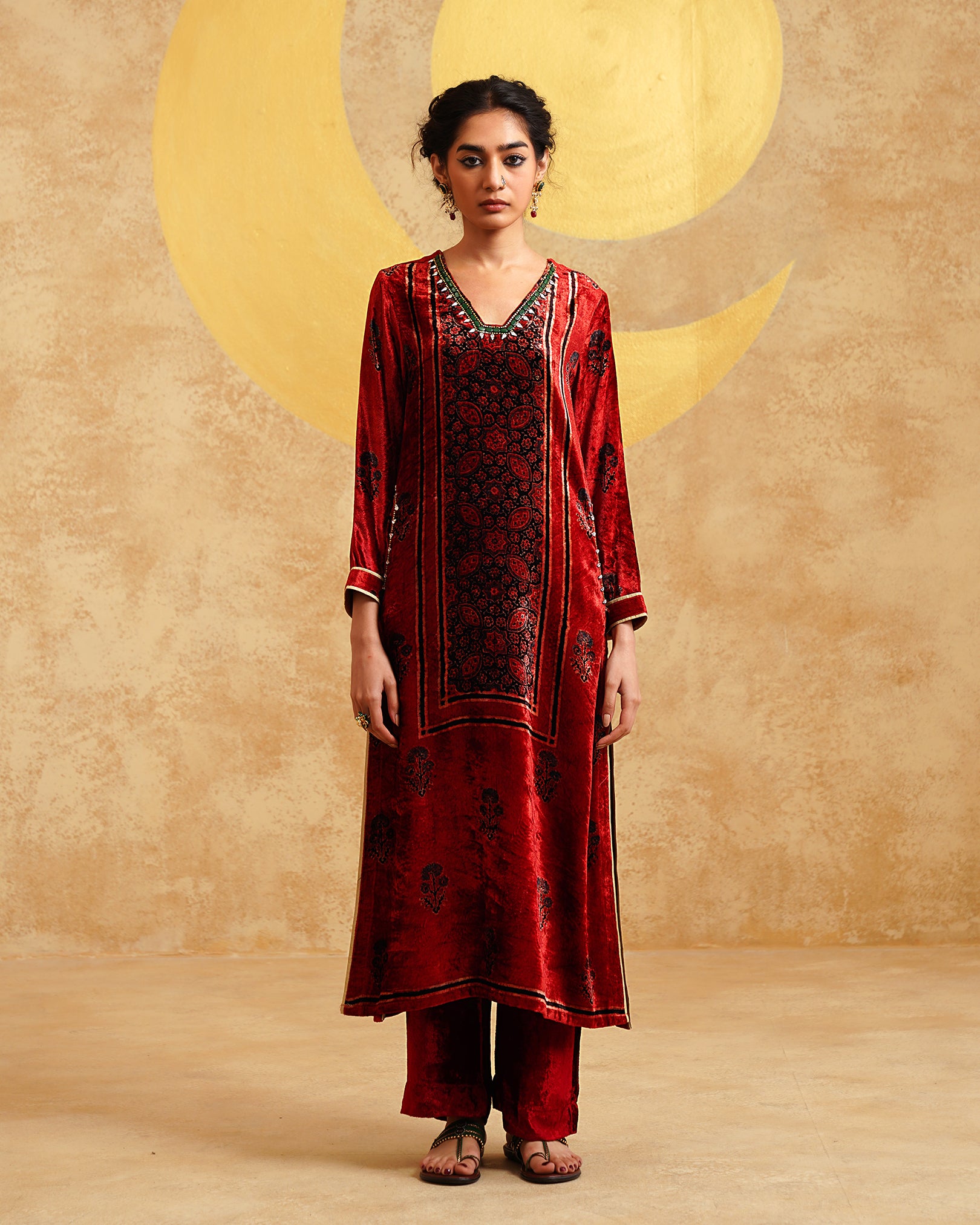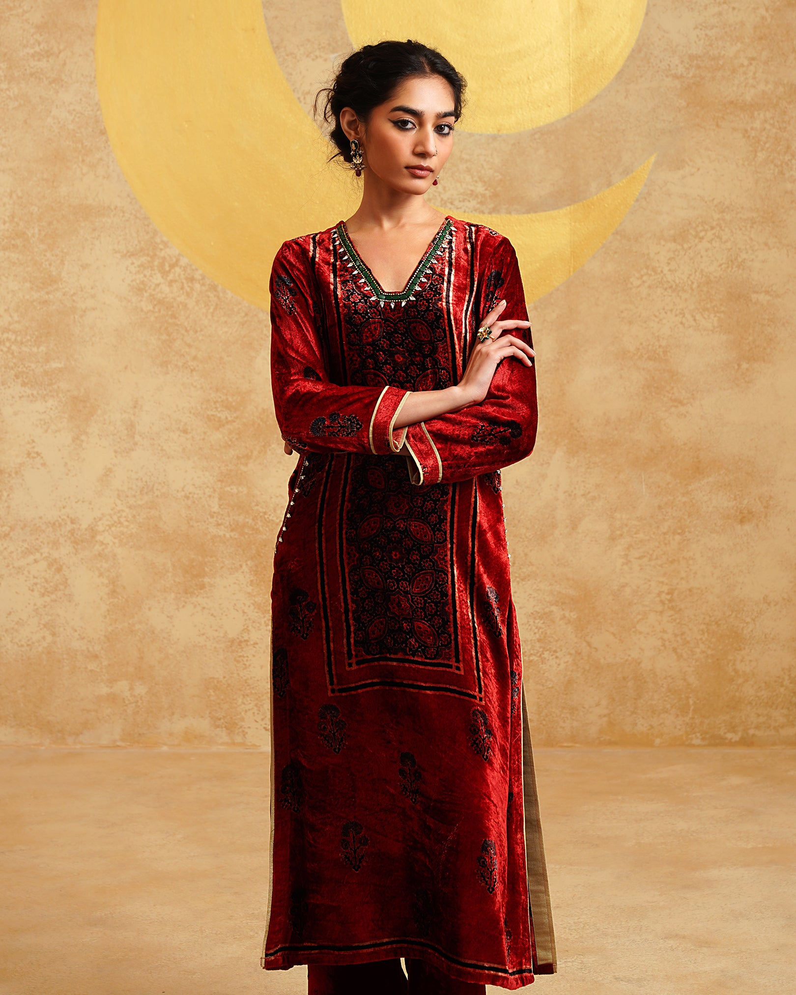 Maroon Ajrakh Handblock Soft Velvet Kurta & Palazzo Set