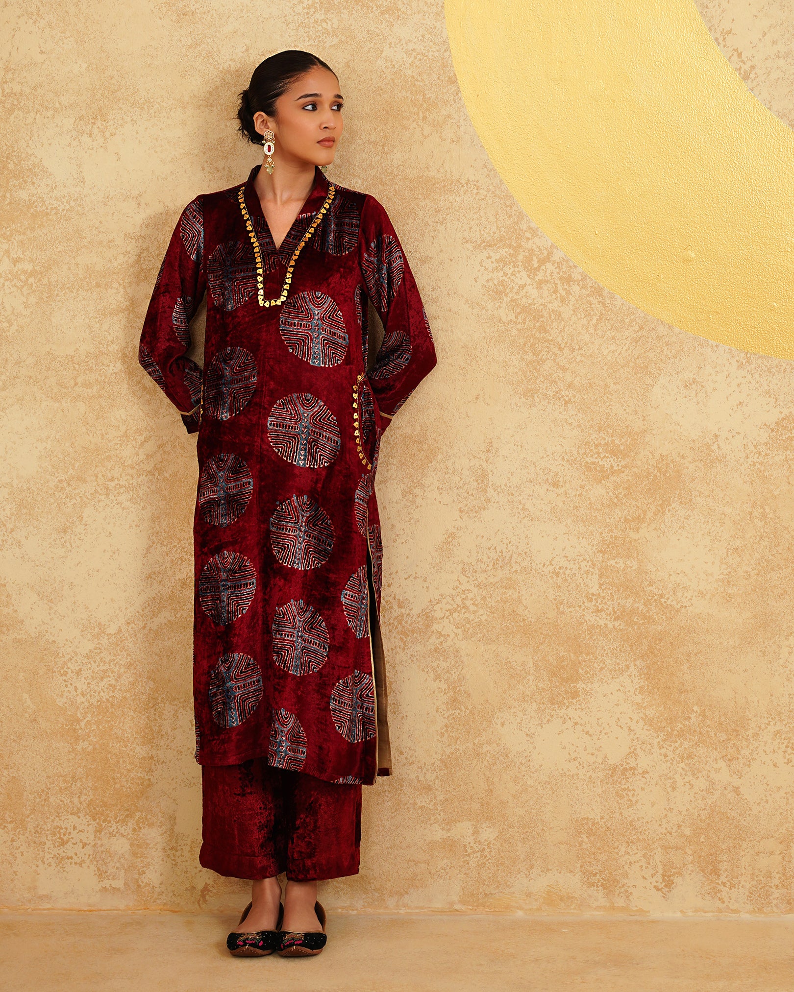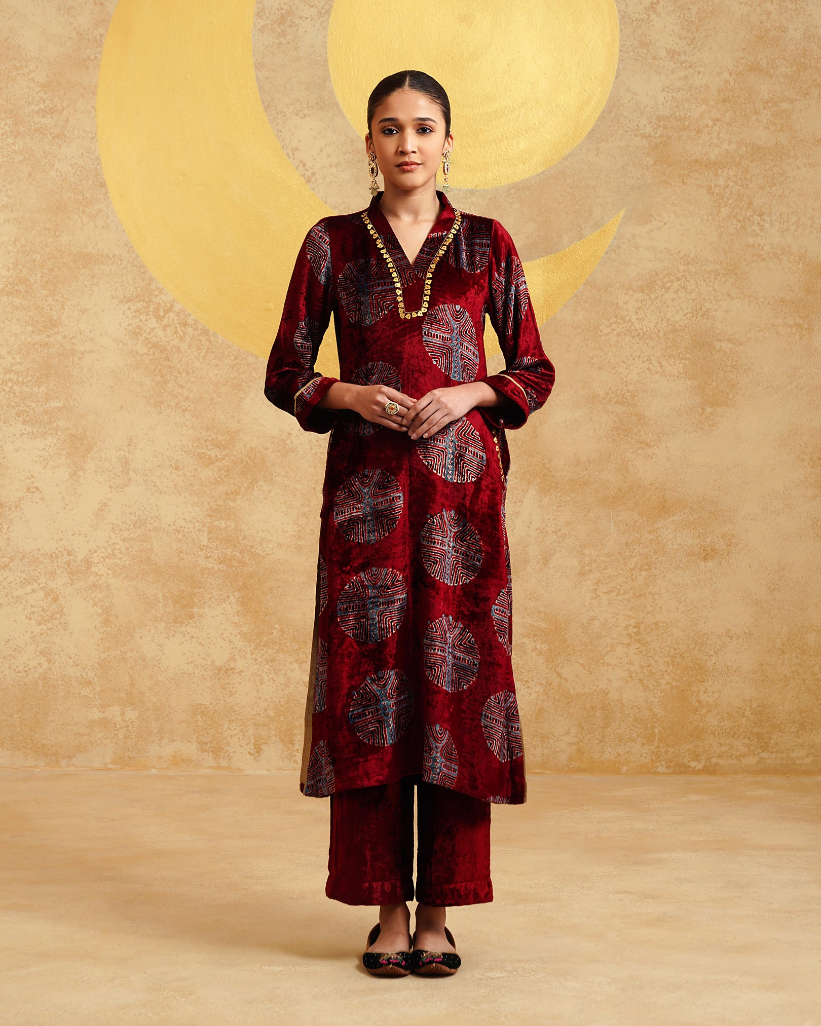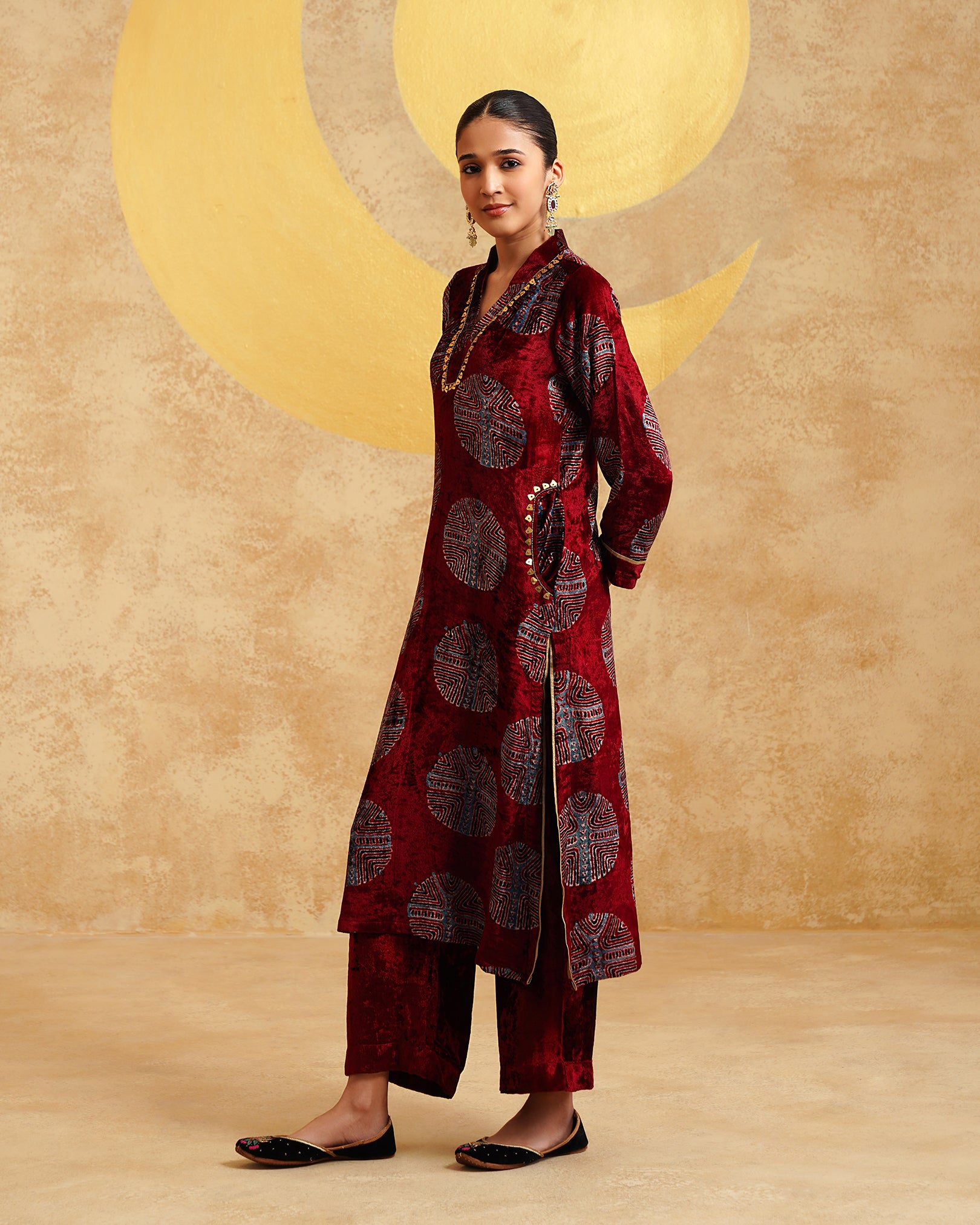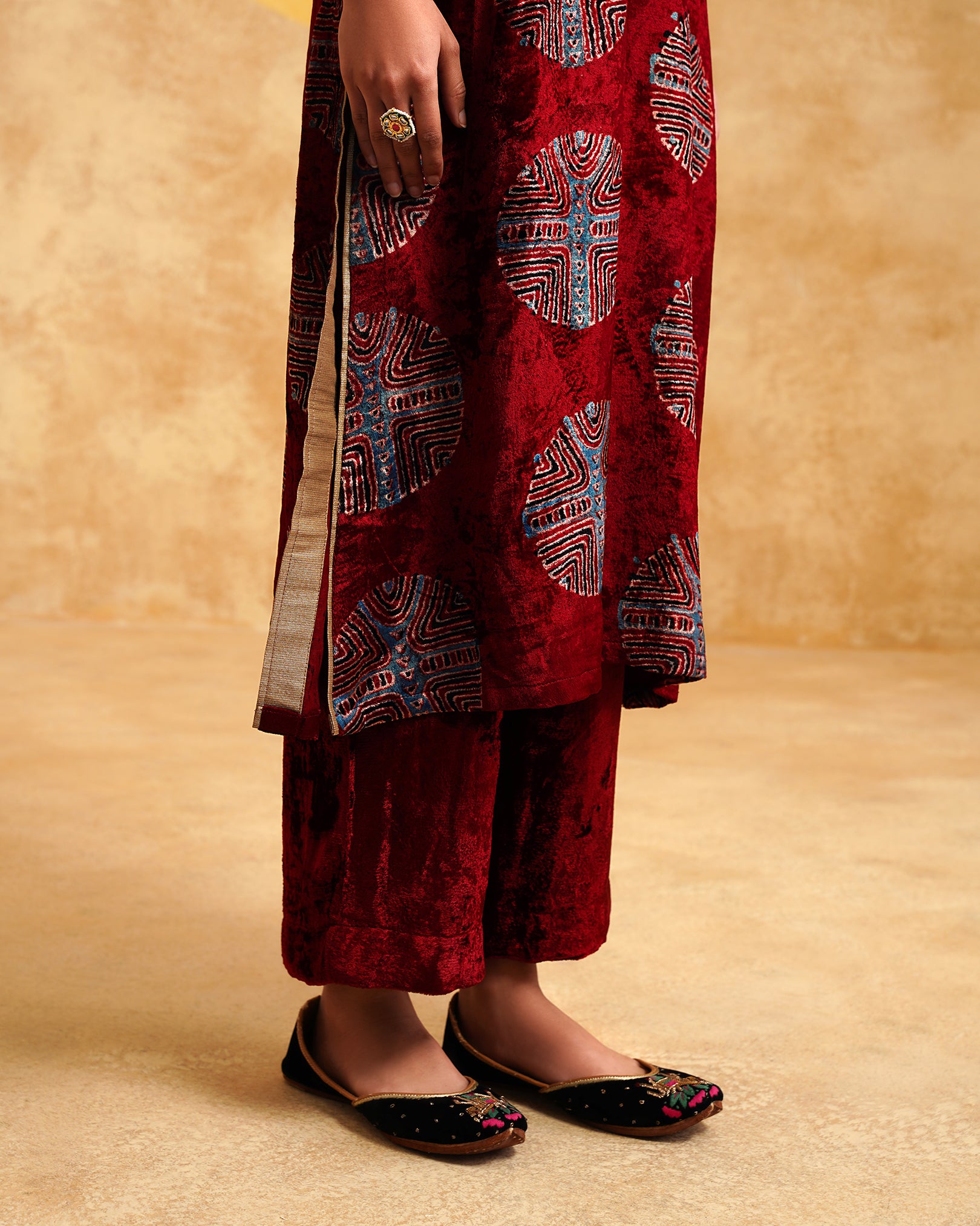 Maroon Ajrakh Handblock Soft Velvet Kurta & Palazzo Set