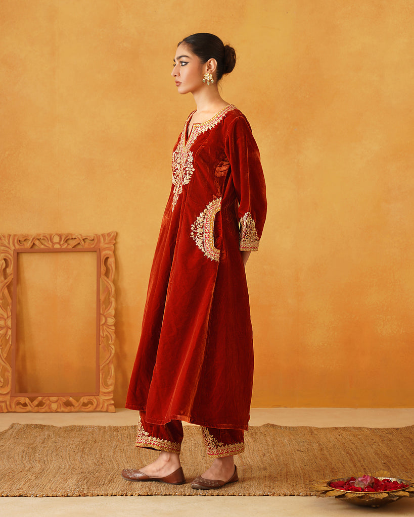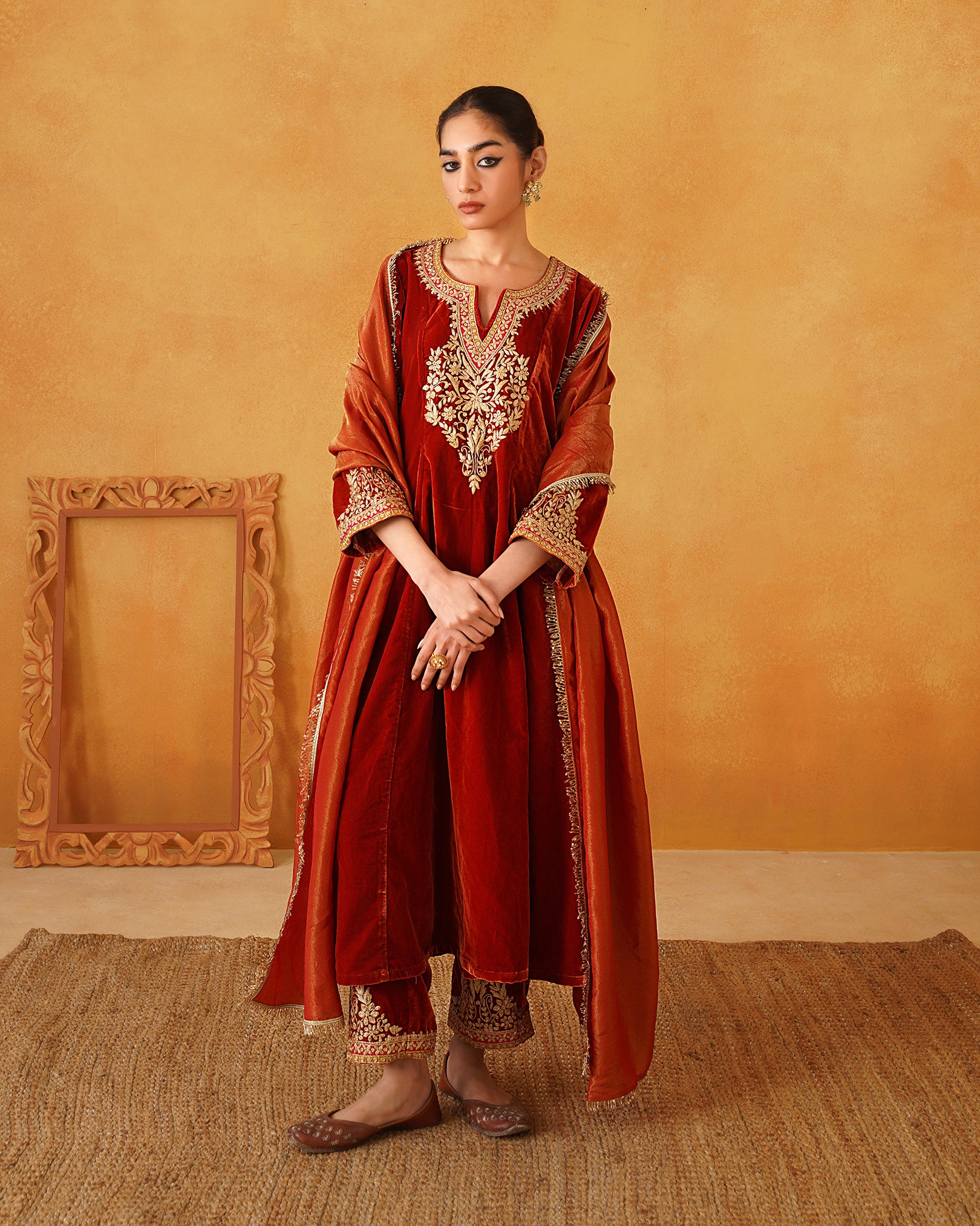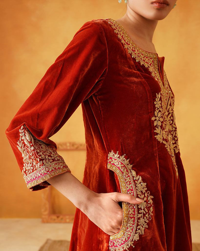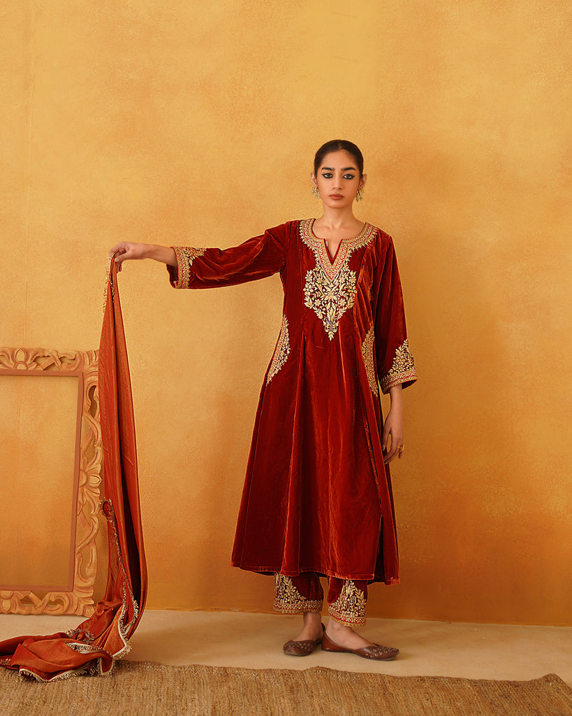 Rust Velvet Hand Embroidered Kurta with Palazzo and Dupatta Set