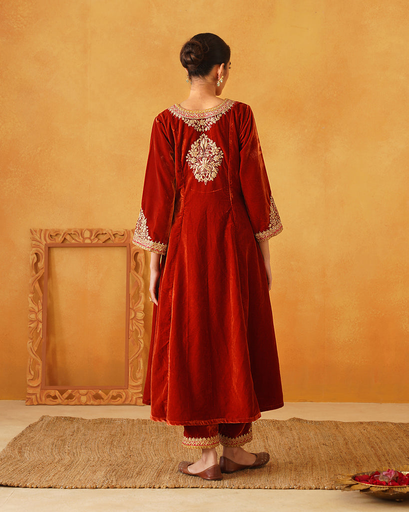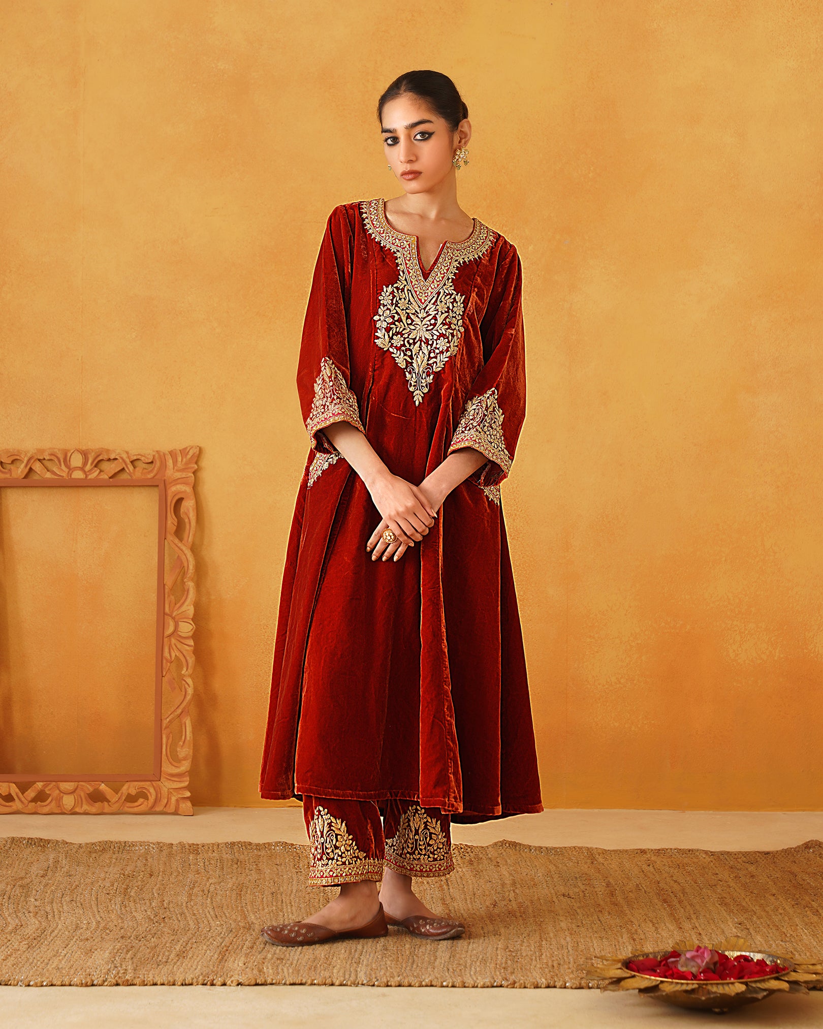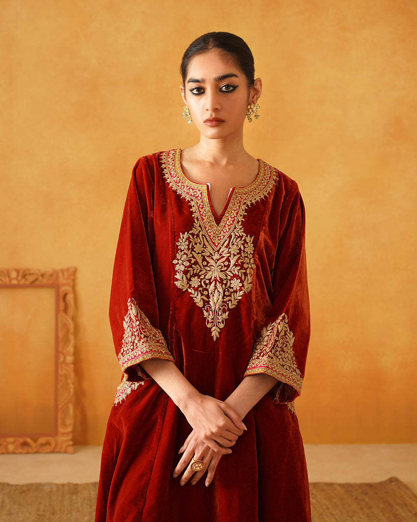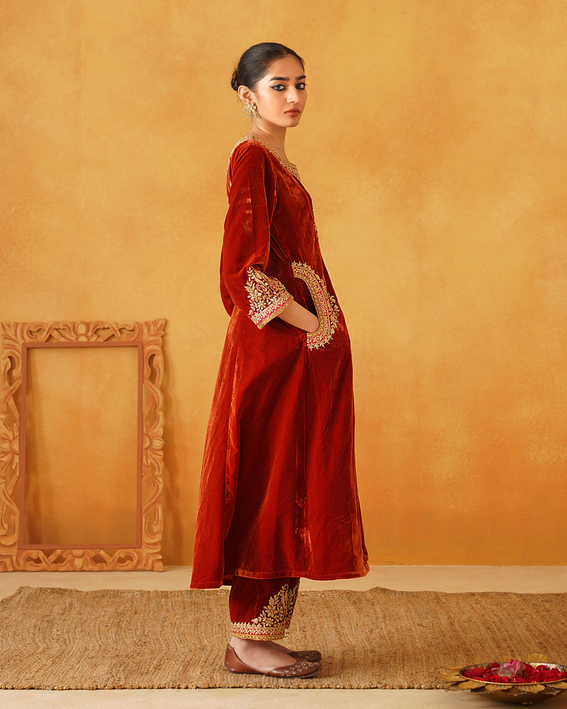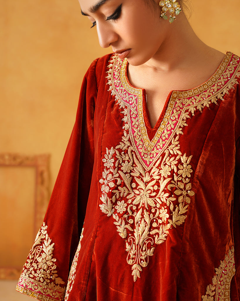 Rust Velvet Hand Embroidered Kurta with Palazzo and Dupatta Set