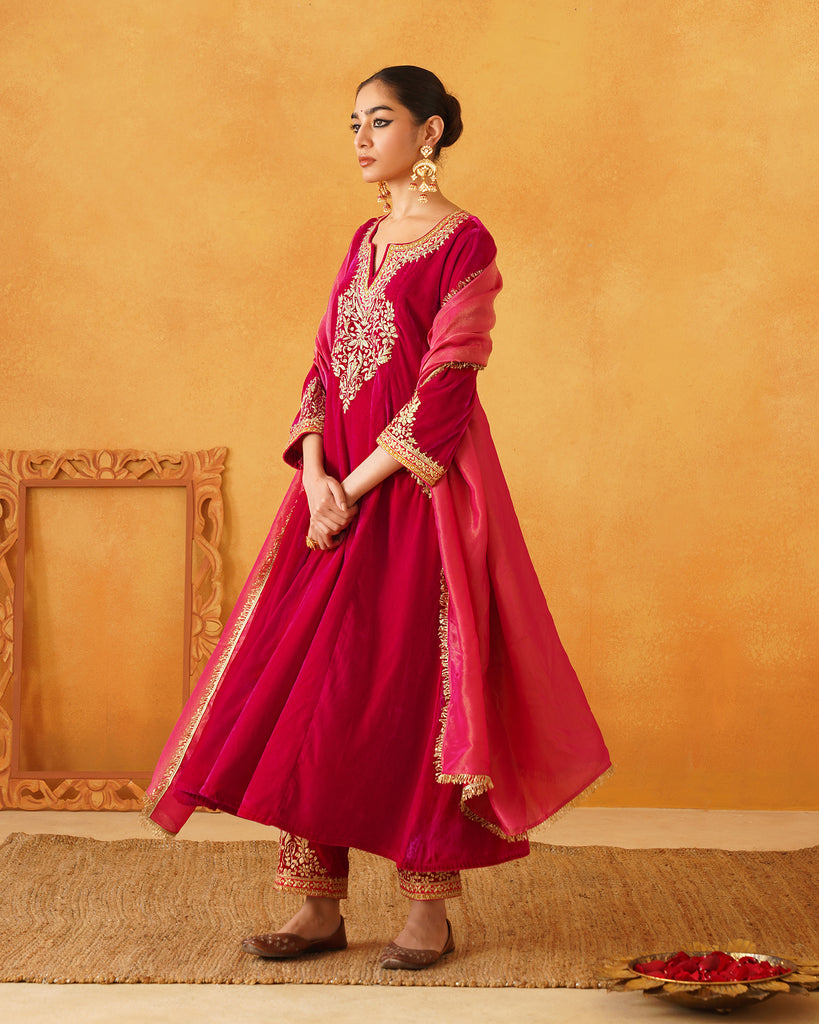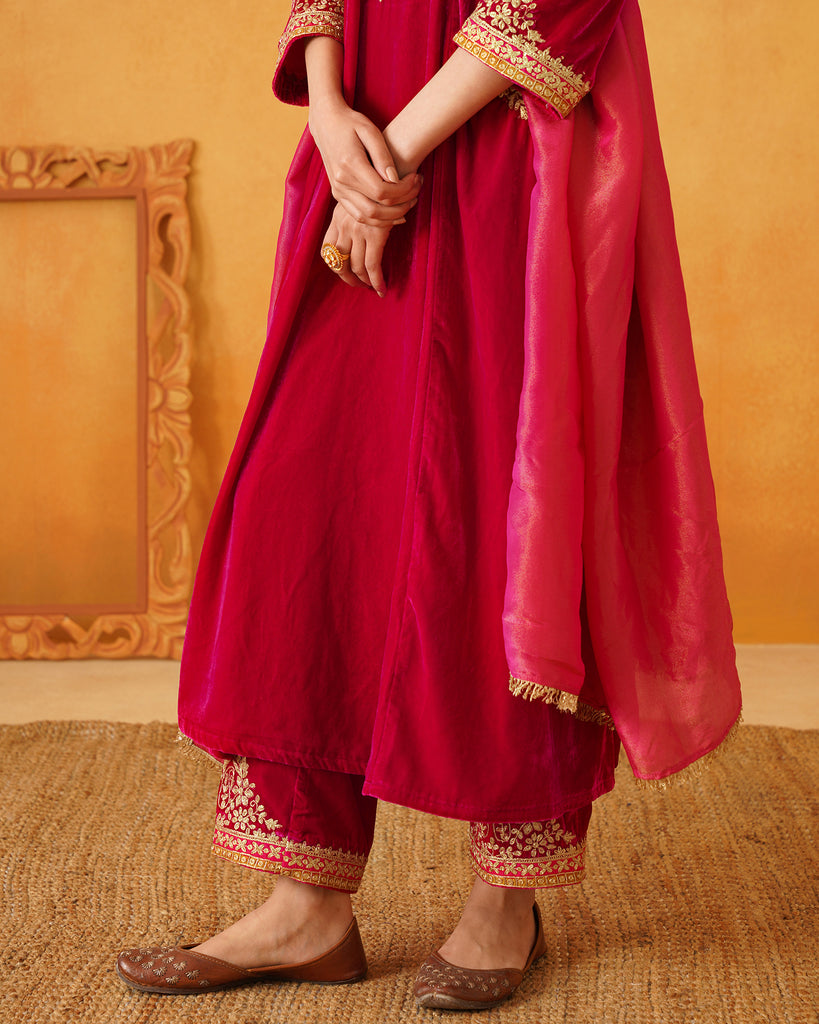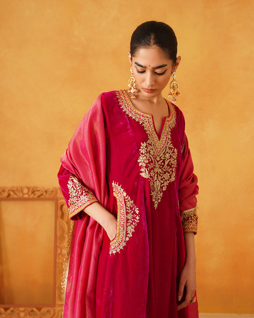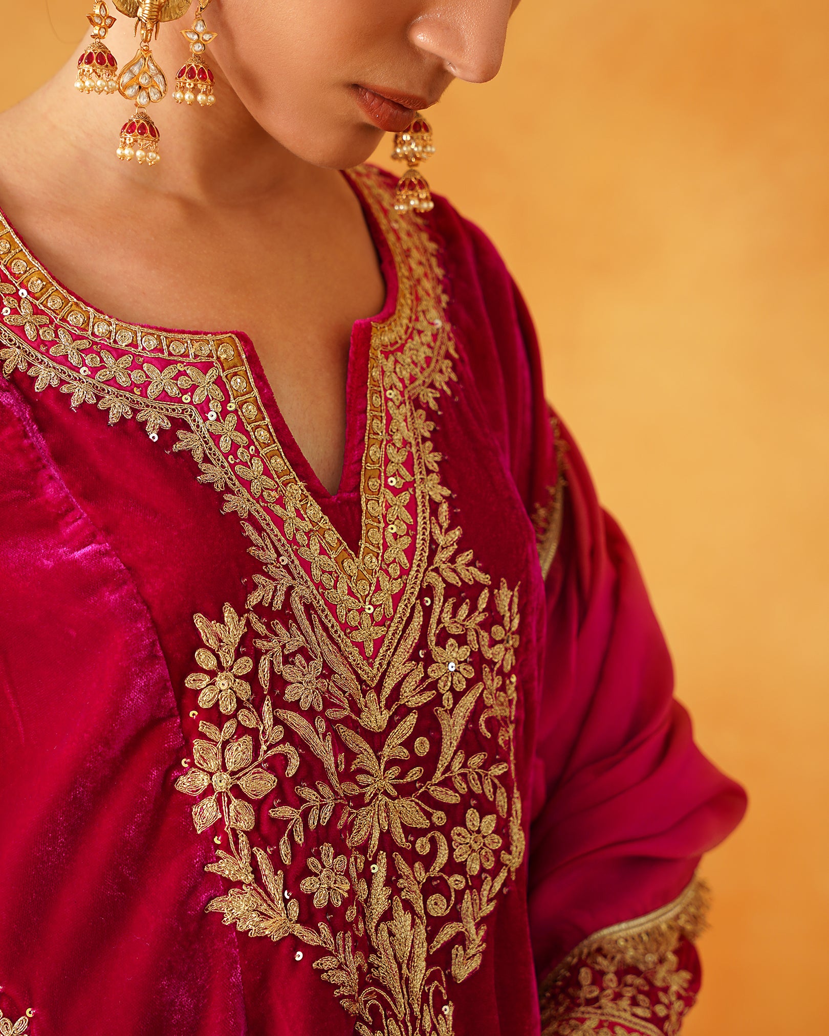 Magenta Pink Hand Embroidered Kurta with Palazzo and Dupatta Set
