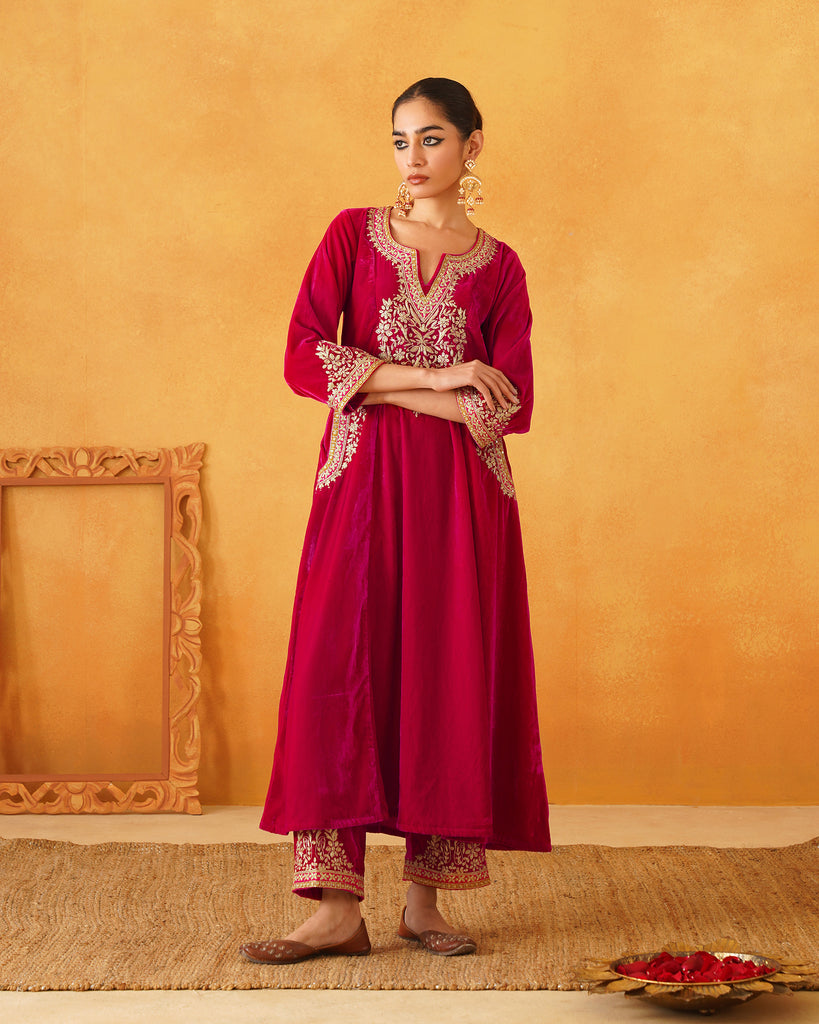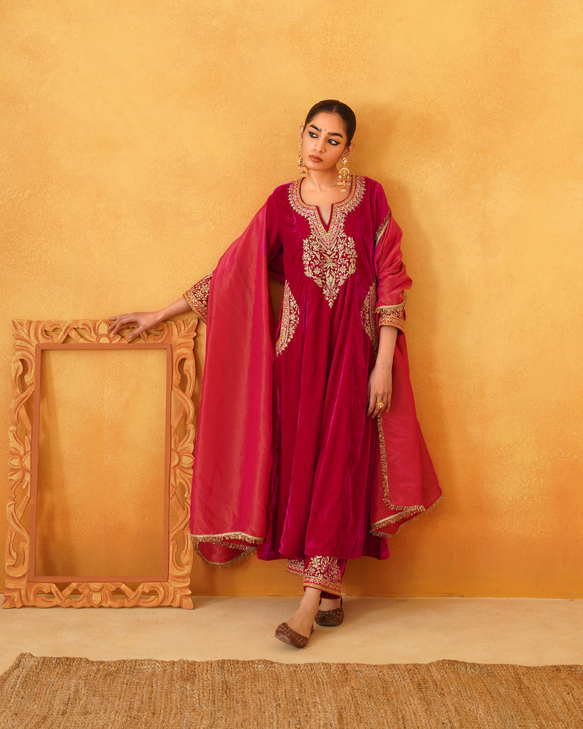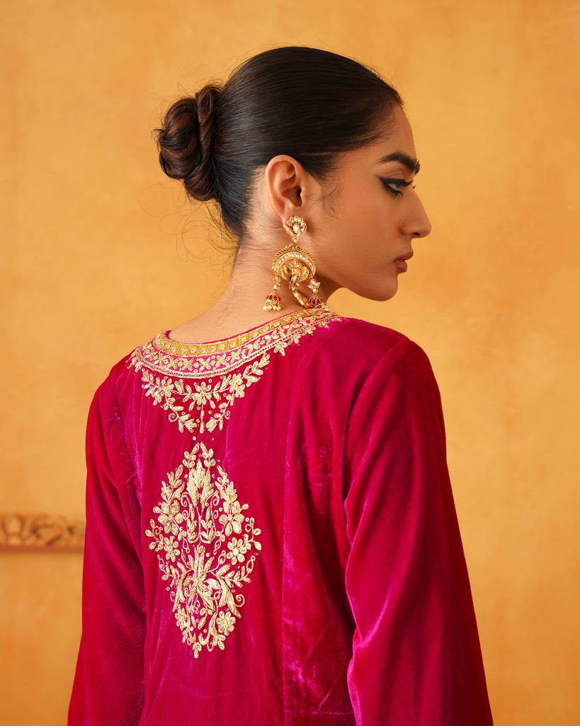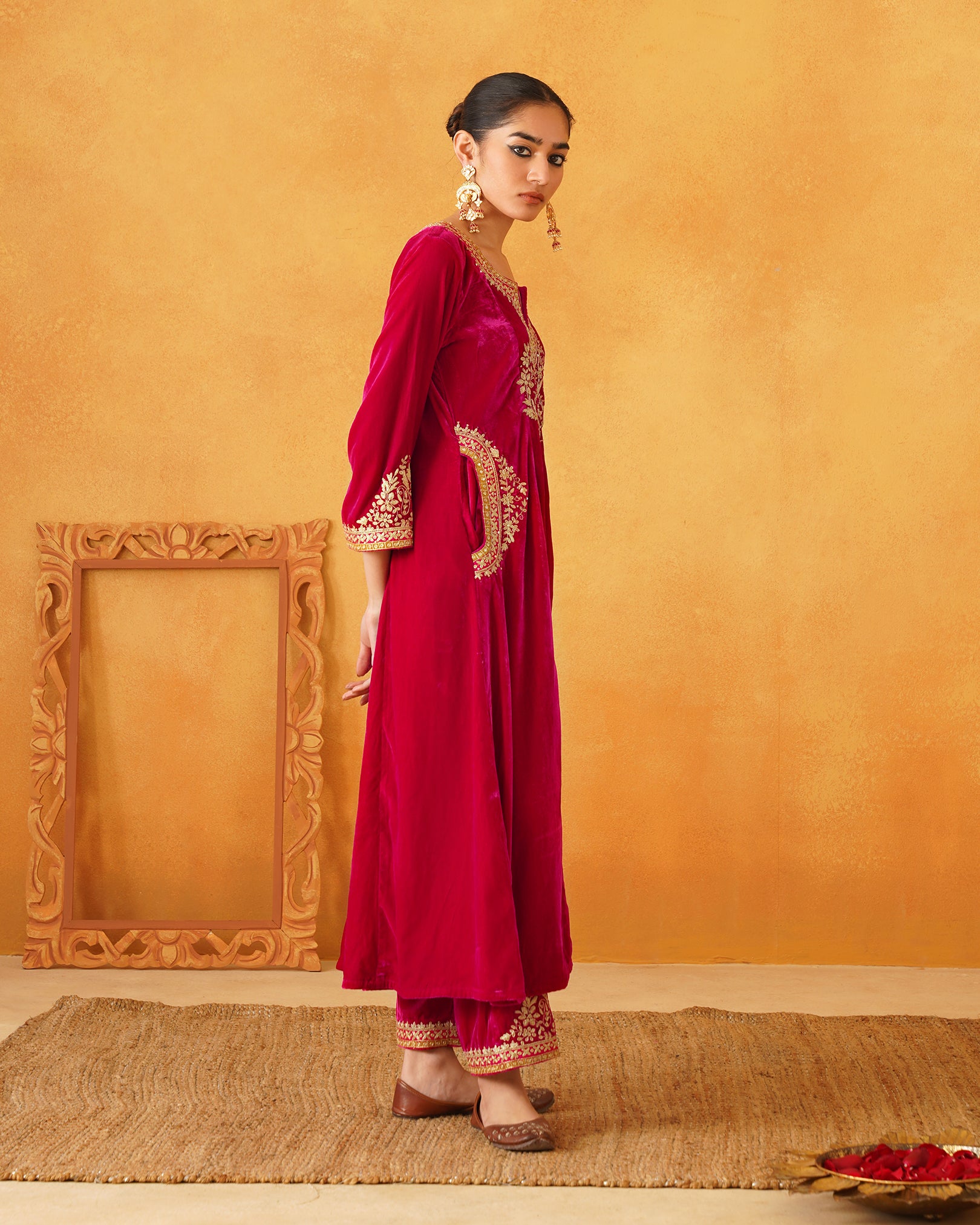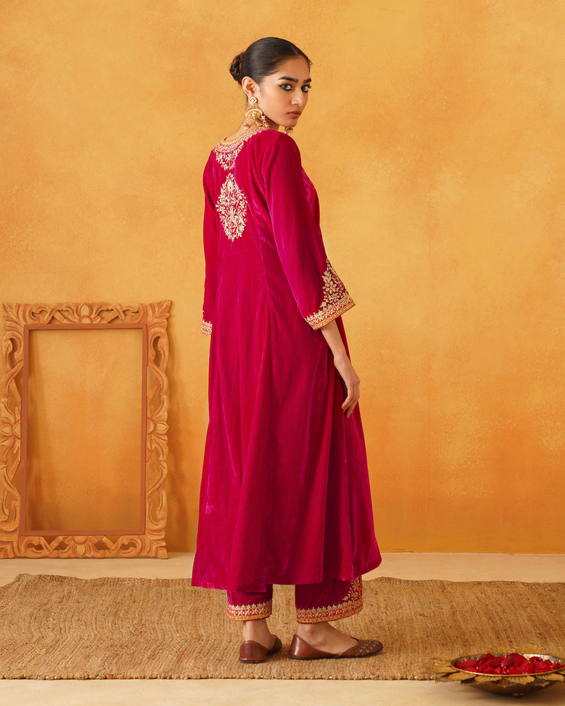 Magenta Pink Hand Embroidered Kurta with Palazzo and Dupatta Set