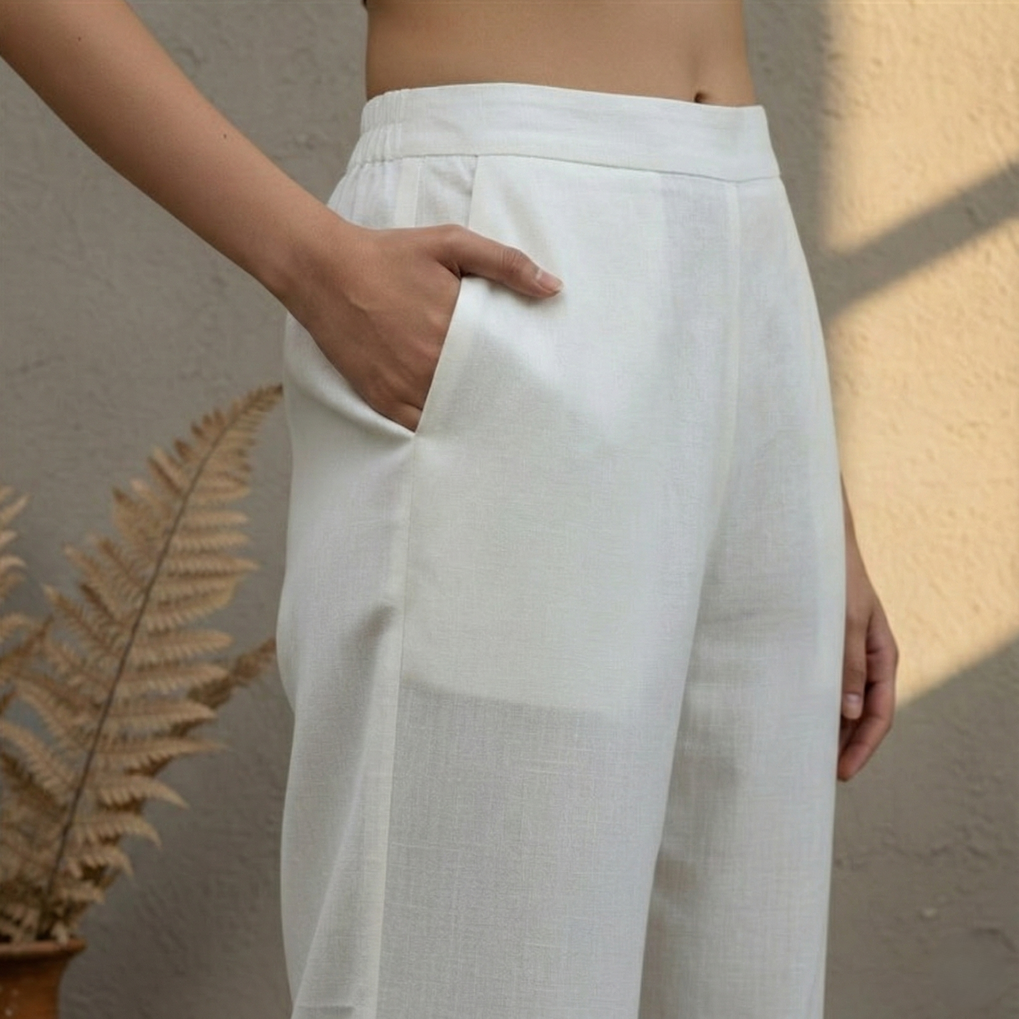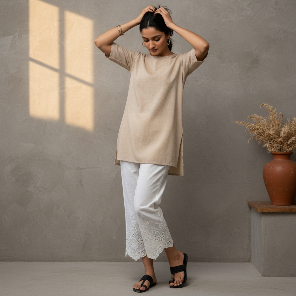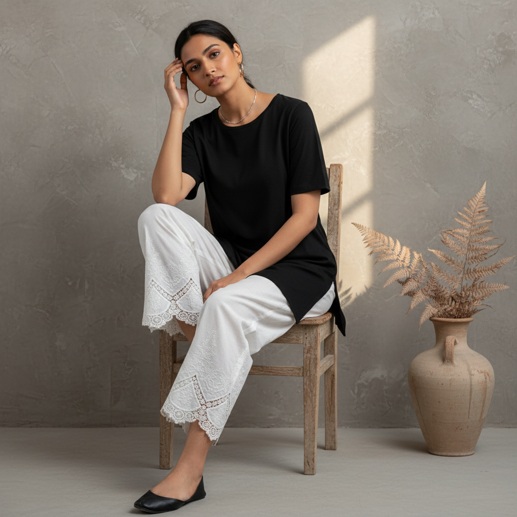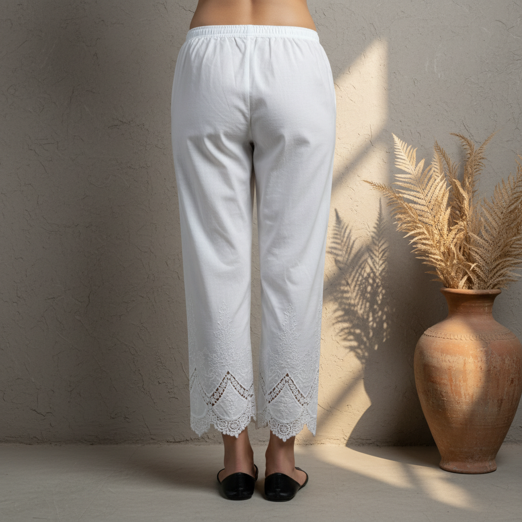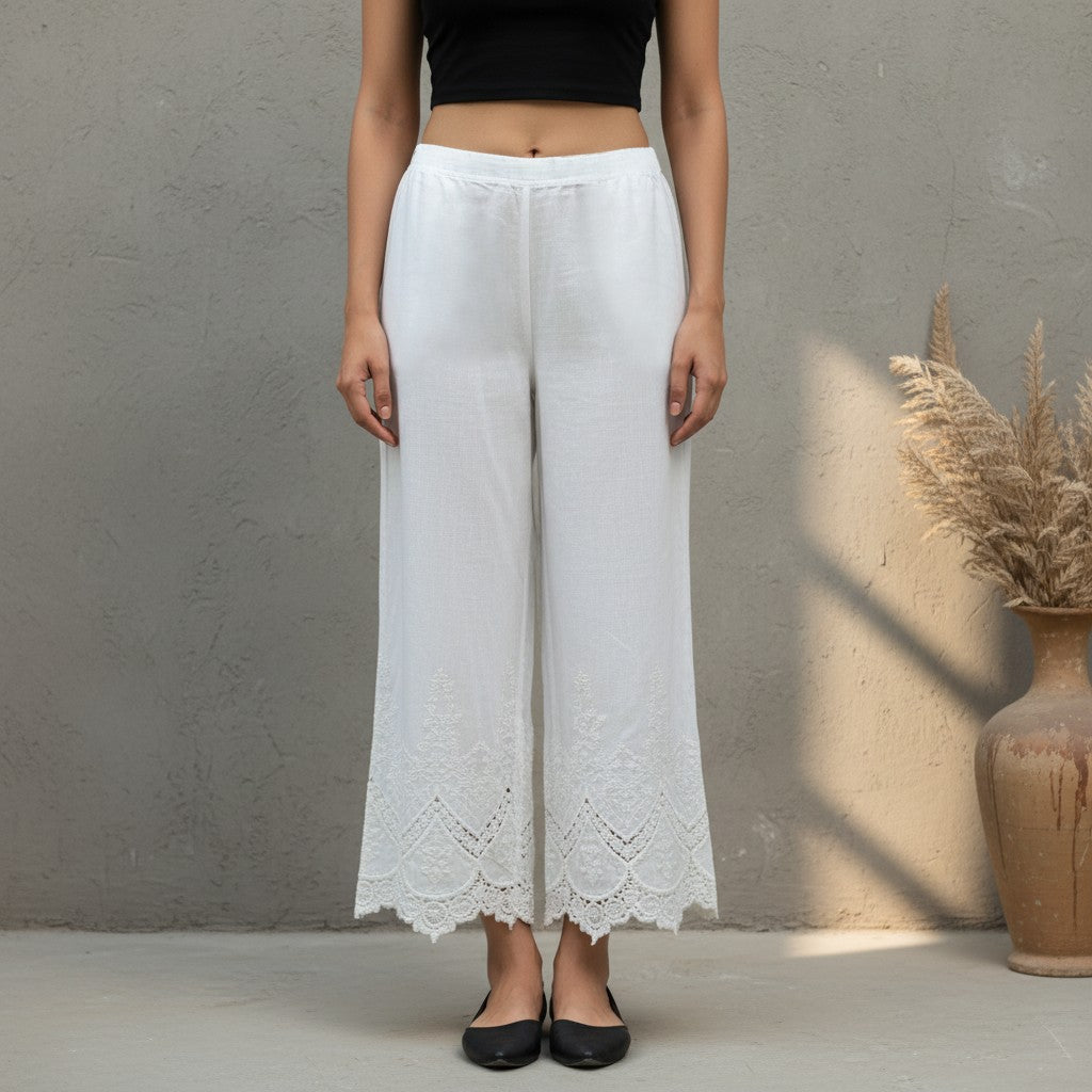 • White Embroidered Cotton Palazzo Premium cotton palazzo with delicate embroidery work. Wide-leg silhouette offers comfort and grace for everyday wear or special occasions. Versatile piece that pairs effortlessly with kurtas or layered styling. Timeless design in classic White.