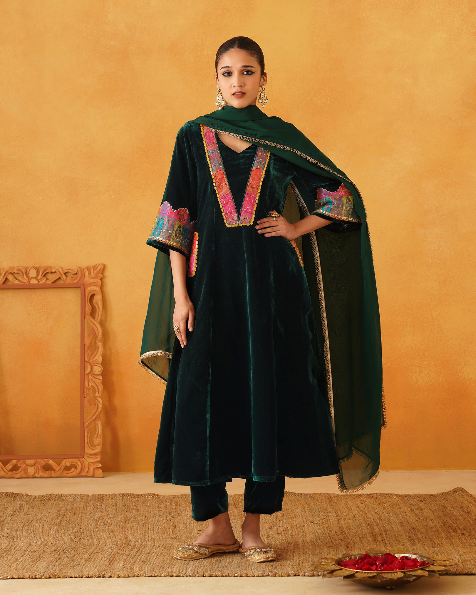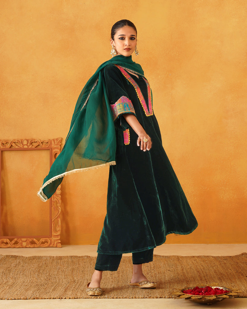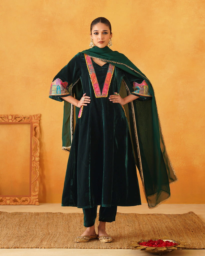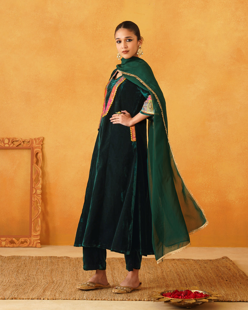Bottle Green Velvet Kurta With Palazzo & Dupatta Set