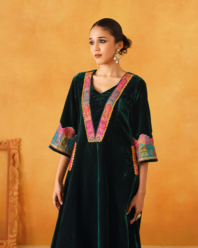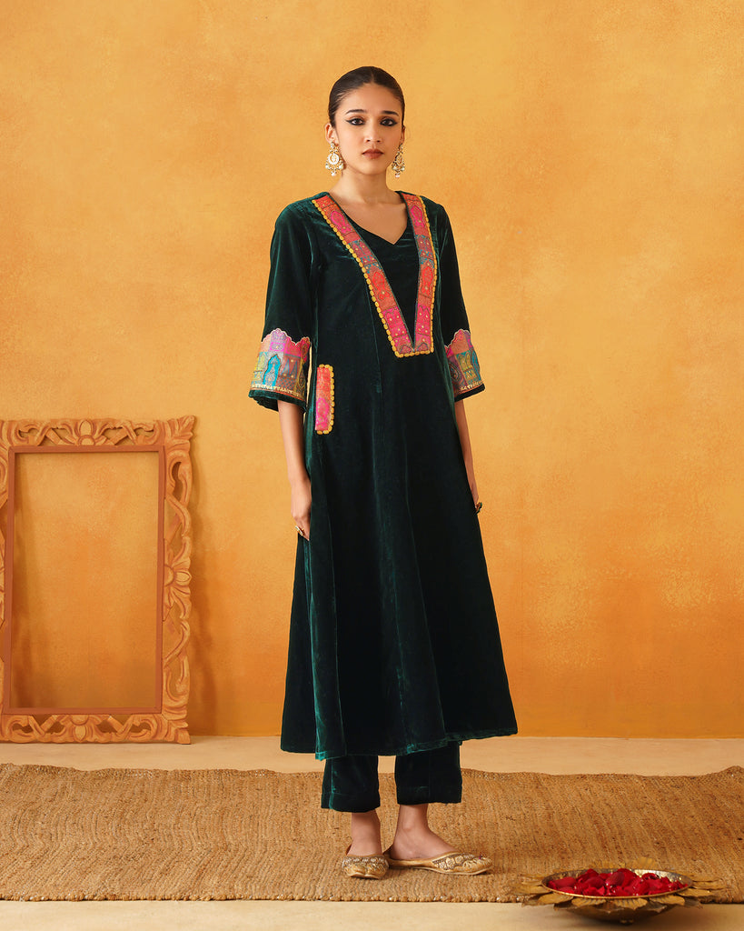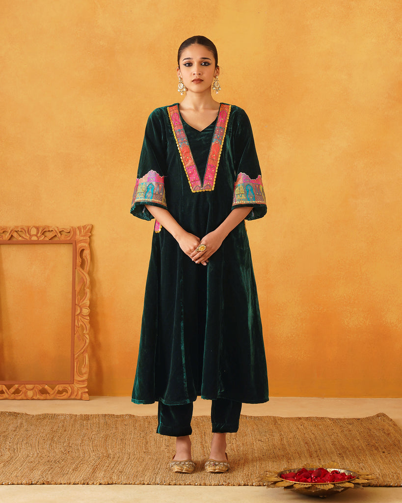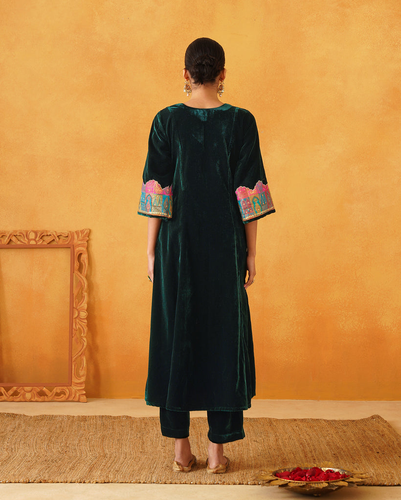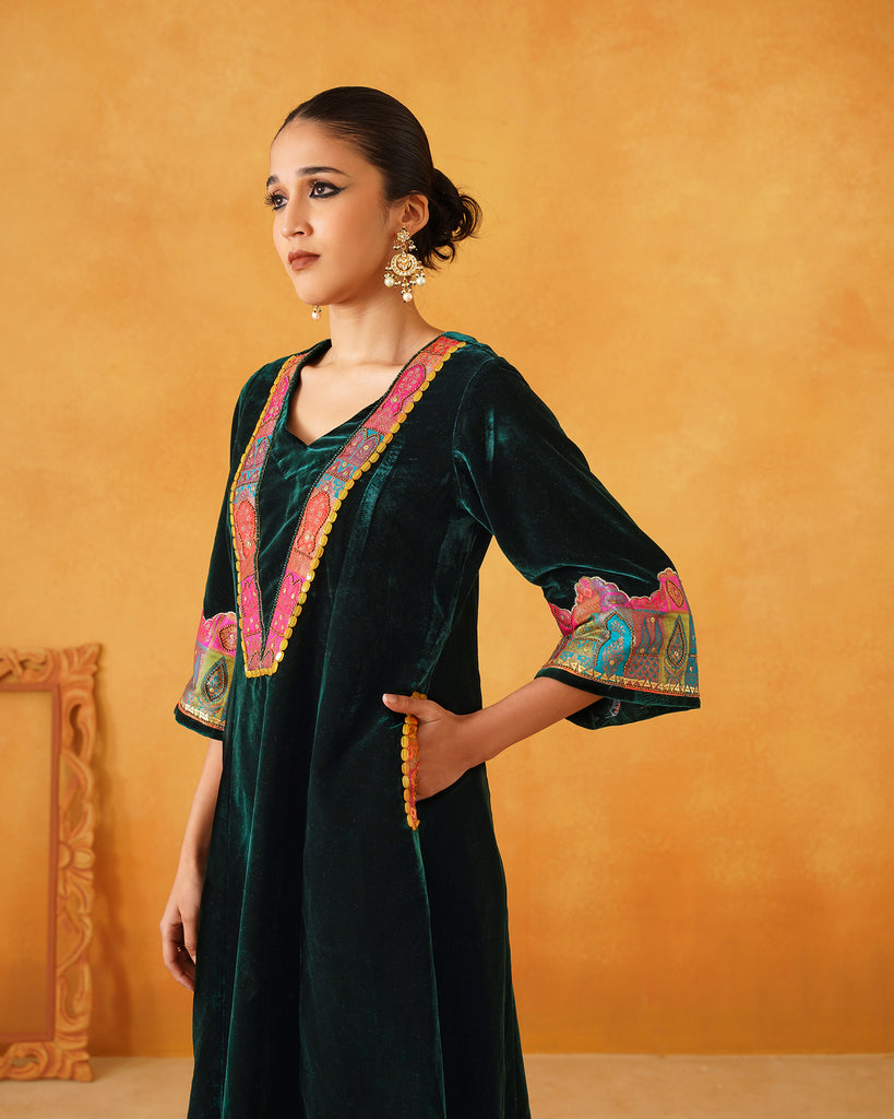 Bottle Green Velvet Kurta With Palazzo & Dupatta Set
