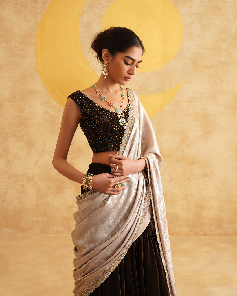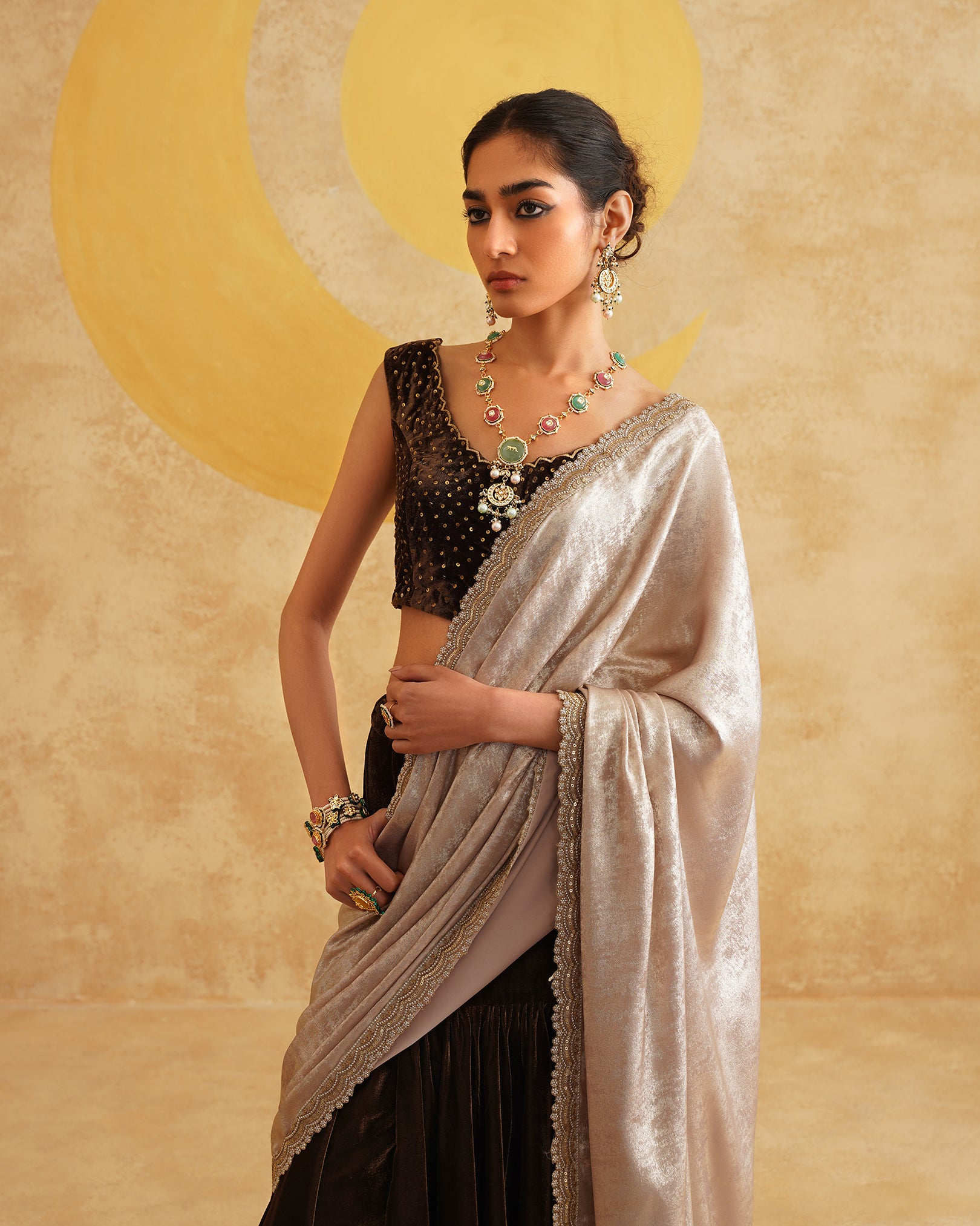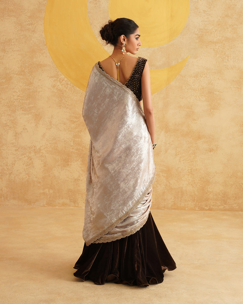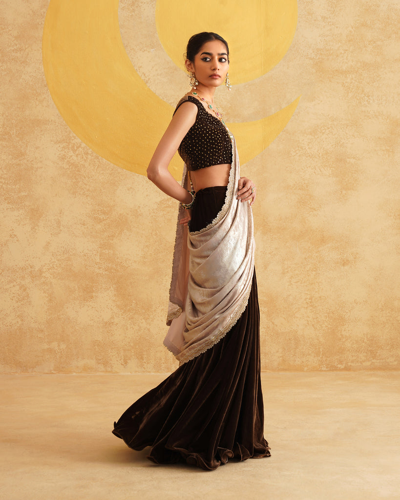 Dark Brown Ready To Wear Drape Saree With Velvet Blouse