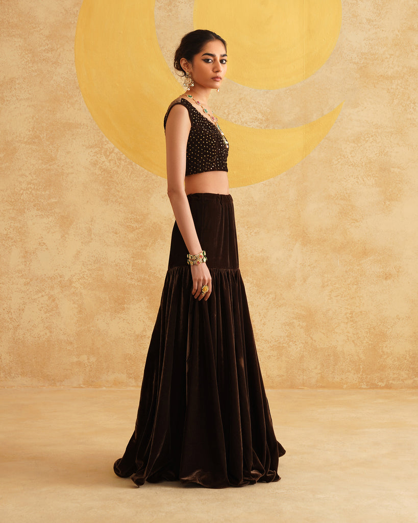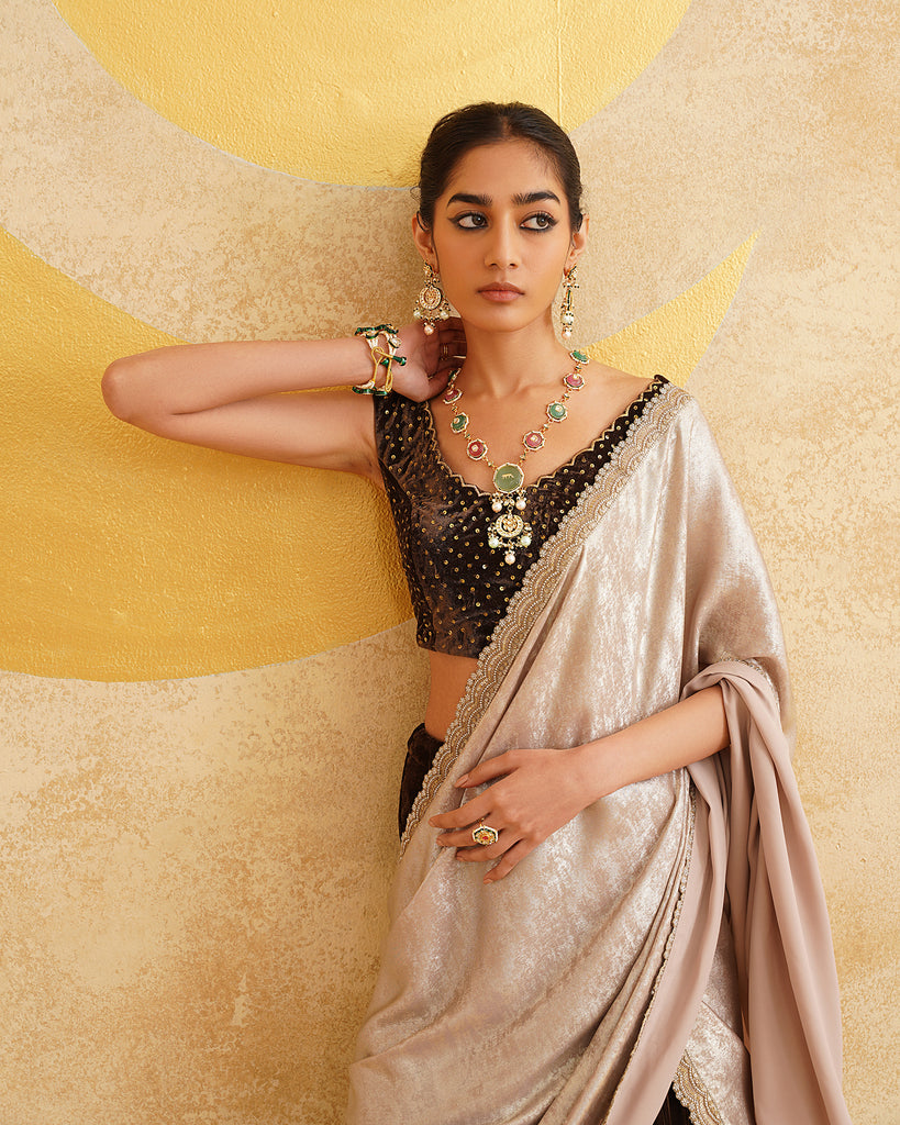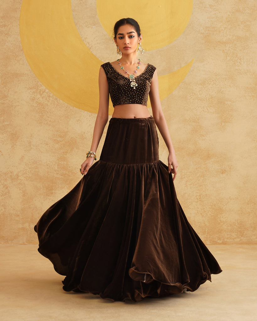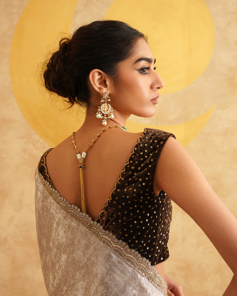 Dark Brown Ready To Wear Drape Saree With Velvet Blouse