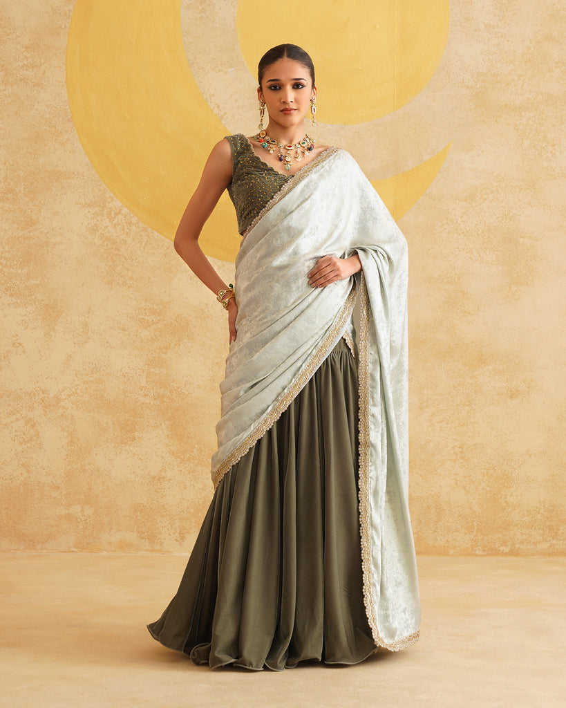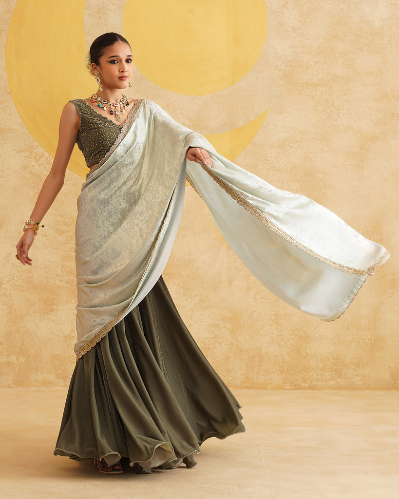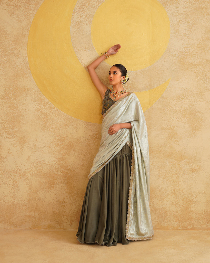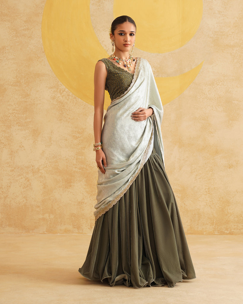 Sage Grey Ready To Wear Drape Saree With Velvet Blouse