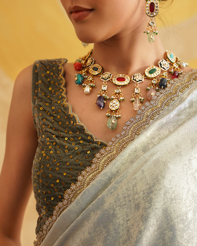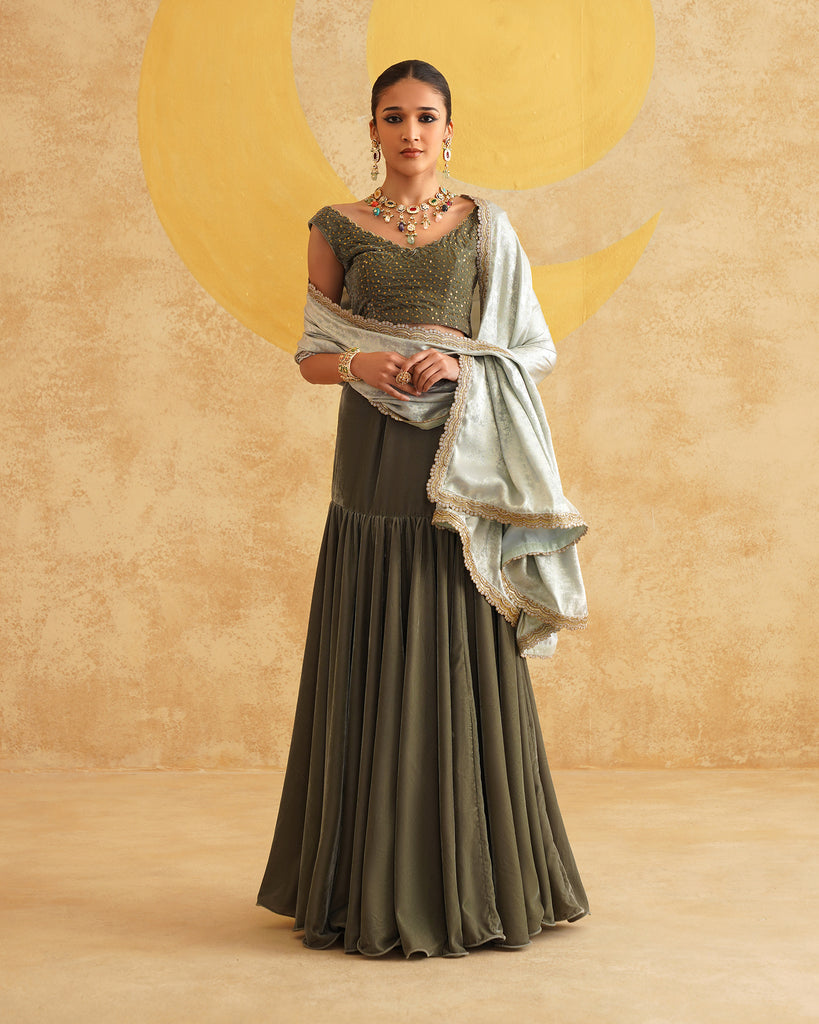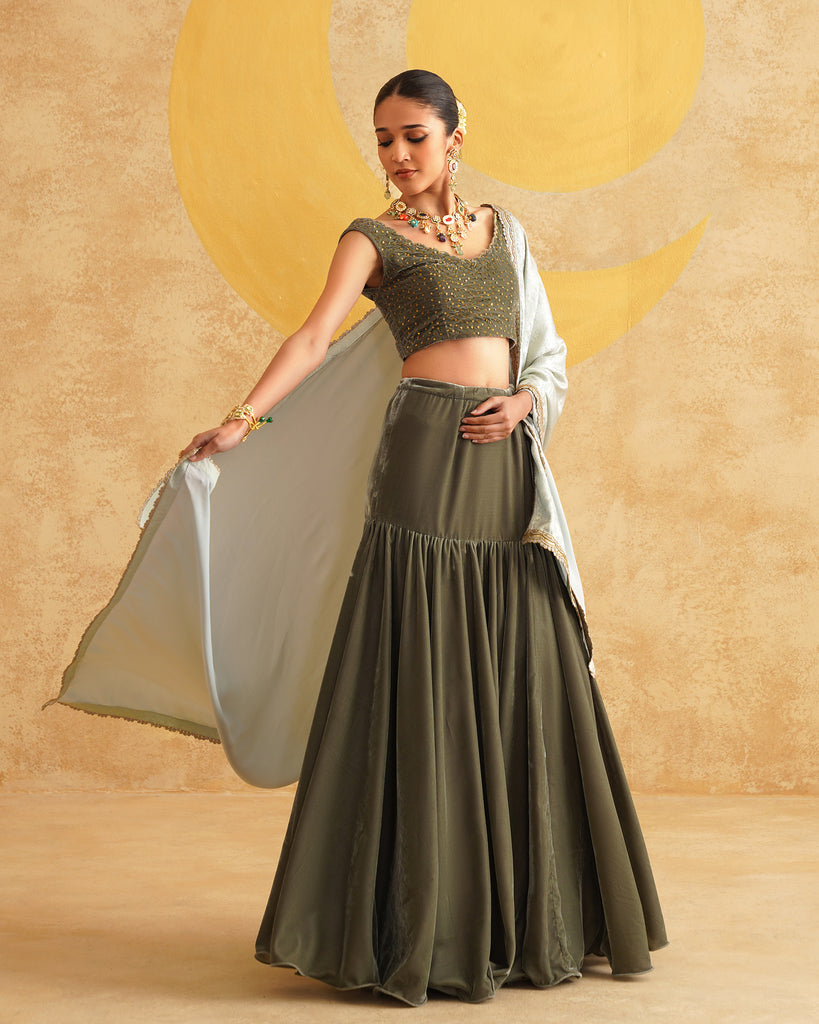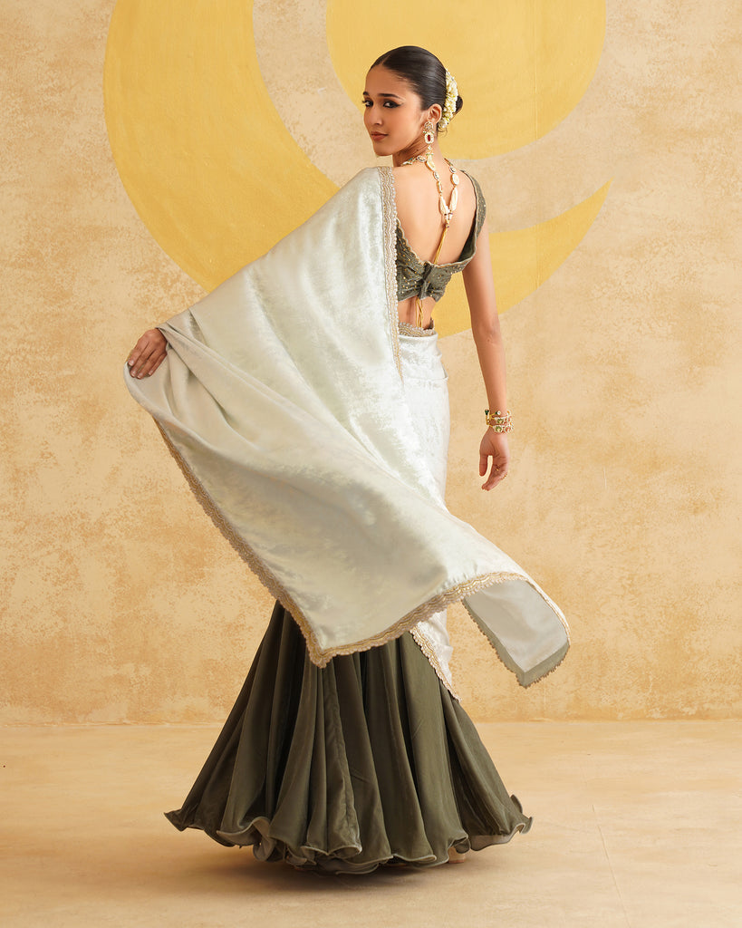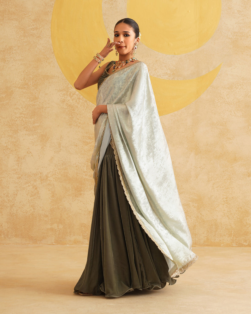 Sage Grey Ready To Wear Drape Saree With Velvet Blouse
