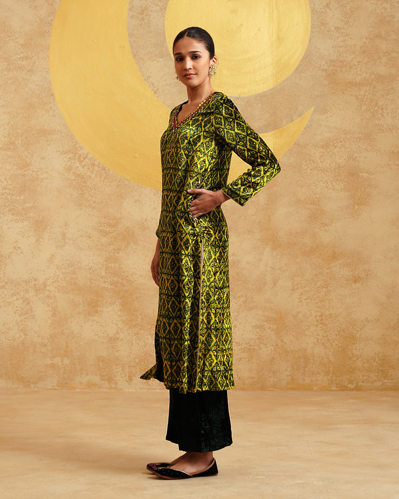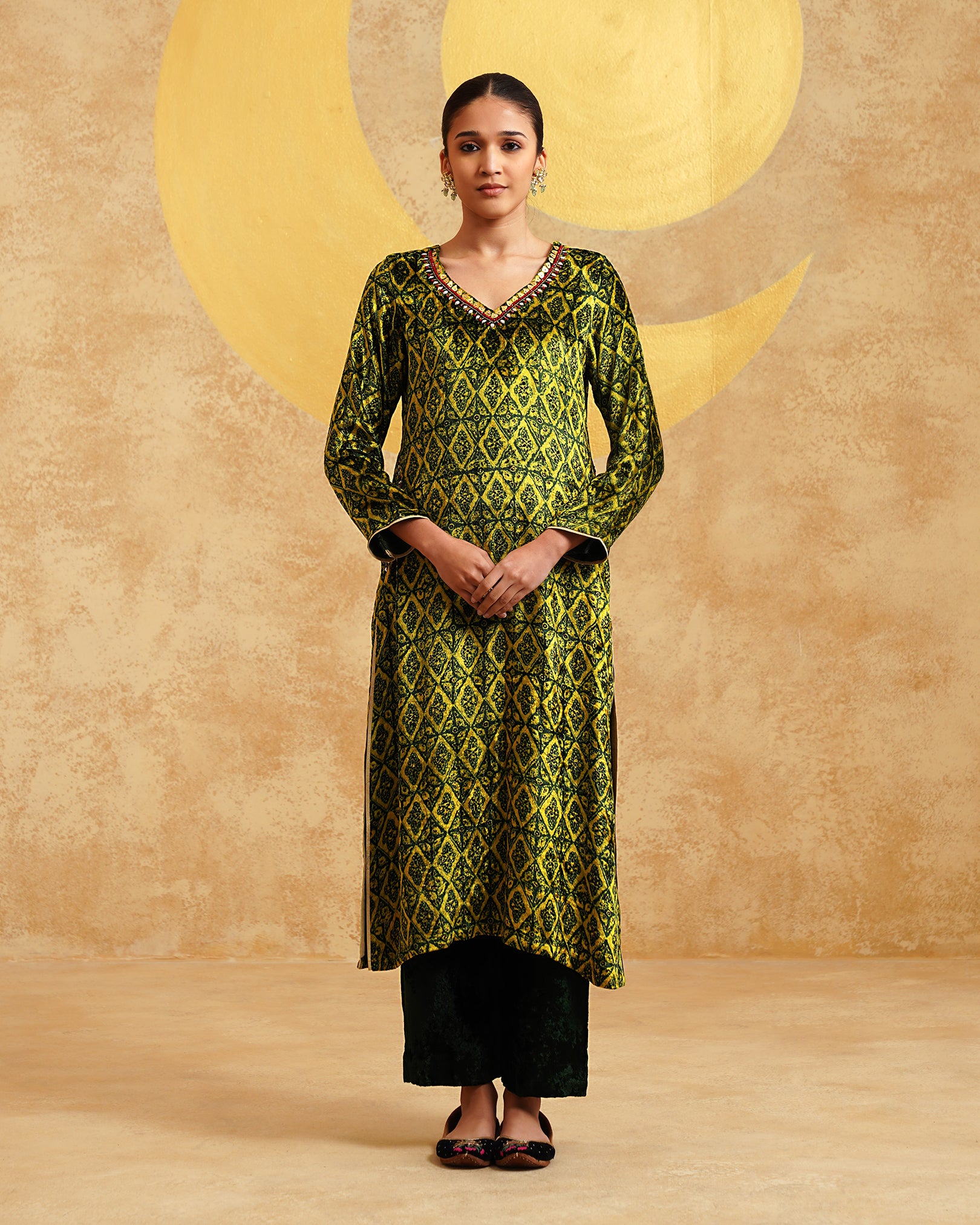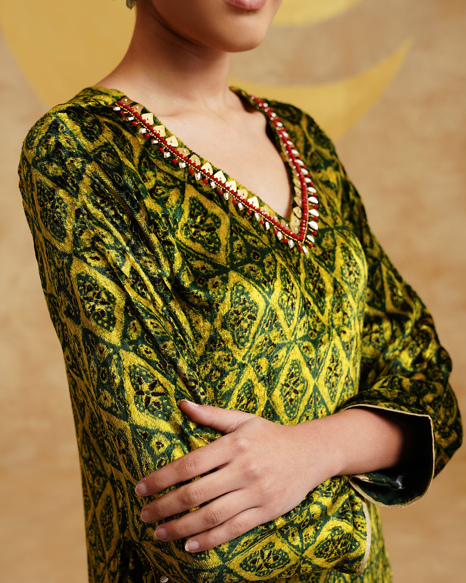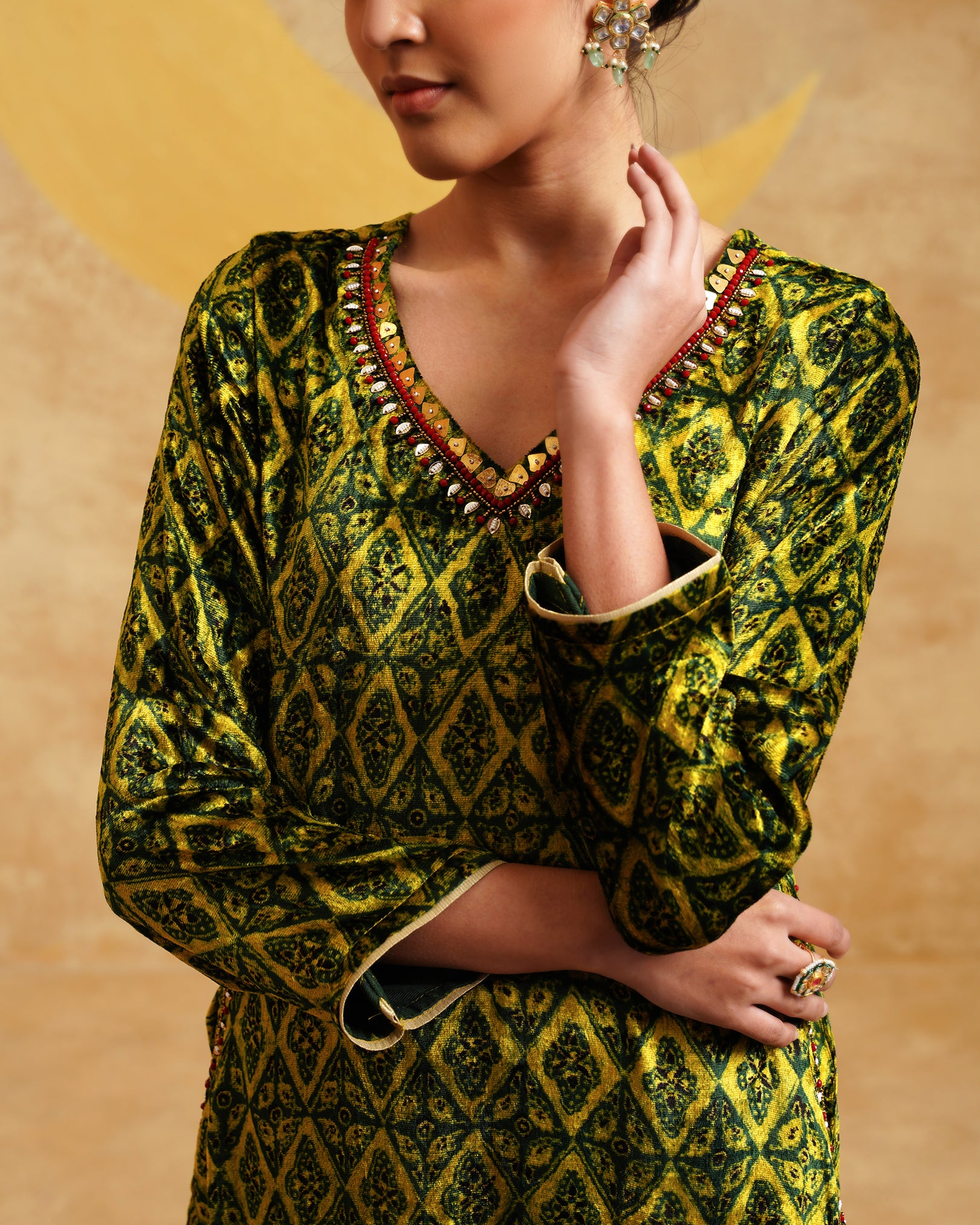 Parrot Green Ajrakh Handblock Soft Velvet Kurta & Palazzo Set