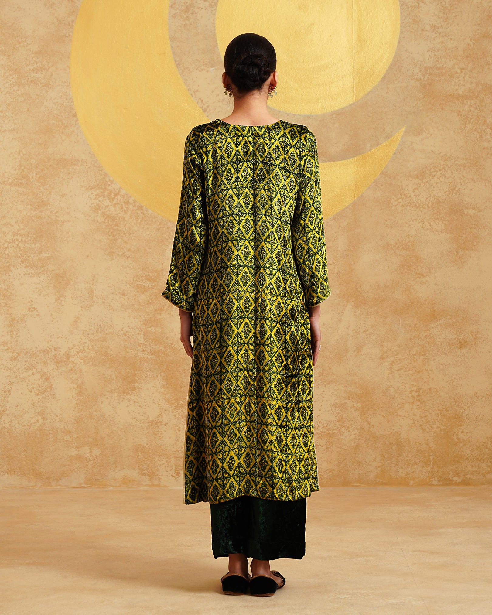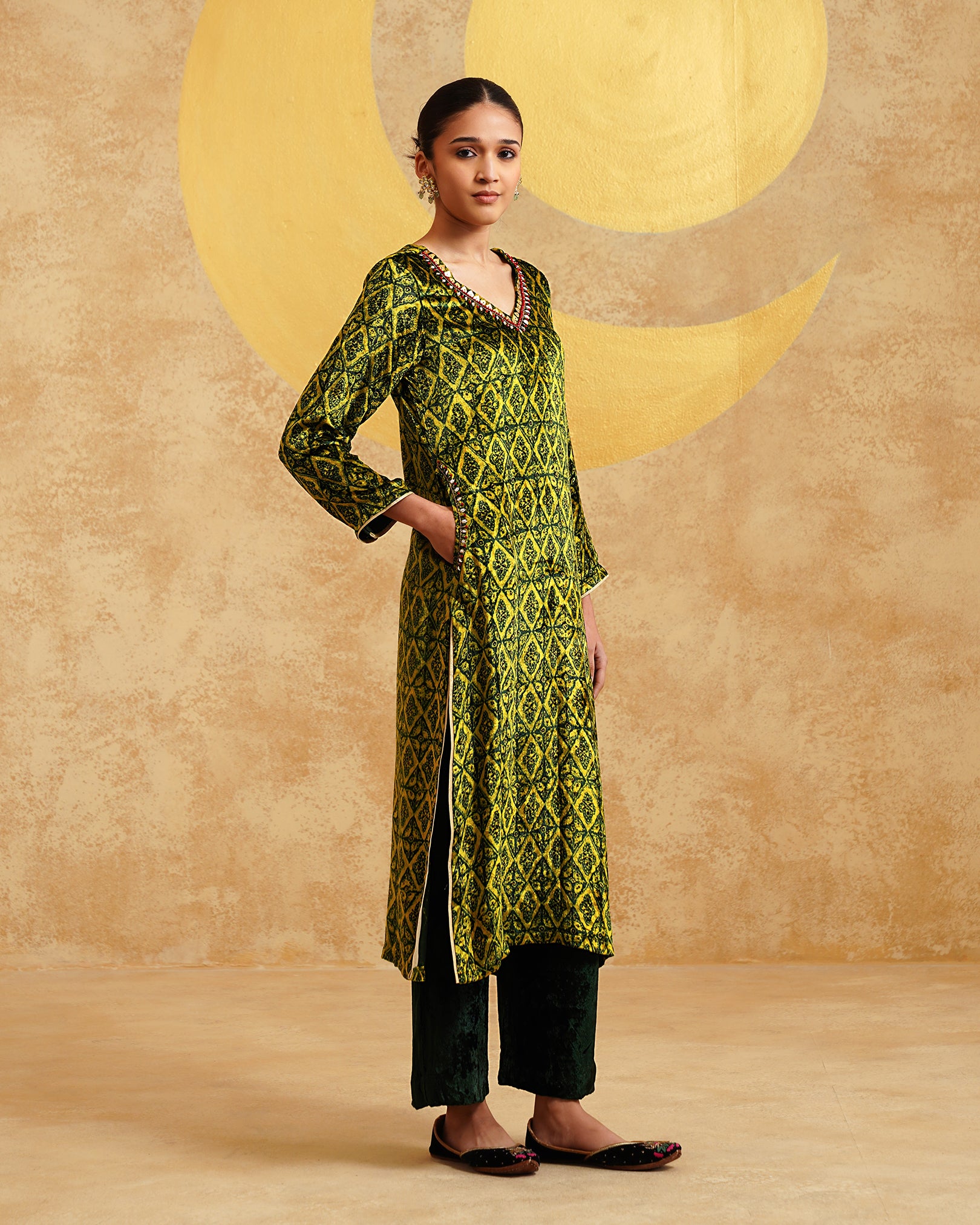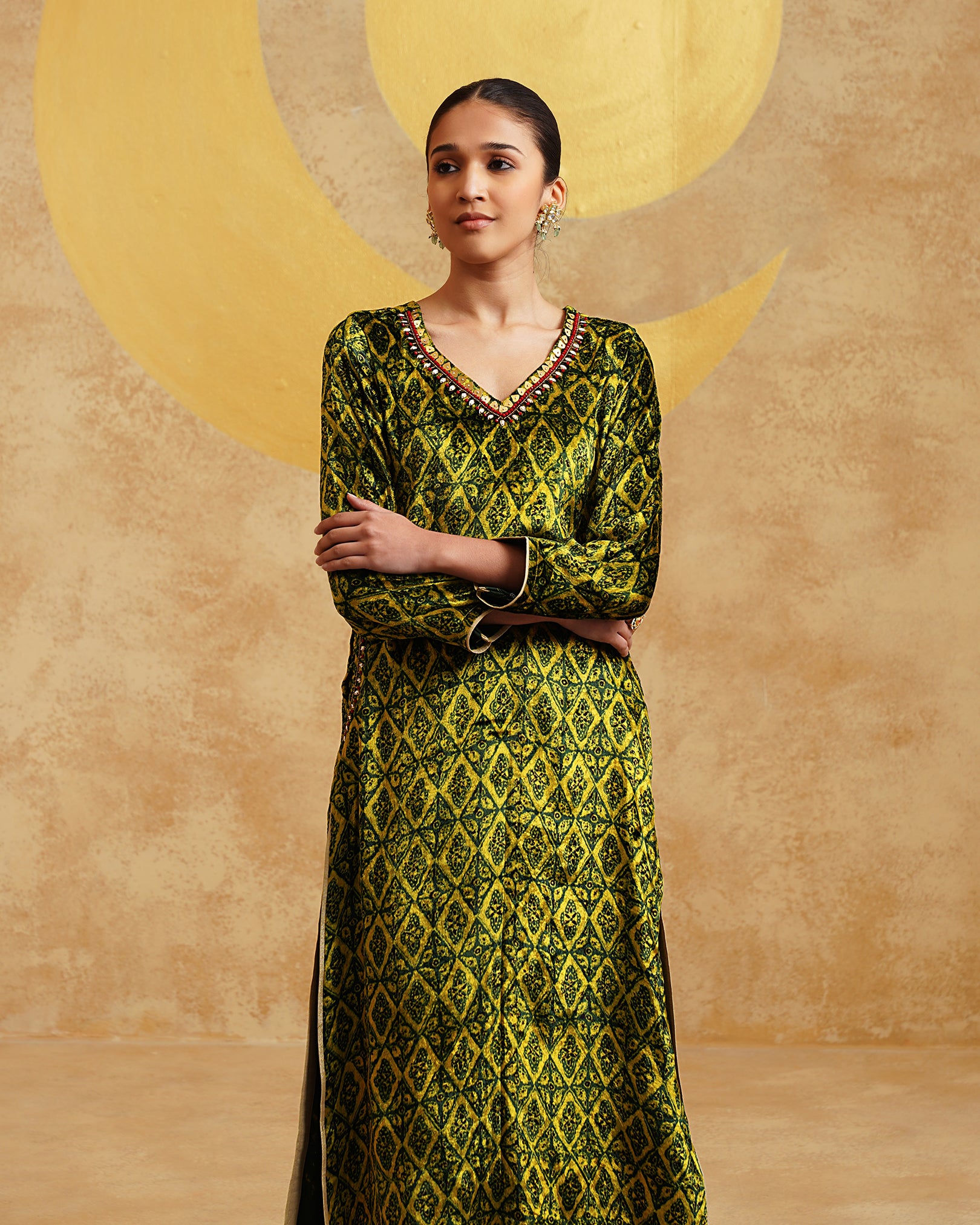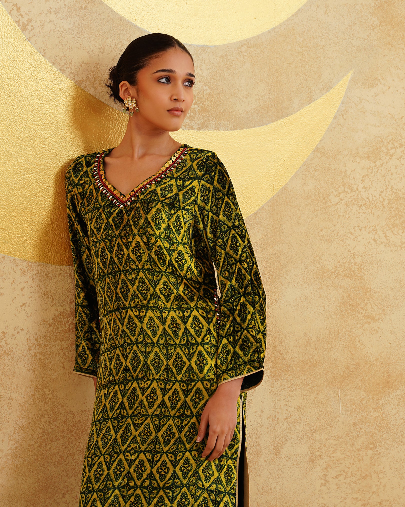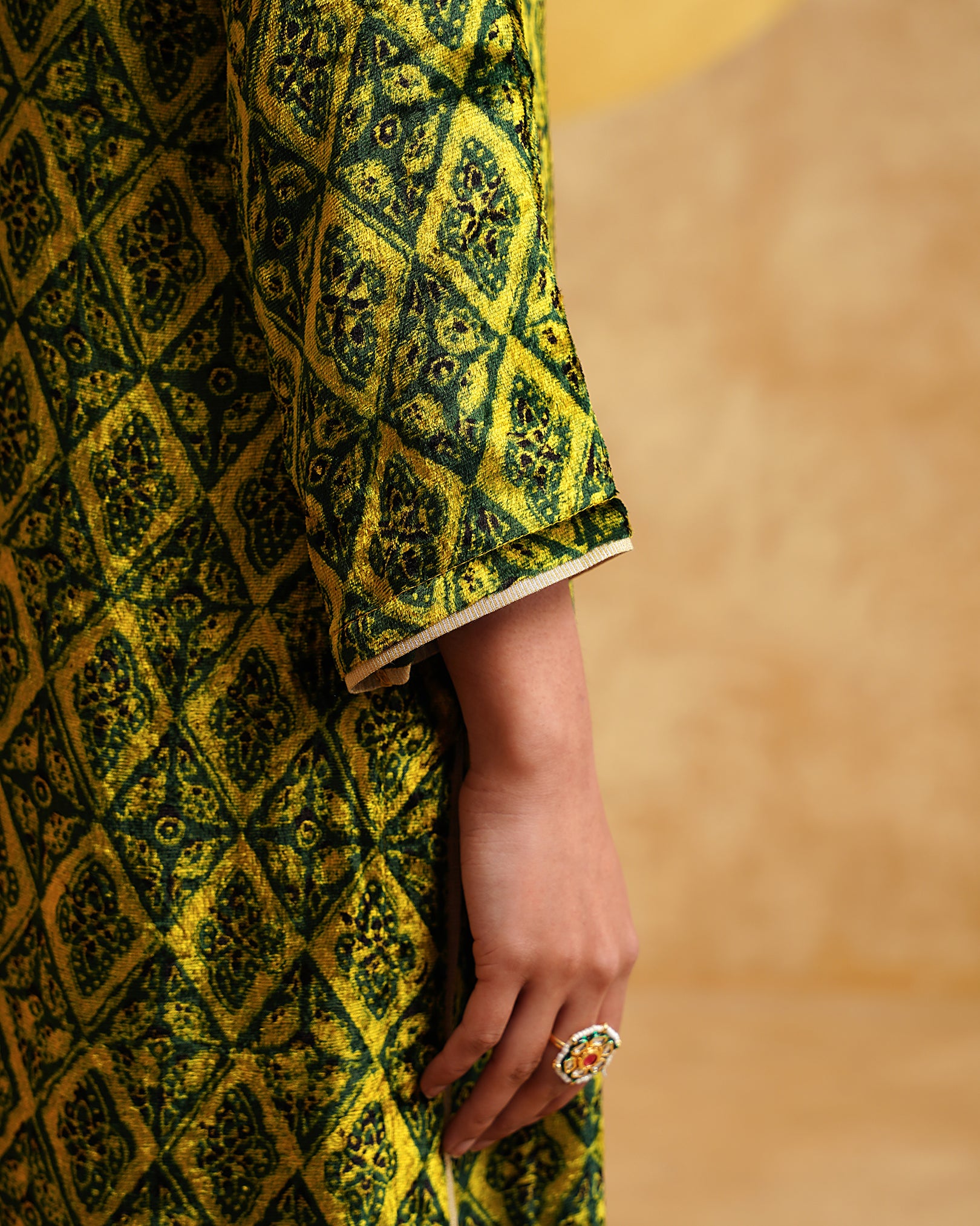 Parrot Green Ajrakh Handblock Soft Velvet Kurta & Palazzo Set