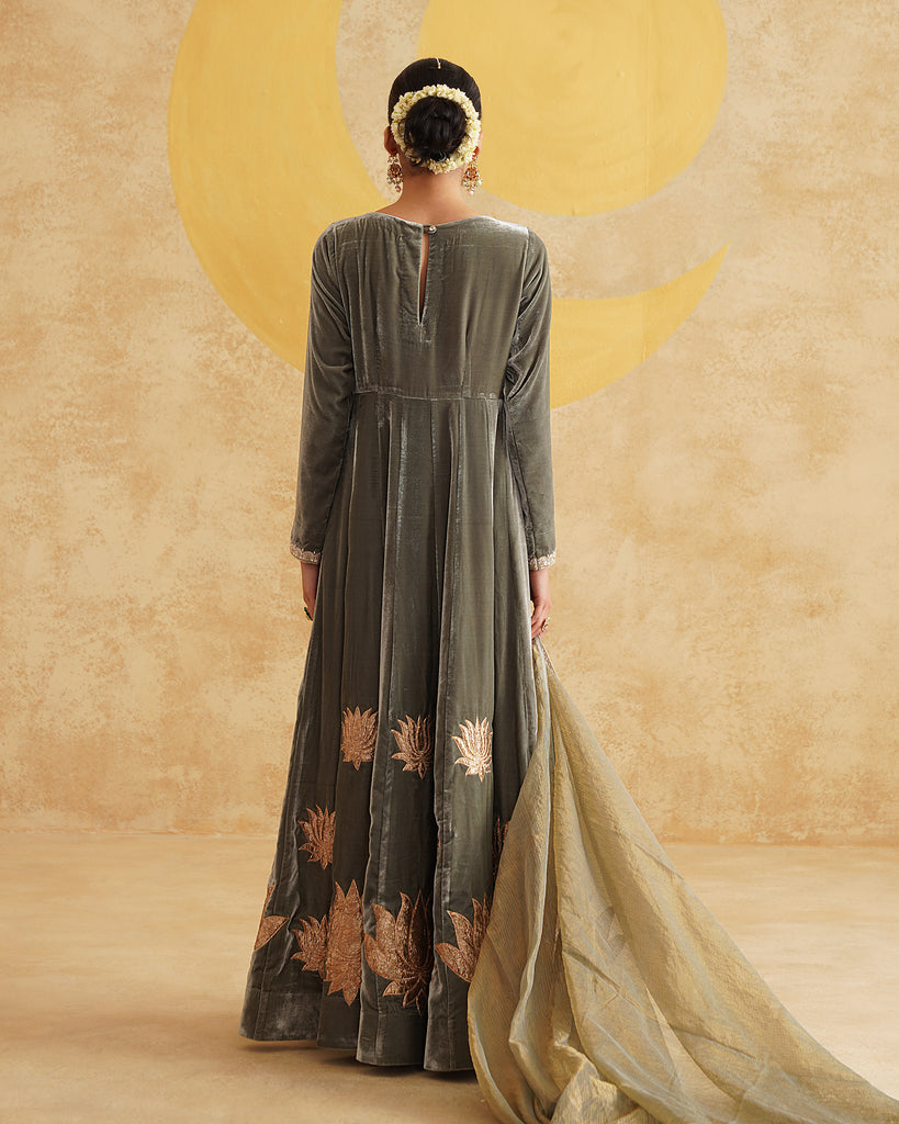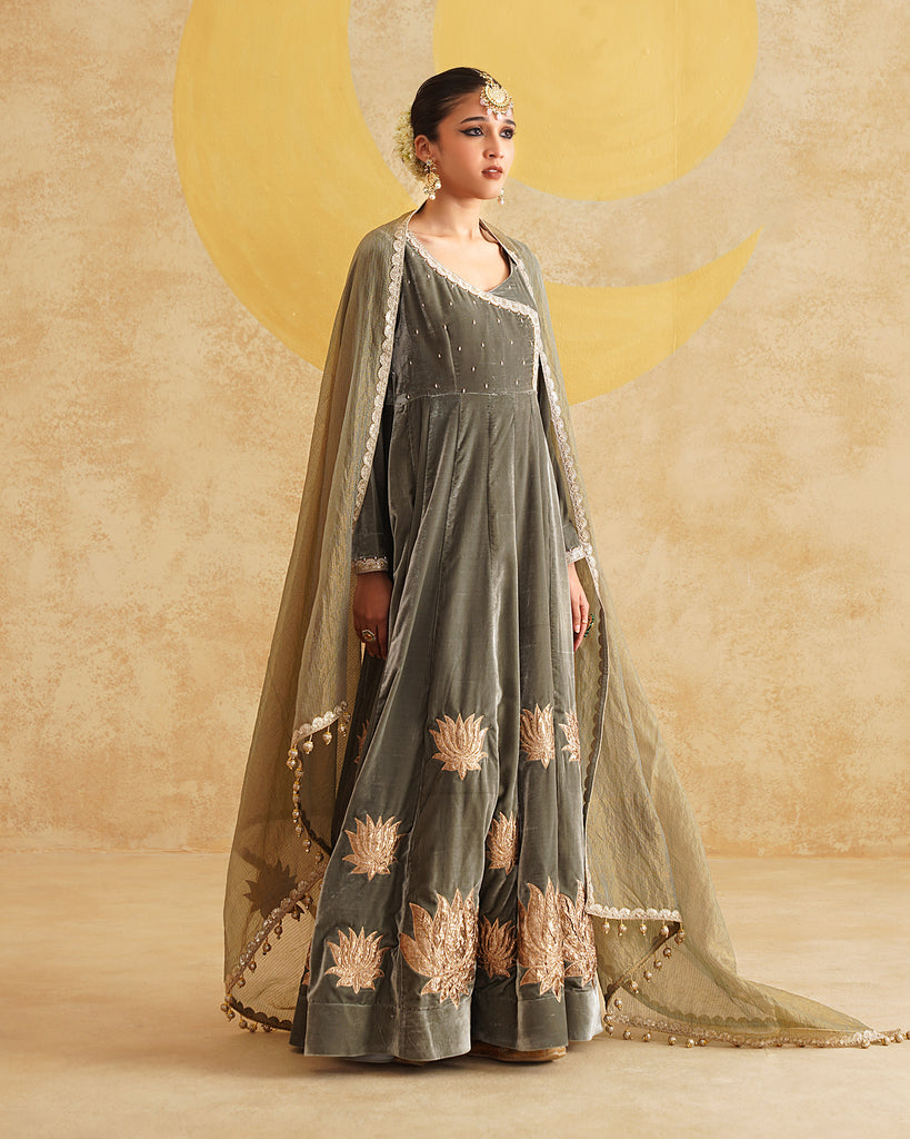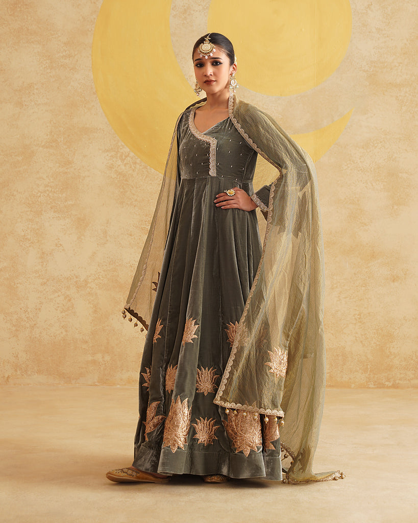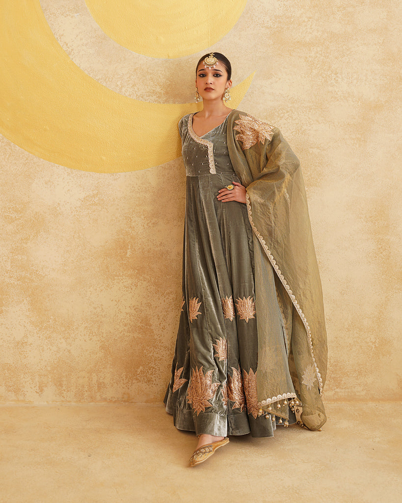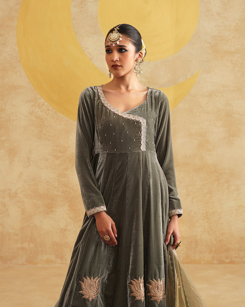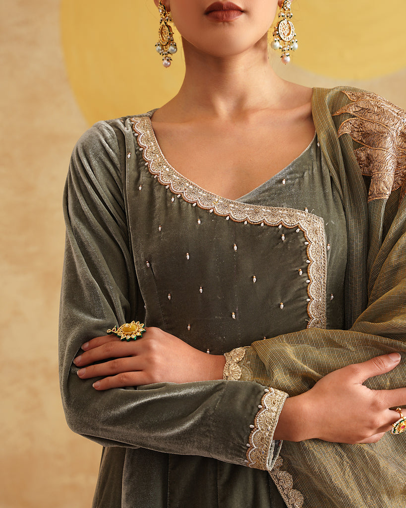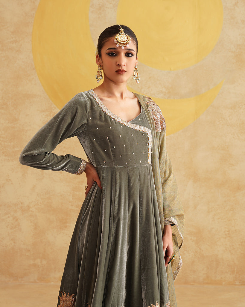 Sage Grey Hand Embroidered Velvet Anarkali And Dupatta Set